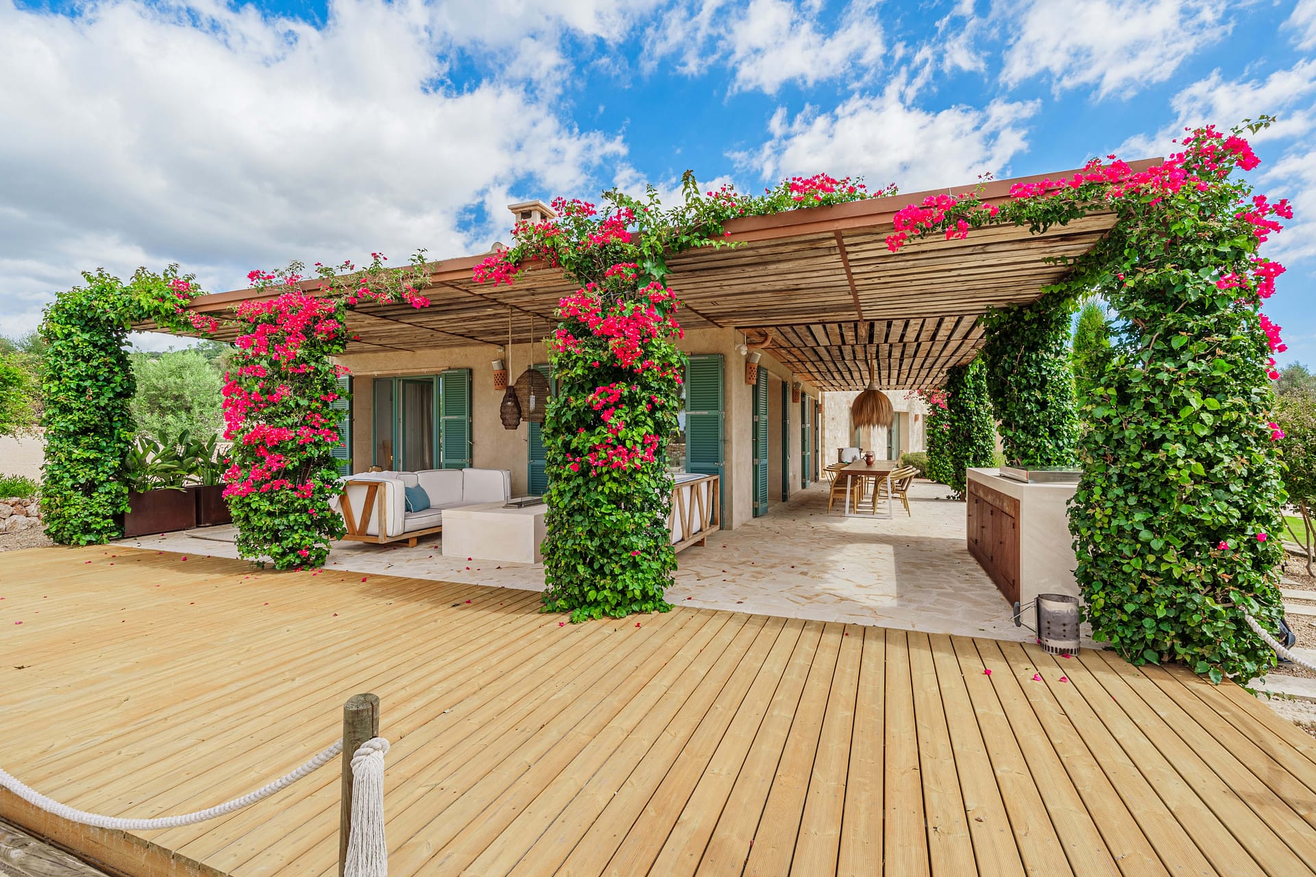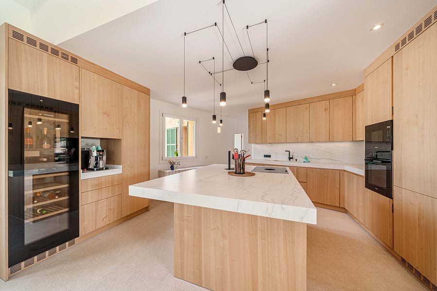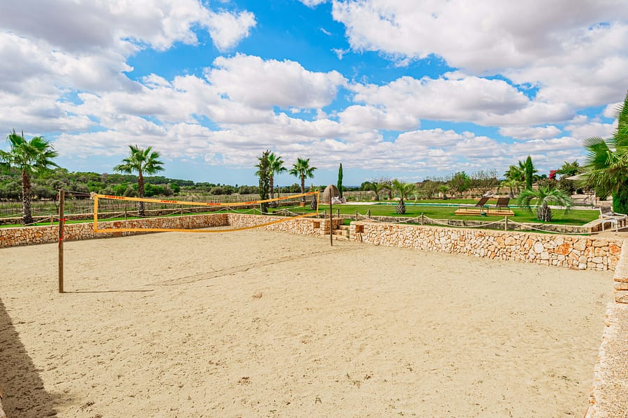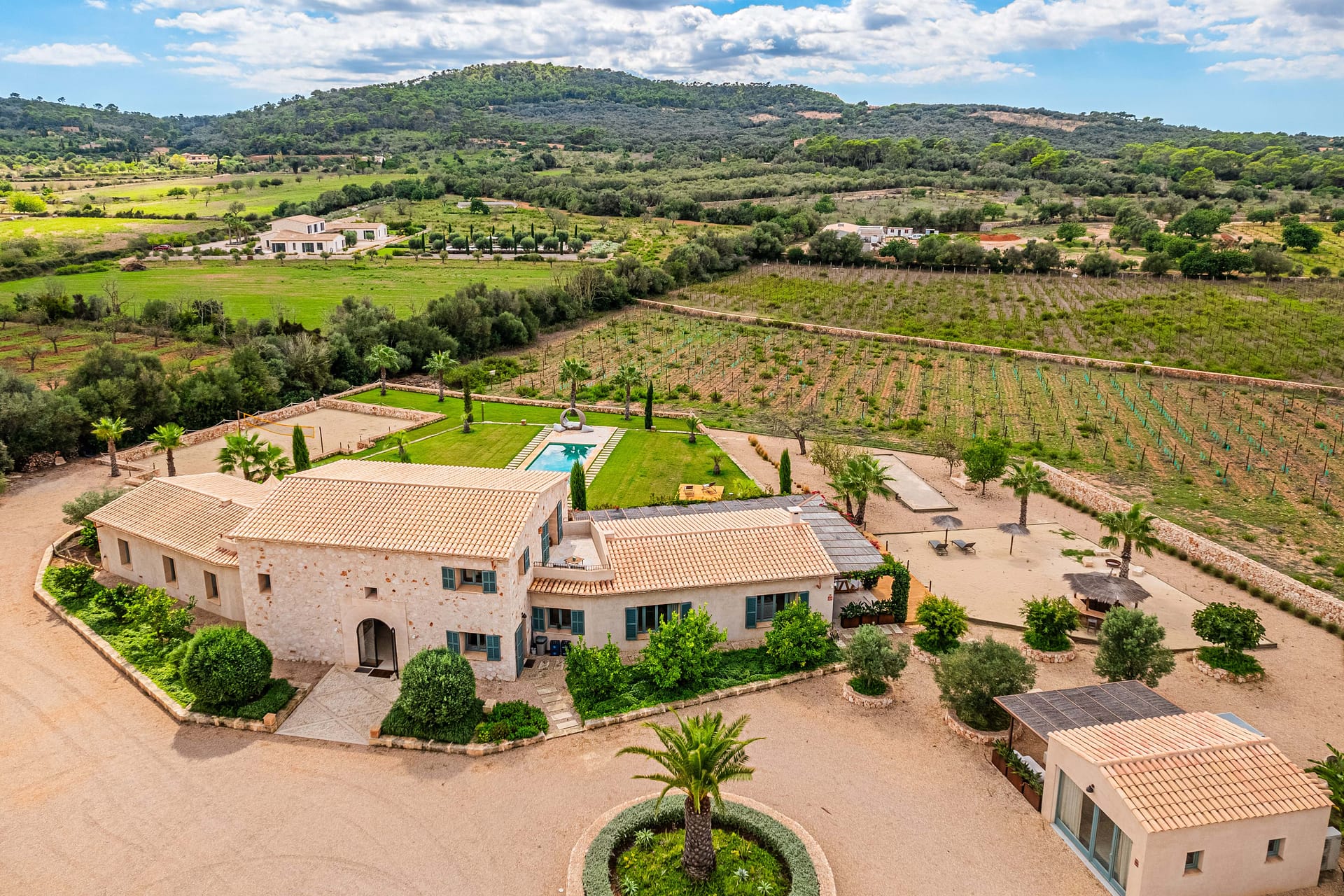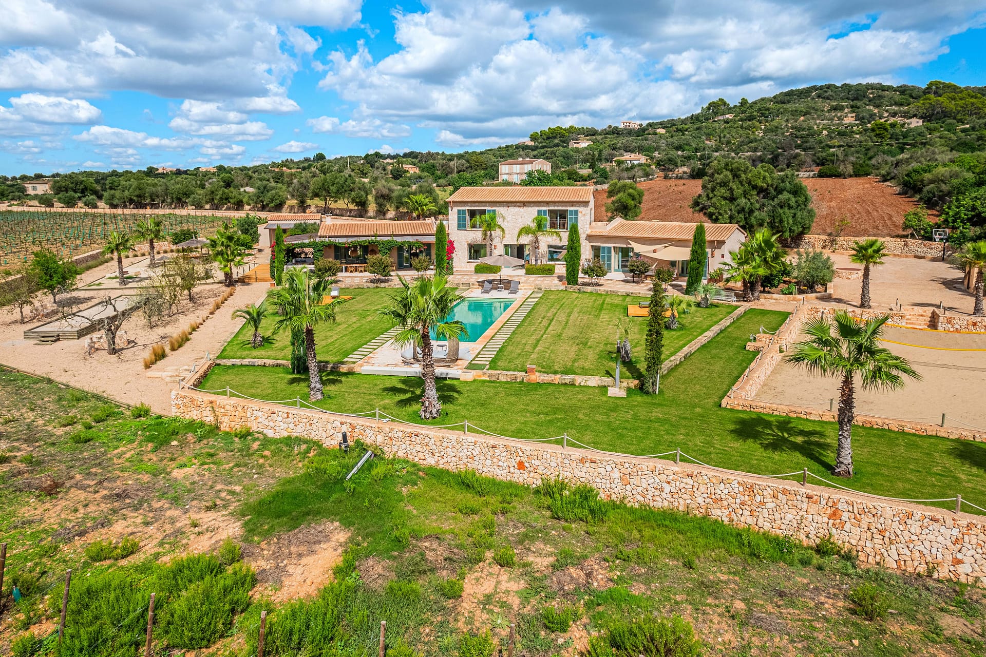 This timeless finca is located between Santanyi and Felanitx on a plot of almost 30,000 m and is embedded in a great mountain panorama in front of Cas Concos. A prestigious driveway lined with old olives leads you past the olive plantation and the 14,000 m vineyard to the charming finca built in 2019. It captivates with its successful combination of modern ambience and Mediterranean flair. The house is divided into three parts – on the ground floor of the main house there is a living room with a cinema projector and a cosy sofa area with direct access to the pool and garden. On the upper floor of the main house there is the master area with a large bedroom and two roof terraces. From here you can enjoy a magnificent view of the huge pool area as well as the beautiful Mediterranean garden and vineyards. The left wing of the house is ideal for guests, as there are three guest bedrooms, each with its own en suite bathroom and direct access to its own terrace and pool. The right wing of the house is dedicated to being together with the family – the open-plan kitchen-living room with practical kitchen island has been equipped with a Bora hob, Miele oven and large wine cooler. Adjacent you will find the modern living room with open fireplace and access to the covered terrace. From the living room you can access the covered terrace and the large 5-metre long wooden table, which easily seats 16 people. From there you can go directly to the pool or the boules court or to the outdoor lounge with bioethanol fireplace. A highlight is the paradisiacal garden, which has a 56 m (14x4m) pool, an olive plantation and an outdoor lounge, as well as various places for rest and relaxation. It is an exceptional haven of exquisite privacy without sacrificing good accessibility. Other features include: a 31m garage, public electricity and own well, underfloor heating.