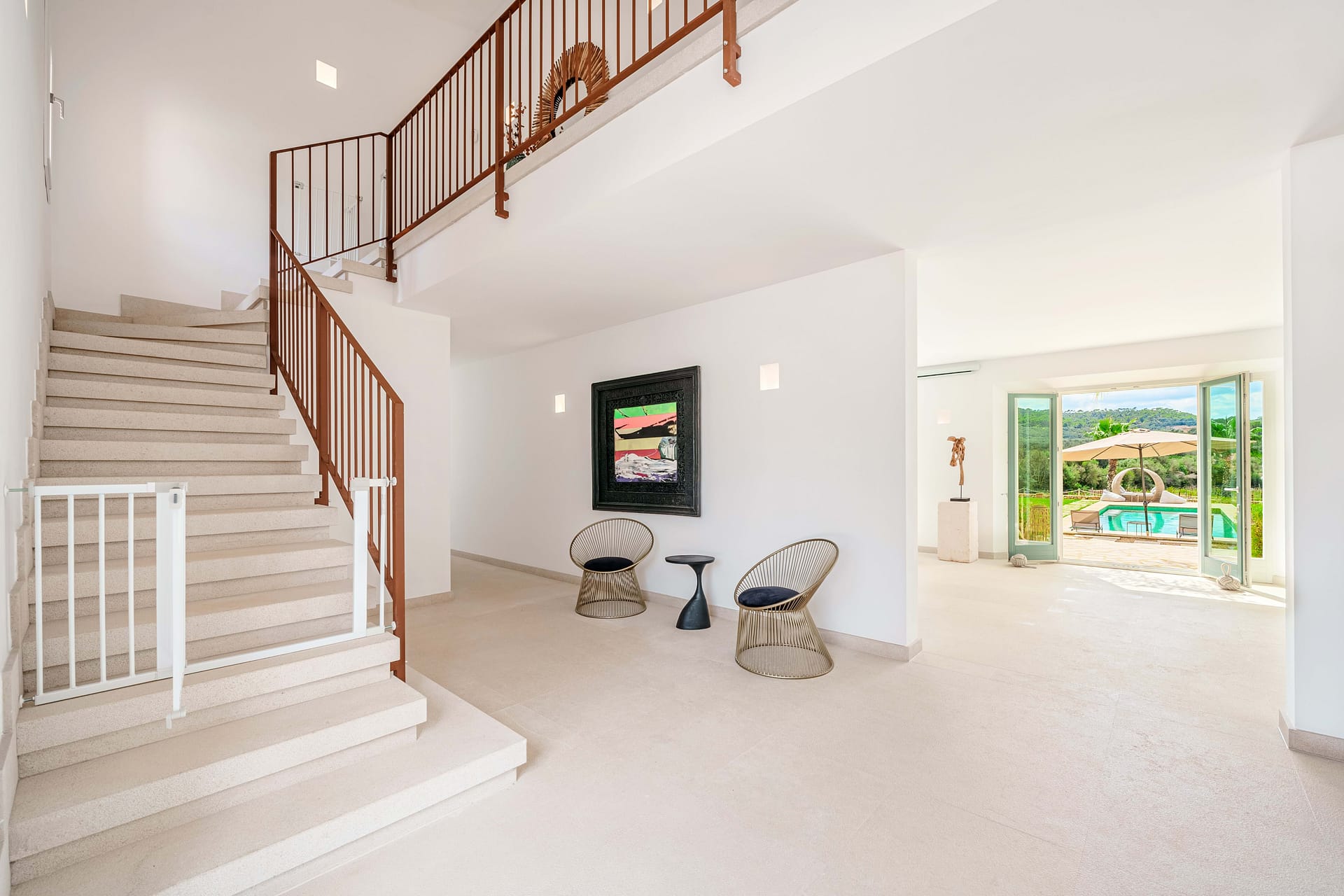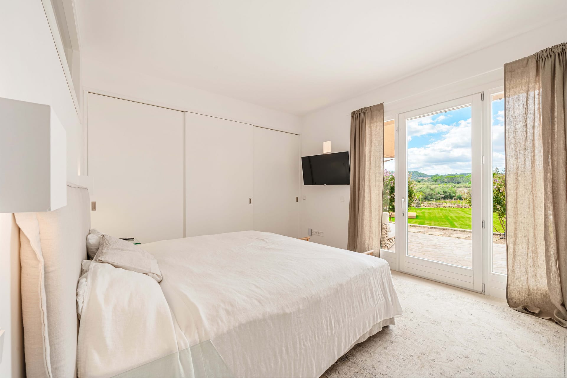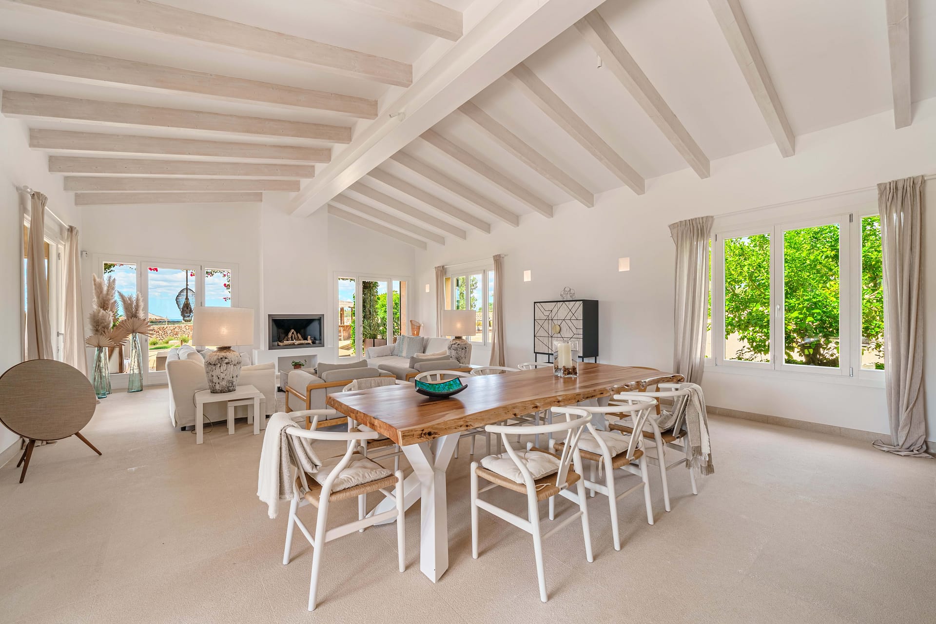 This timeless finca is located between Santanyi and Felanitx on a plot of almost 30,000 m and is embedded in a great mountain panorama in front of Cas Concos. A prestigious driveway lined with old olives leads you past the olive plantation and the 14,000 m vineyard to the charming finca built in 2019. It captivates with its successful combination of modern ambience and Mediterranean flair. The house is divided into three parts – on the ground floor of the main house there is a living room with a cinema projector and a cosy sofa area with direct access to the pool and garden. On the upper floor of the main house there is the master area with a large bedroom and two roof terraces. From here you can enjoy a magnificent view of the huge pool area as well as the beautiful Mediterranean garden and vineyards. The left wing of the house is ideal for guests, as there are three guest bedrooms, each with its own en suite bathroom and direct access to its own terrace and pool. The right wing of the house is dedicated to being together with the family – the open-plan kitchen-living room with practical kitchen island has been equipped with a Bora hob, Miele oven and large wine cooler. Adjacent you will find the modern living room with open fireplace and access to the covered terrace. From the living room you can access the covered terrace and the large 5-metre long wooden table, which easily seats 16 people. From there you can go directly to the pool or the boules court or to the outdoor lounge with bioethanol fireplace. A highlight is the paradisiacal garden, which has a 56 m (14x4m) pool, an olive plantation and an outdoor lounge, as well as various places for rest and relaxation. It is an exceptional haven of exquisite privacy without sacrificing good accessibility. Other features include: a 31m garage, public electricity and own well, underfloor heating.