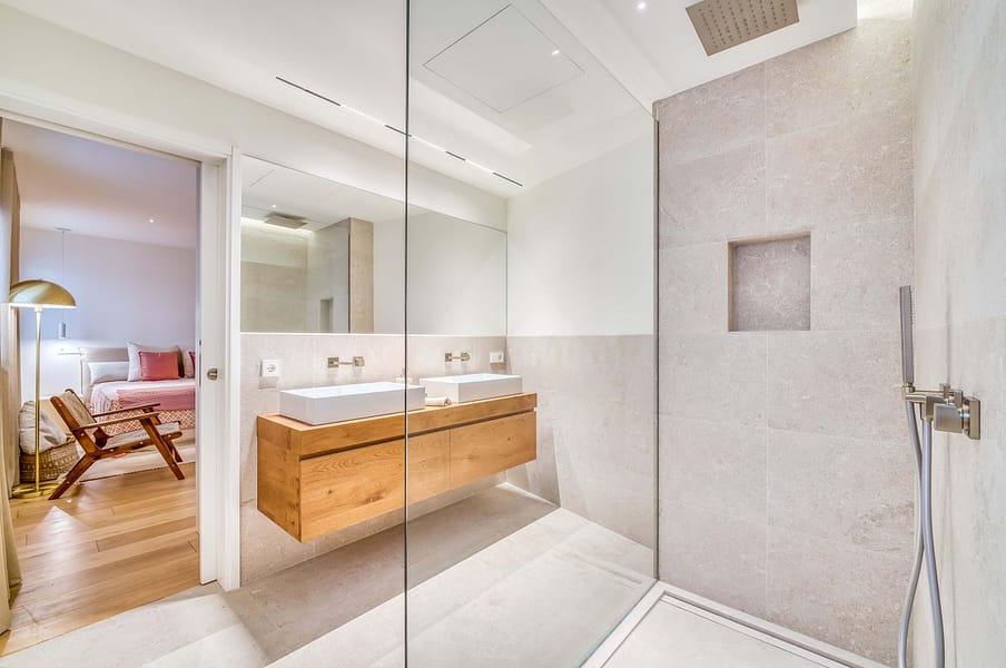 The residence incorporates a high-efficiency aerothermal energy system for sustainable domestic hot water production, providing both environmental benefits and reduced running costs.