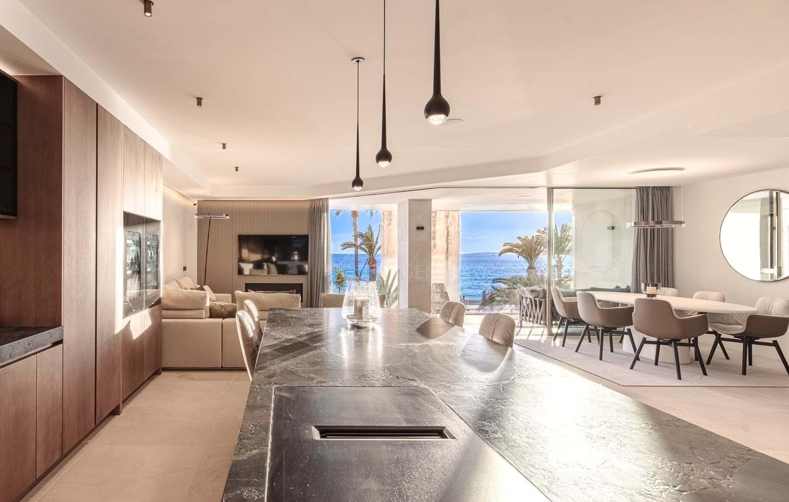 The moment you step through your own front door, you are greeted by an elegant entrance hall that sets a tone of sophistication. This space not only offers extra storage but also includes a dedicated area for bicycles, reflecting the thoughtful design that enhances both aesthetic appeal and practical living. The heart of the home is its expansive open-plan kitchen, dining, and living area, designed to maximise the stunning sea views. The kitchen is a chefs dream, featuring high-end appliances and sleek finishes that make cooking both enjoyable and efficient. The adjoining living area, centered around a modern fireplace, creates an inviting space perfect for relaxation and entertaining. Large pocket windows throughout the area ensure that the stunning Mediterranean backdrop is always in view, filling the space with natural light and creating an airy, open atmosphere. This luxurious apartment includes two master bedrooms, each designed as a private retreat with its own en-suite bathroom. The bathrooms are finished with natural stone and elegant fixtures, providing a spa-like experience. In addition to the master suites, the apartment also features a dedicated laundry room a guest bathroom with sea views and a fantastic covered terrace. The apartments luxurious features are designed to enhance comfort and convenience. Natural stone and parquet flooring throughout the home blend seamlessly, while ceiling-high wooden doors and invisible skirting boards contribute to the modern, sleek design. Underfloor heating provides warmth during cooler months, complemented by an energy-efficient heat pump and a state-of-the-art air conditioning system that ensures year-round comfort. The central air renovation system maintains optimal air quality, and the bathrooms and guest toilet are equipped with dedicated ventilation systems. Technology and security are paramount in this residence. The apartment is fitted with a high-quality electric installation, including Jung® light switches and sockets, with all lights being dimmable to create the perfect ambiance. Electrical curtains in the bedrooms offer both convenience and privacy. The integrated Sonos® sound system in the ceiling provides high-fidelity audio throughout the space, enhancing the living experience. Security is top-notch with a comprehensive camera system, an alarm system, and a secure front door with a camera. For additional convenience, the property includes underground parking within the community, ensuring secure and easy access to your home. The apartments smart home integration allows you to control various aspects of the property effortlessly, making modern living both efficient and enjoyable. This first sea line luxury apartment in Portixol is more than just a home; it is a lifestyle, the community not only has direct access to one of Palmas most scenic walking routes, but also a private padel court and two pools and private access to the beach.