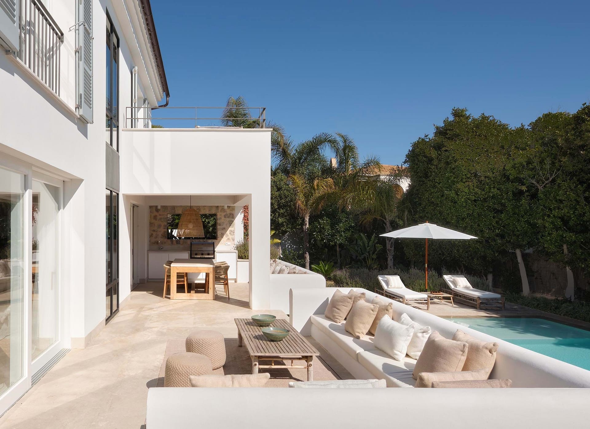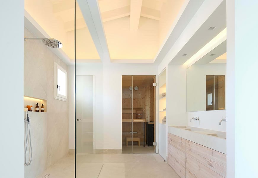 With approximately 286 m² of interior living space, the residence unfolds into an open, light-filled layout that exudes harmony and sophistication. Clean architectural lines are balanced with natural textures and warm Mediterranean tones, while expansive windows capture the surrounding landscape and bathe each room in natural light. The result is a home that truly reflects the essence of indooroutdoor living in Mallorca, creating a seamless flow between the interior spaces and the sun-soaked terraces.