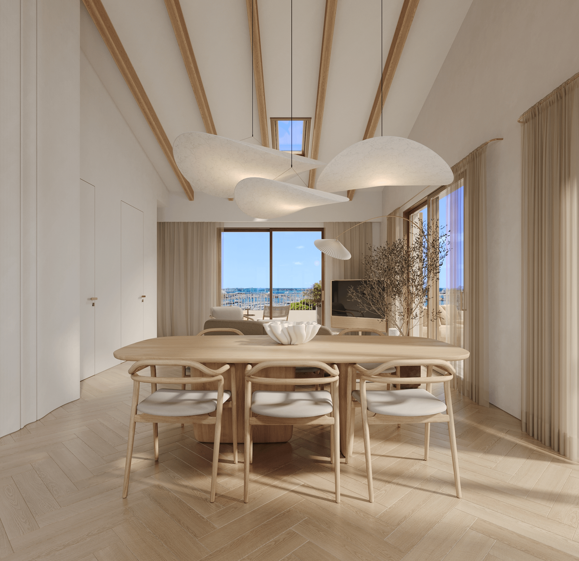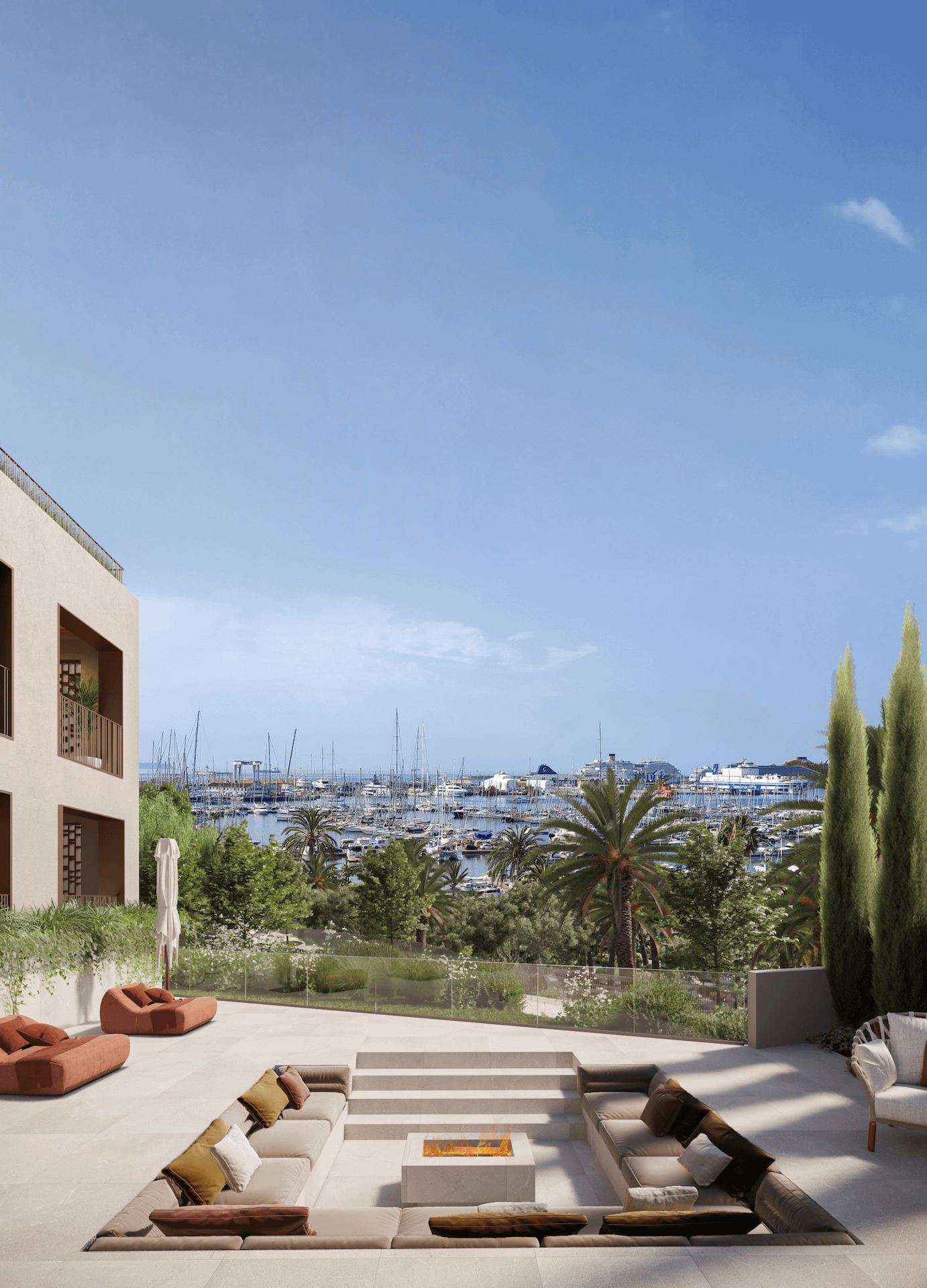 Discover unparalleled elegance at this high-end residential complex, beautifully situated on the seafront of Palma. This exclusive development masterfully blends traditional Mallorcan charm with contemporary design, offering a variety of luxurious living spaces, each designed with meticulous attention to detail and top-quality finishes. Choose from one, two, and three-bedroom apartments, including duplexes, penthouses, and three-story units with multi-possibility basements and private parking. Each residence boasts generous, bright living areas, private terraces, and gardens. The buildings showcase traditional Mallorcan elements like wooden shutters, Arabic roof tiles, and earthy colors, seamlessly integrated with contemporary materials such as aluminum and custom lattices. The façades, featuring a mix of plastered and painted ETICS systems, gris zarzi stone plinths, and premium wood joinery with thermal break and solar control glass, highlight the fusion of traditional and modern aesthetics. Enjoy a wide range of communal facilities, all interconnected by beautifully landscaped gardens and pathways. The 97m² reception hall, with a 24/7 dedicated staff member, is connected to the gym, pool, solarium, and wellness area. The outdoor amenities include a 17.5-meter swimming pool with an integrated jacuzzi, sunbathing areas, an outdoor lounge with fire pits, and a sunken sitting area offering direct harbor views. The high-tech gym, equipped with the latest Technogym equipment, provides spaces for high-tech workouts and yoga, with a pivoting sliding window door and curtain system for privacy. The wellness and spa facilities are designed for ultimate relaxation, featuring an indoor pool, steam sauna, thermal Nordic sauna, cryotherapy room, and a lounging and relaxation area beside the pool. Additional social spaces include a golf simulator, wine cellar, social club with a fully equipped kitchen and dining area, home cinema with HD projector and high-quality surround sound system, and a game court with gaming stations, vending machines, and lounging areas. Secure parking is available in two basement levels with 119 parking spots, a car wash space, and pre-installed electric charging stations. The construction is robust, featuring a reinforced concrete structure with advanced waterproofing and thermal insulation systems, ensuring durability and comfort. The use of sustainable geothermal energy for heating and cooling reduces energy consumption and environmental impact. An integrated domotic system allows residents to control lighting, temperature, blinds, and more via a smartphone app, enhancing convenience and efficiency. High-security systems include 24-hour security service with CCTV coverage across all communal areas, providing peace of mind for residents. Interior finishes are available in two distinct styles: the LA BRISA line, featuring herringbone oak wood flooring and travertine bathroom tiles, and the EL MONTE line, offering stainless steel kitchen islands and Italian porcelain tiles. Kitchens are fully equipped with high-end Miele appliances, including stoves, ovens, fridges, freezers, dishwashers, extractors, and wine coolers. Experience the best of Mediterranean living in Palma’s most prestigious residential complex. With its exceptional design, luxurious amenities, and prime location, this development offers a unique opportunity to enjoy a sophisticated lifestyle in one of Mallorca’s most sought-after areas.