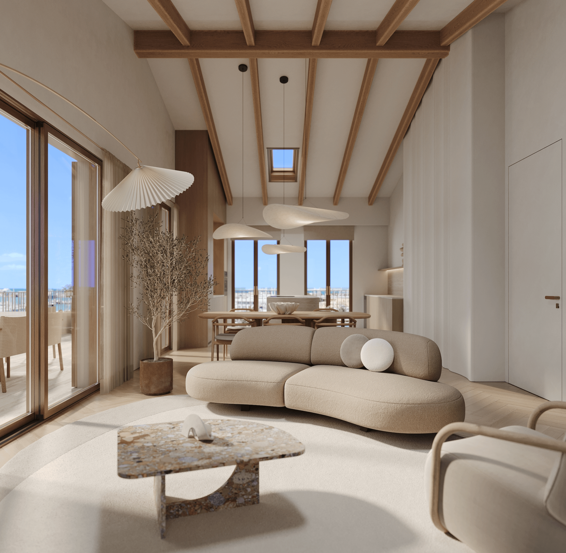 Discover unparalleled elegance at this high-end residential complex, beautifully situated on the seafront of Palma. This exclusive development masterfully blends traditional Mallorcan charm with contemporary design, offering a variety of luxurious living spaces, each designed with meticulous attention to detail and top-quality finishes. Choose from one, two, and three-bedroom apartments, including duplexes, penthouses, and three-story units with multi-possibility basements and private parking. Each residence boasts generous, bright living areas, private terraces, and gardens. The buildings showcase traditional Mallorcan elements like wooden shutters, Arabic roof tiles, and earthy colors, seamlessly integrated with contemporary materials such as aluminum and custom lattices. The façades, featuring a mix of plastered and painted ETICS systems, gris zarzi stone plinths, and premium wood joinery with thermal break and solar control glass, highlight the fusion of traditional and modern aesthetics. Enjoy a wide range of communal facilities, all interconnected by beautifully landscaped gardens and pathways. The 97m² reception hall, with a 24/7 dedicated staff member, is connected to the gym, pool, solarium, and wellness area. The outdoor amenities include a 17.5-meter swimming pool with an integrated jacuzzi, sunbathing areas, an outdoor lounge with fire pits, and a sunken sitting area offering direct harbor views. The high-tech gym, equipped with the latest Technogym equipment, provides spaces for high-tech workouts and yoga, with a pivoting sliding window door and curtain system for privacy. The wellness and spa facilities are designed for ultimate relaxation, featuring an indoor pool, steam sauna, thermal Nordic sauna, cryotherapy room, and a lounging and relaxation area beside the pool. Additional social spaces include a golf simulator, wine cellar, social club with a fully equipped kitchen and dining area, home cinema with HD projector and high-quality surround sound system, and a game court with gaming stations, vending machines, and lounging areas. Secure parking is available in two basement levels with 119 parking spots, a car wash space, and pre-installed electric charging stations. The construction is robust, featuring a reinforced concrete structure with advanced waterproofing and thermal insulation systems, ensuring durability and comfort. The use of sustainable geothermal energy for heating and cooling reduces energy consumption and environmental impact. An integrated domotic system allows residents to control lighting, temperature, blinds, and more via a smartphone app, enhancing convenience and efficiency. High-security systems include 24-hour security service with CCTV coverage across all communal areas, providing peace of mind for residents. Interior finishes are available in two distinct styles: the LA BRISA line, featuring herringbone oak wood flooring and travertine bathroom tiles, and the EL MONTE line, offering stainless steel kitchen islands and Italian porcelain tiles. Kitchens are fully equipped with high-end Miele appliances, including stoves, ovens, fridges, freezers, dishwashers, extractors, and wine coolers. Experience the best of Mediterranean living in Palma’s most prestigious residential complex. With its exceptional design, luxurious amenities, and prime location, this development offers a unique opportunity to enjoy a sophisticated lifestyle in one of Mallorca’s most sought-after areas.