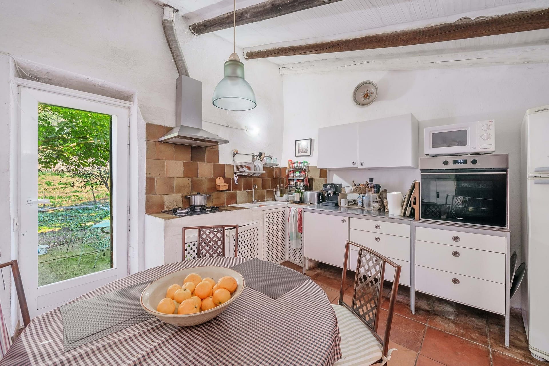 The grounds are adorned with centennial olive trees, almond orchards, lush gardens, and diverse landscapes, including oak and pine forests. Outdoor amenities include terraces, a swimming pool, a natural spring, a wood-fired oven, and a picturesque pond. Additional structures include a 90 m² workshop-garage and three tool sheds.