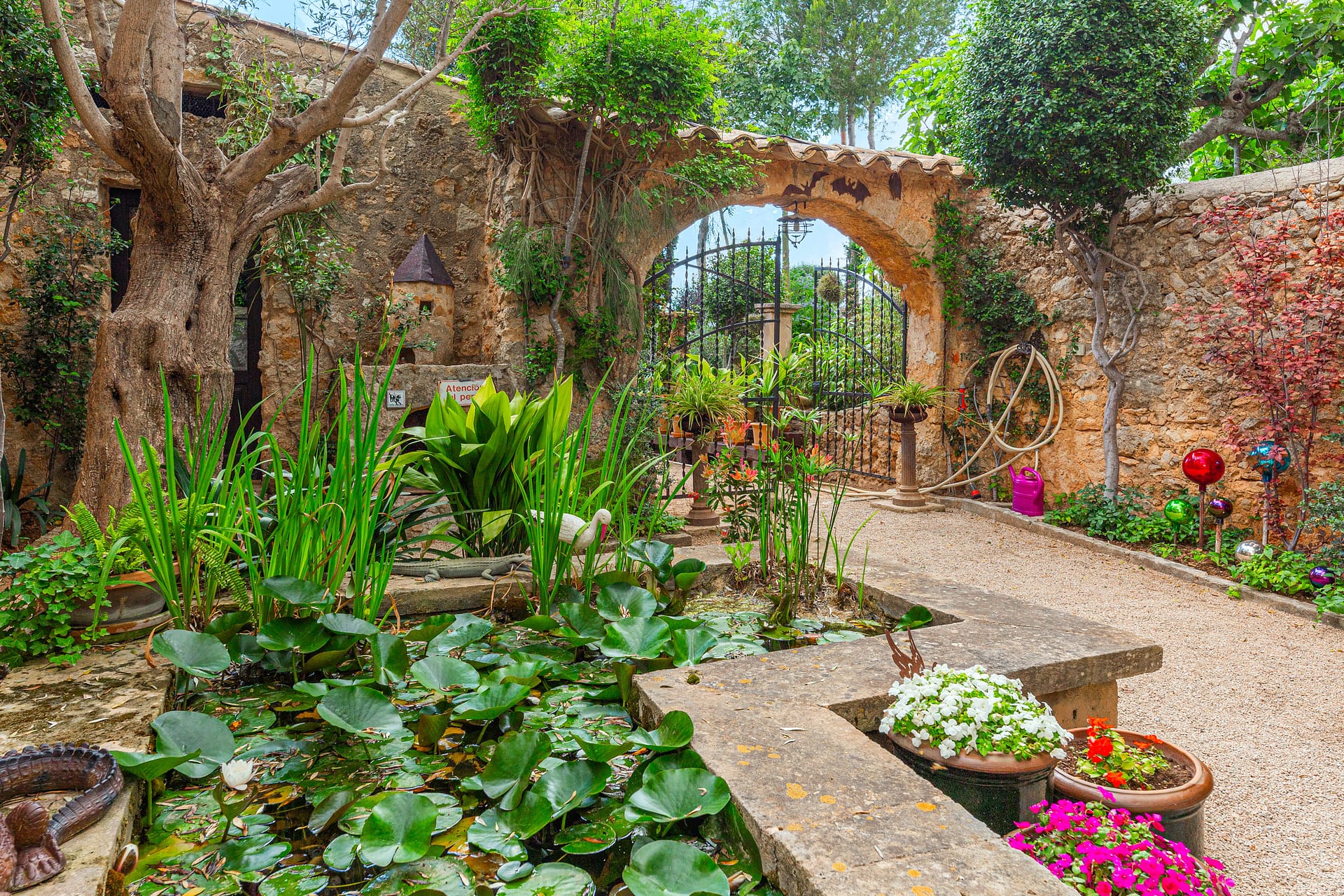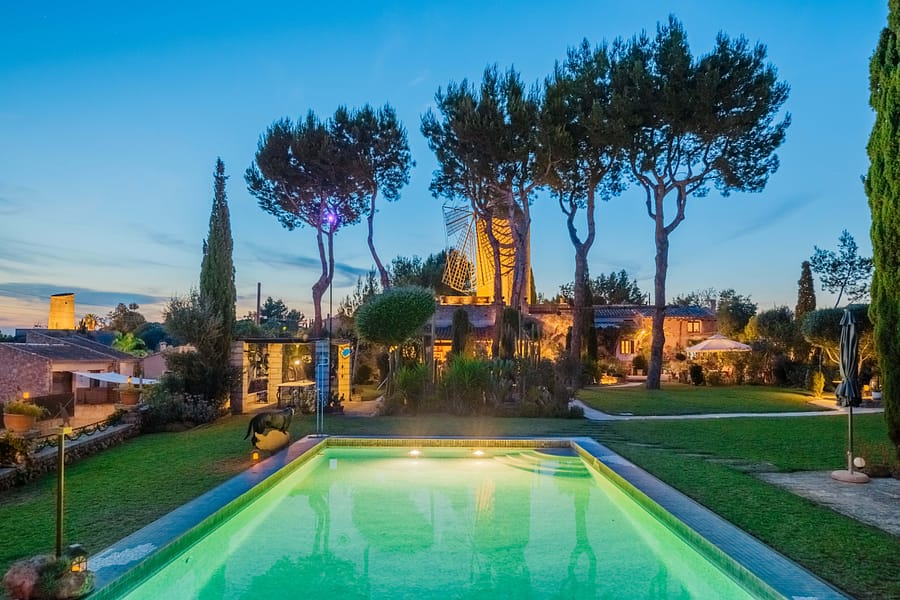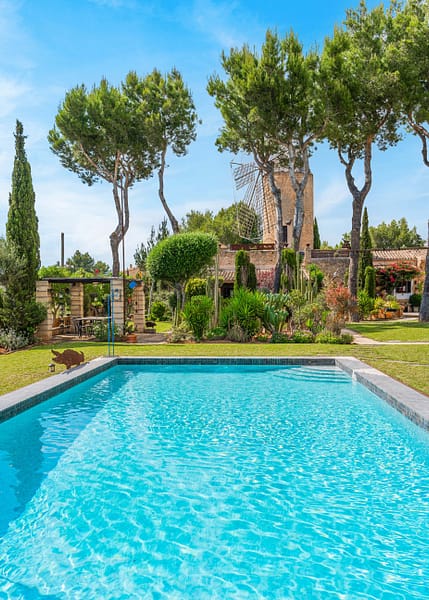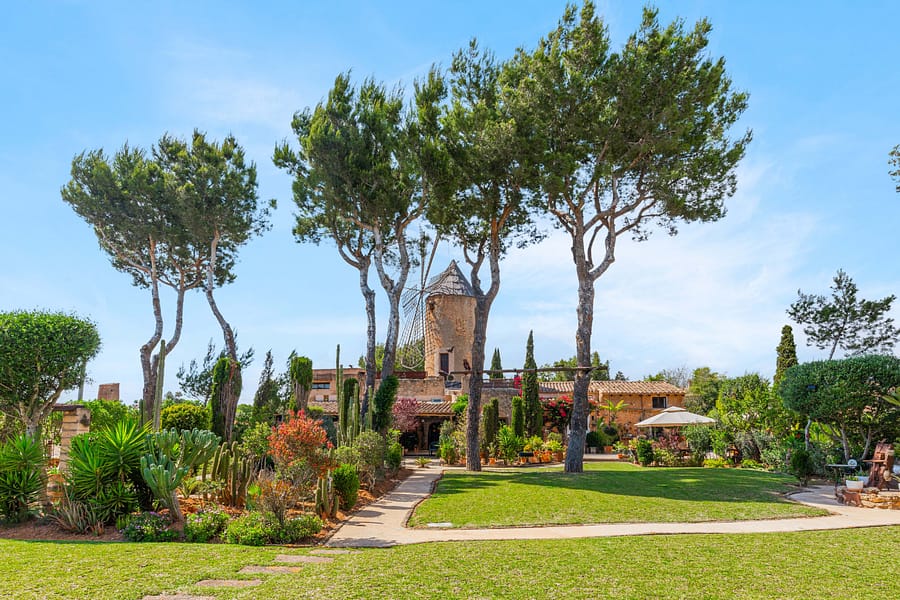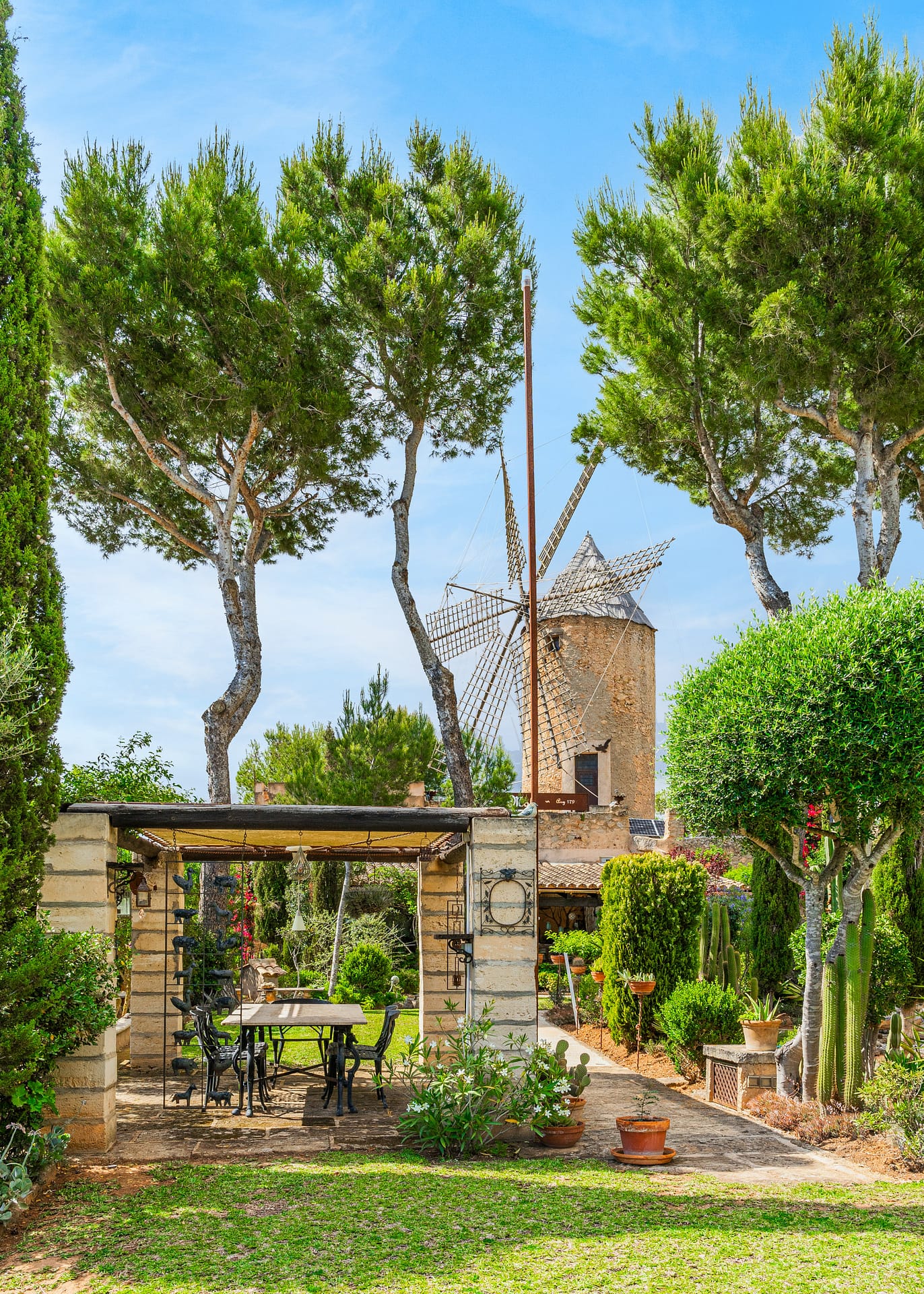 This meticulously restored, authentic windmill serves as a private oasis and secure investment, preserving a luxurious and highly private home alongside a piece of Mallorcan history and tradition. Situated in the heart of the island, this beautiful property seamlessly blends into a charming village with excellent connectivity. For more than three decades, the same dedicated family has owned this remarkable estate, fostering a deep connection to its unique character. Initially captivated by its charm, they embarked on a careful restoration, breathing new life into the ruins while preserving their magical essence. Their commitment has not only maintained the timeless beauty of the house but also enhanced its warmth and character, making it a unique home. The property consists of a main house and a separate guest house. The main house features rooms with high ceilings and a combination of traditional and modern elements. The centerpiece is the walkable mill tower with its original stone staircase, exceptionally well-preserved and stately. The completely independent guest house, equipped with a valid vacation rental license, offers comfortable living spaces and modern amenities. This secluded oasis boasts a professionally landscaped garden that has evolved into a true Garden of Eden over the past 30 years. Surrounding the property are tranquil water features and beautifully designed seating areas, perfect for year-round enjoyment. When the sun sets, the garden is illuminated, creating a mesmerizing ambiance. Additional features include various modern amenities and extensive property documentation. This property not only offers a luxurious lifestyle but also a rare opportunity to own a piece of Mallorcan heritage. Extras: Own well