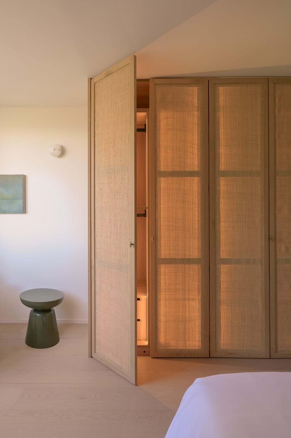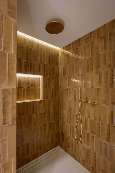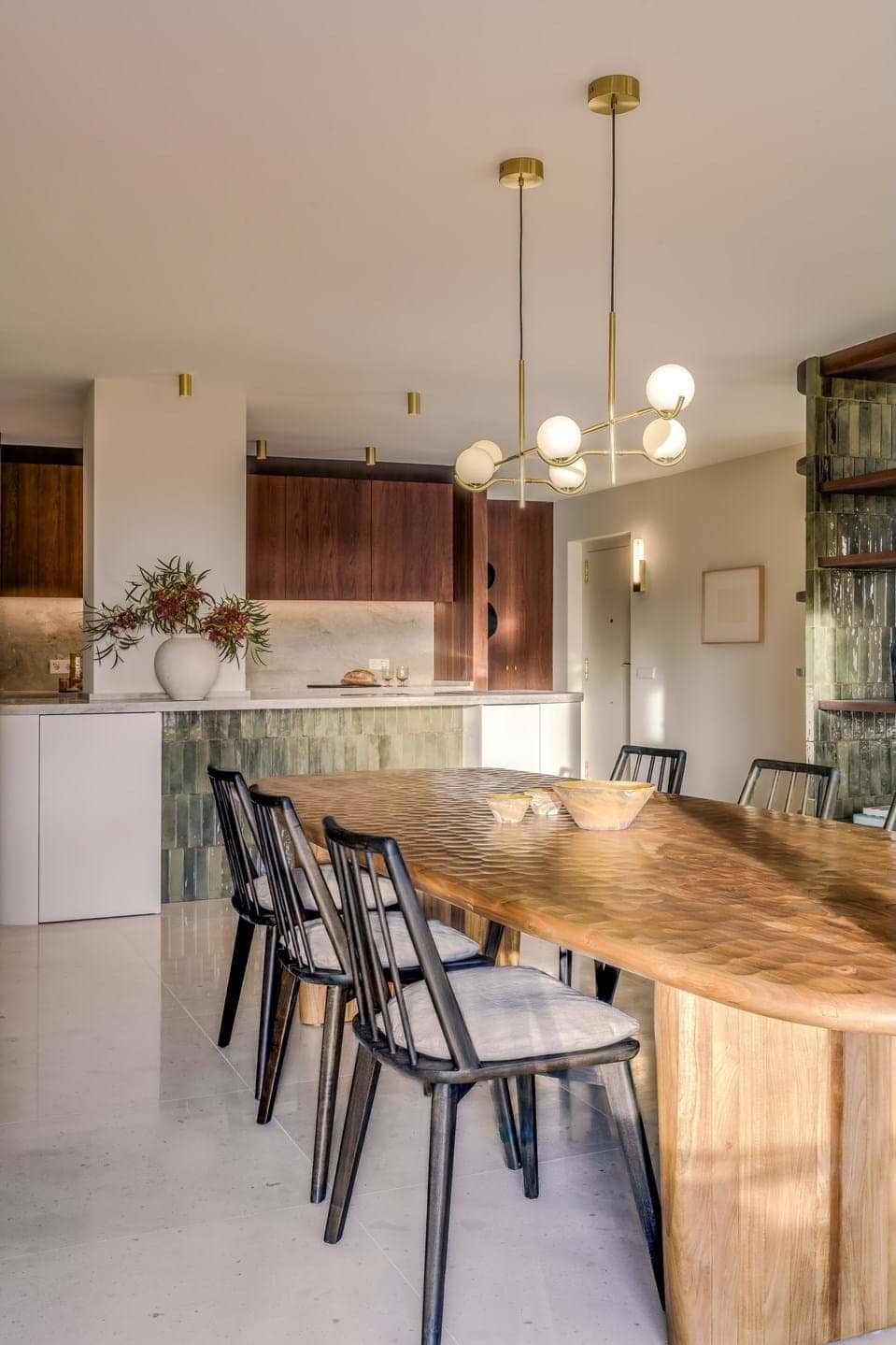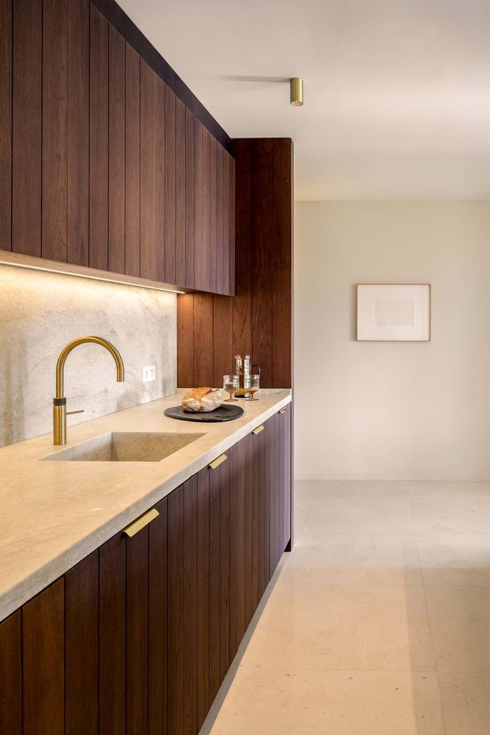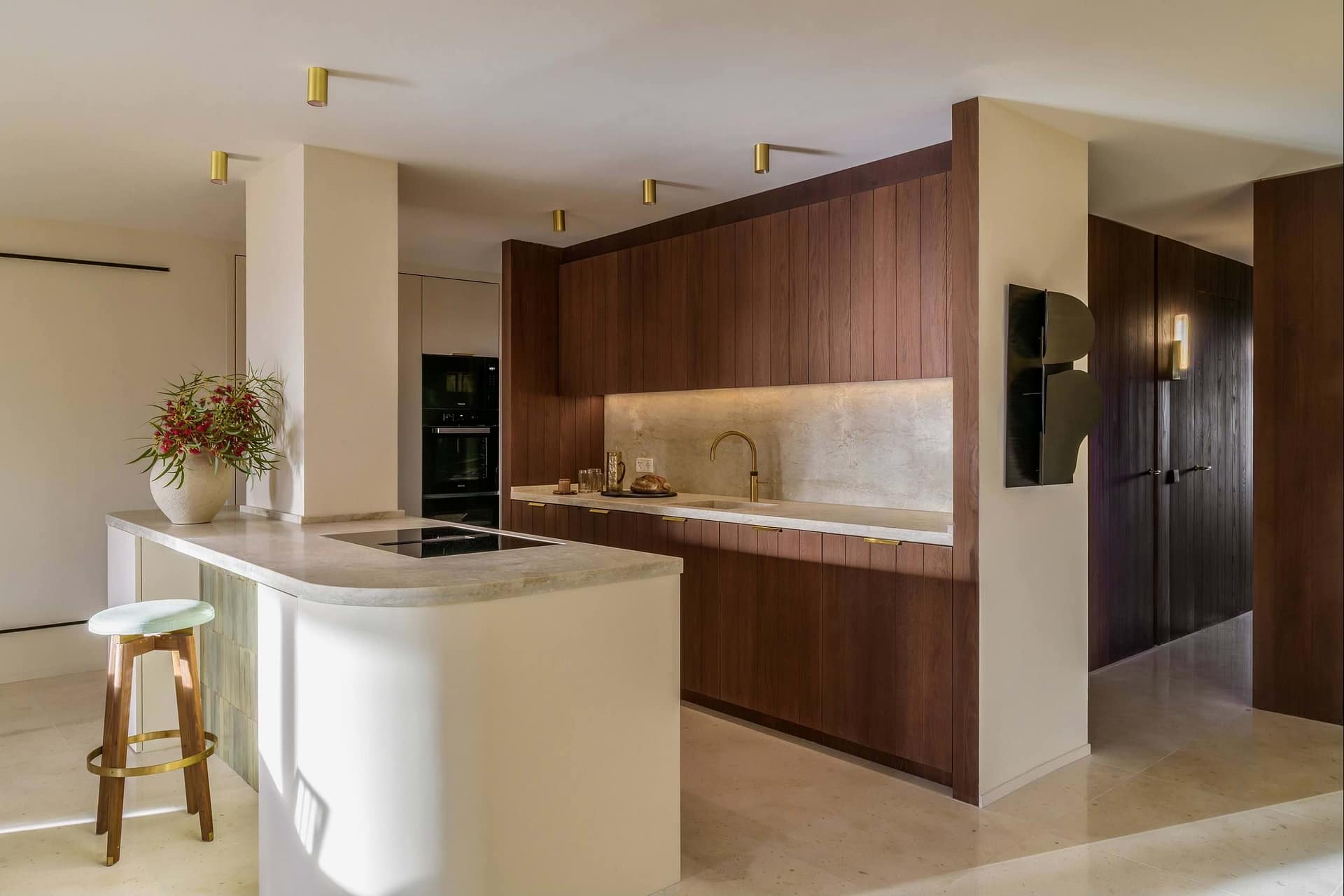 The specification is built around a single design principle: no synthetic materials. Caliza Capri limestone throughout the floors – a fine-grain, fossil-traced stone quarried in Almería. Taj Mahal quartzite on the kitchen island and surfaces. Canadian oak cabinetry. Chestnut window frames. Brass fixtures. Italian bathroom tiles by Marazzi and fittings by Ritmonio. The double-walled construction with acoustic insulation makes the apartment notably silent. Gas zoned underfloor heating significantly cheaper to run than electric at this scale – sits alongside a hidden fan coil system and cross-ventilation designed into the layout. A double-sided fireplace serves both the living and dining areas.