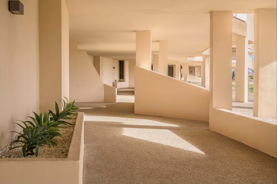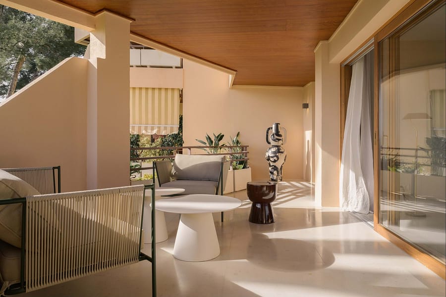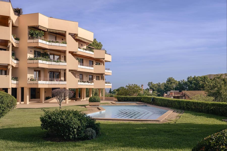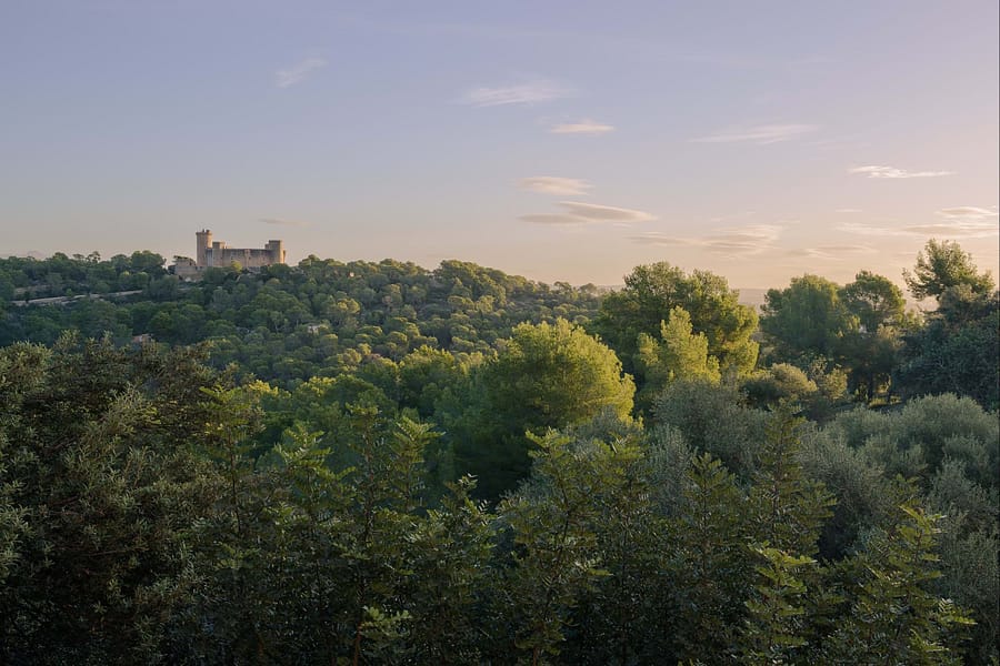 One of the few apartments in La Bonanova that earns its position from both sides. The southwest-facing living, dining, and kitchen receives afternoon sun through to sunset, with open sea views across the community garden and pool from the terrace. The northeast bedrooms look directly onto the protected pine forest of Bellver Castle Park – no direct neighbours visible, no traffic noise. The building dates from the 1960s and has long been home to Palma’s established residential community. The microclimate runs 3-5°C cooler than the city centre in summer.