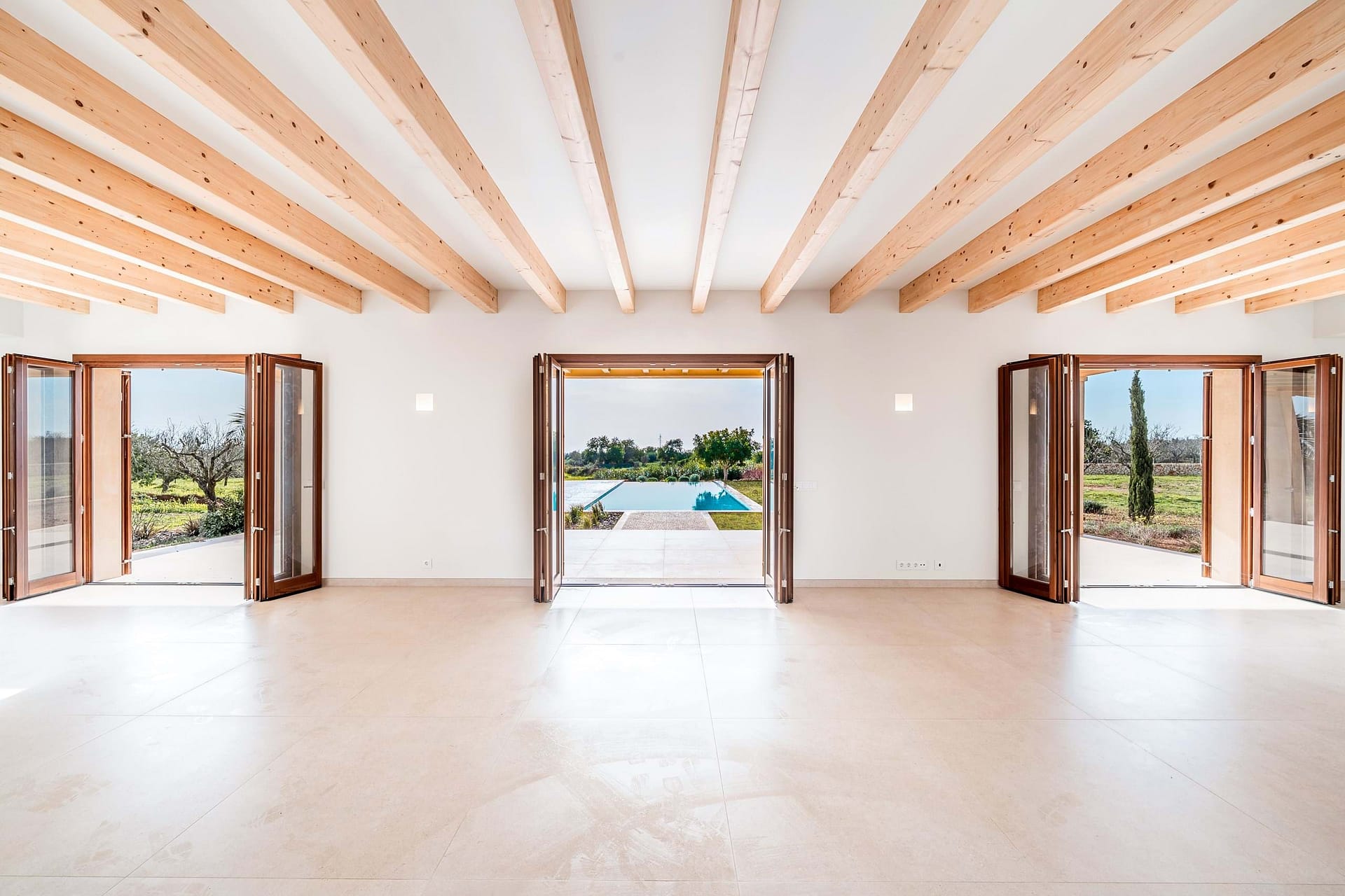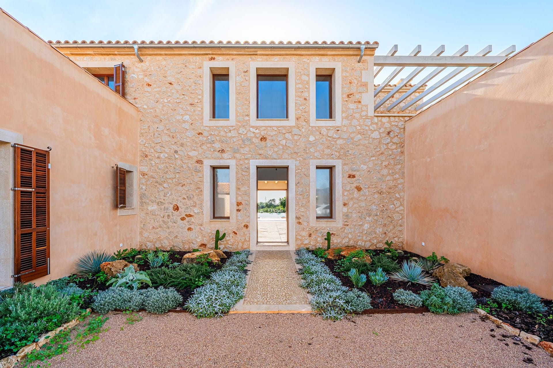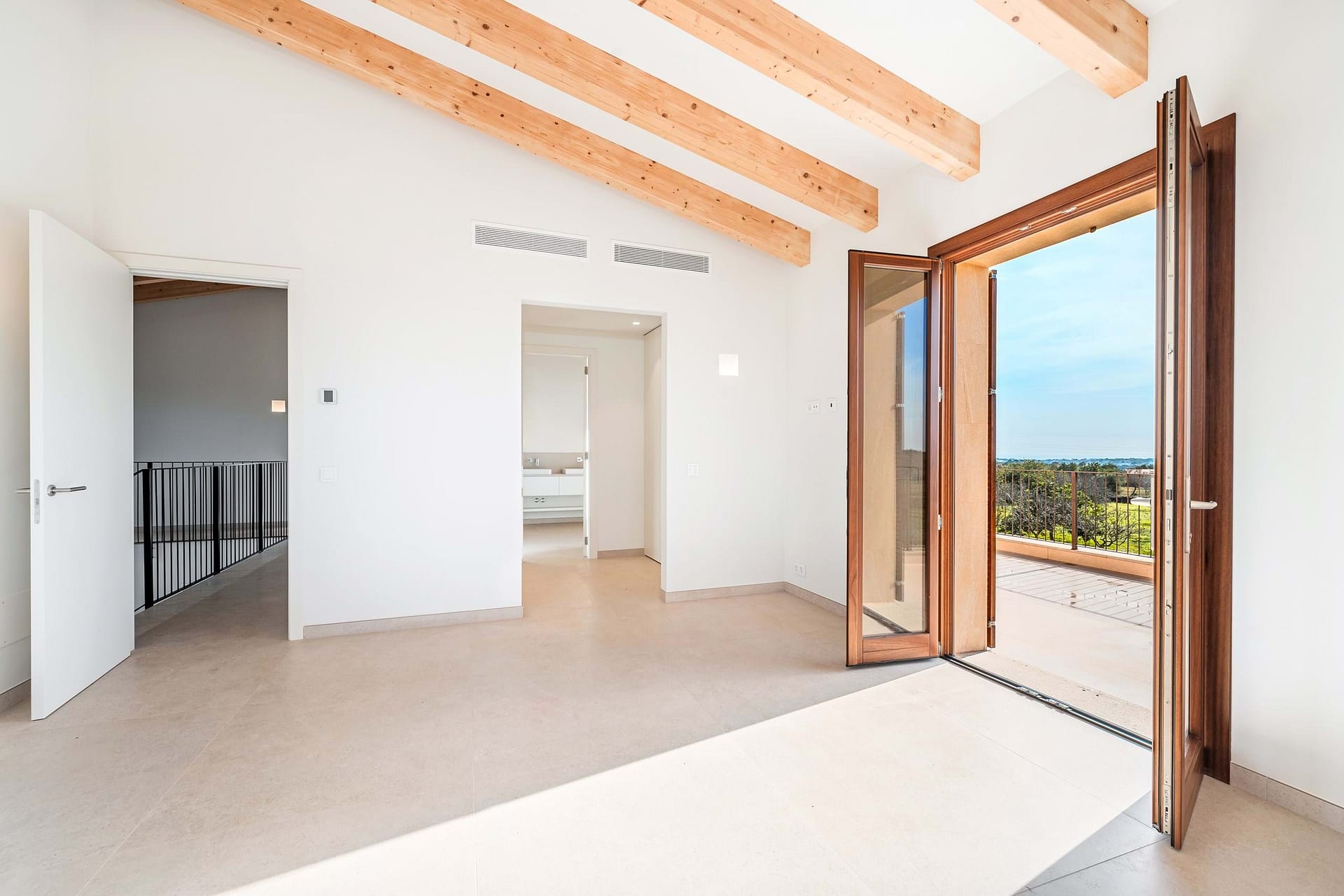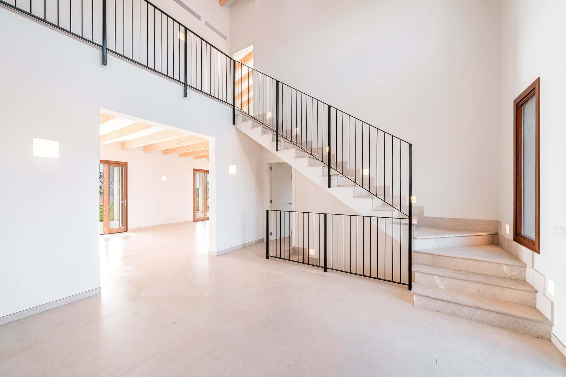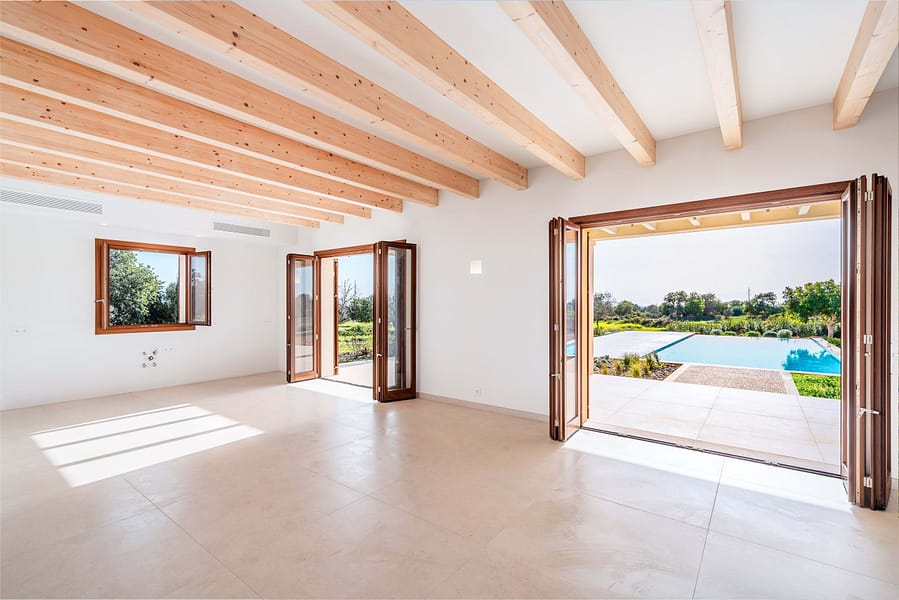 The main residence spans roughly 420 m² and is designs around light, flow, and indoor-outdoor living. A spacious open-plan living, dining, and kitchen area opens directly onto generous terraces. A landscaped garden, and a striking 60 m² swimming poolideal for long summer days and relaxed entertaining. The finca offers five generously sized bedrooms, all with en suite bathrooms: three on the main level and two on the upper floor, including a master suite with a private terrace and open views across the countryside.