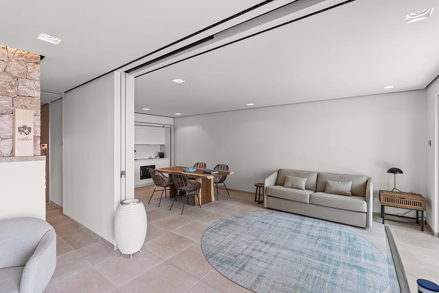 The elegantly designed bedroom features an en-suite bathroom, creating a private retreat. A bright living and dining area and a modern, fully equipped kitchen invite you to relax and entertain. High-quality materials such as natural stone floors and stone walls add a touch of exclusivity to the home.