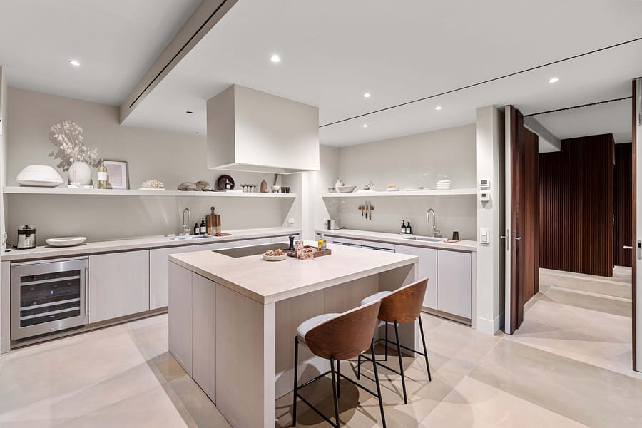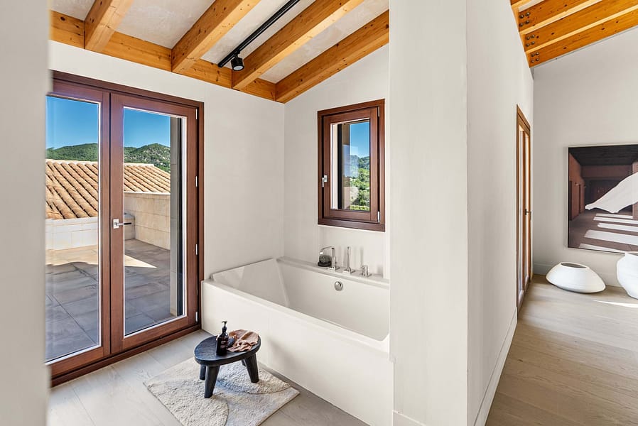 The main residence offers over 450 m² of refined living space, designed to the highest standards. Clean architectural lines, natural stone elements and floor-to-ceiling windows create a seamless connection between indoor and outdoor living, a key feature for high-end properties for sale in Felanitx and the surrounding area.