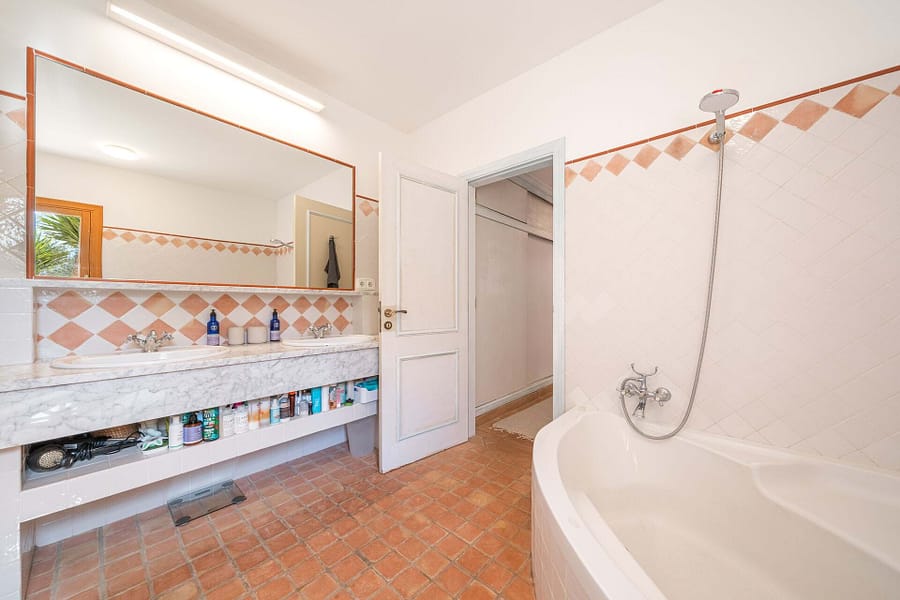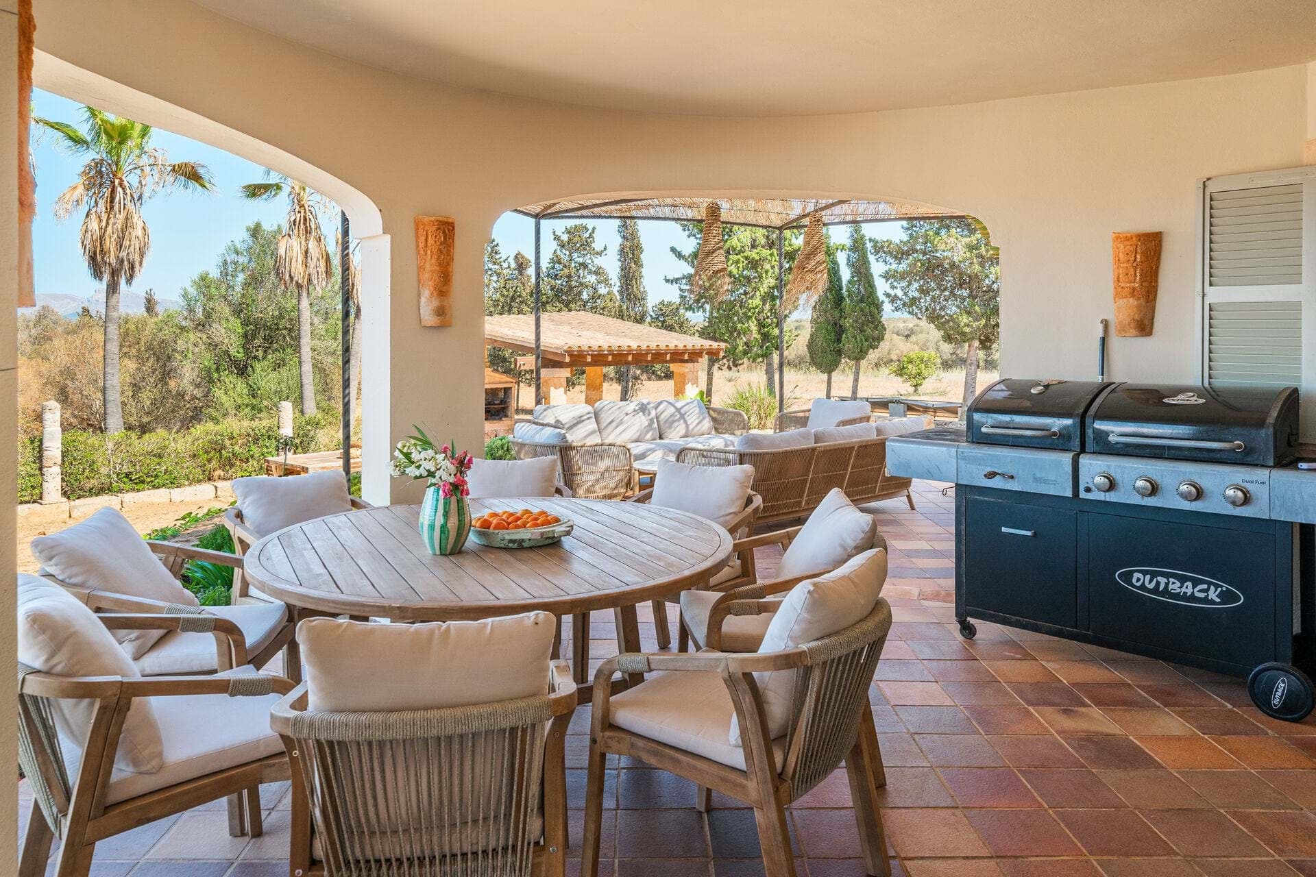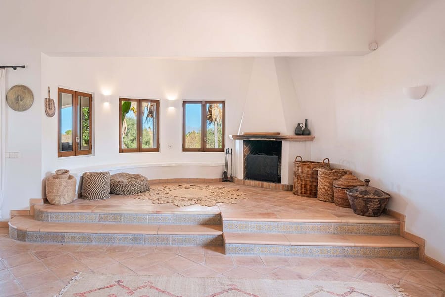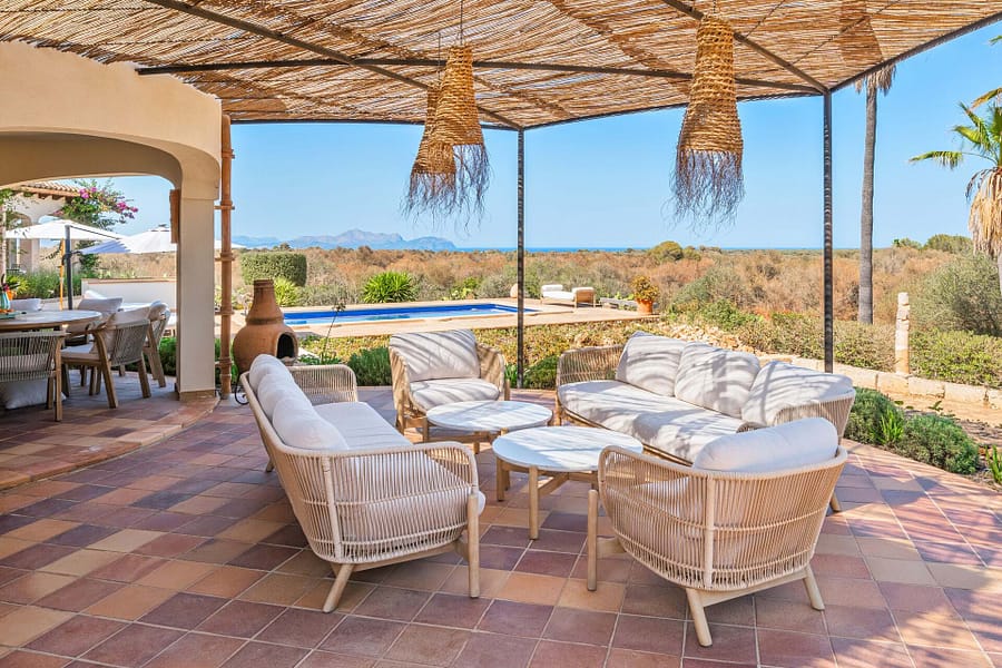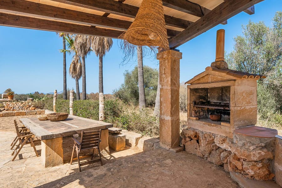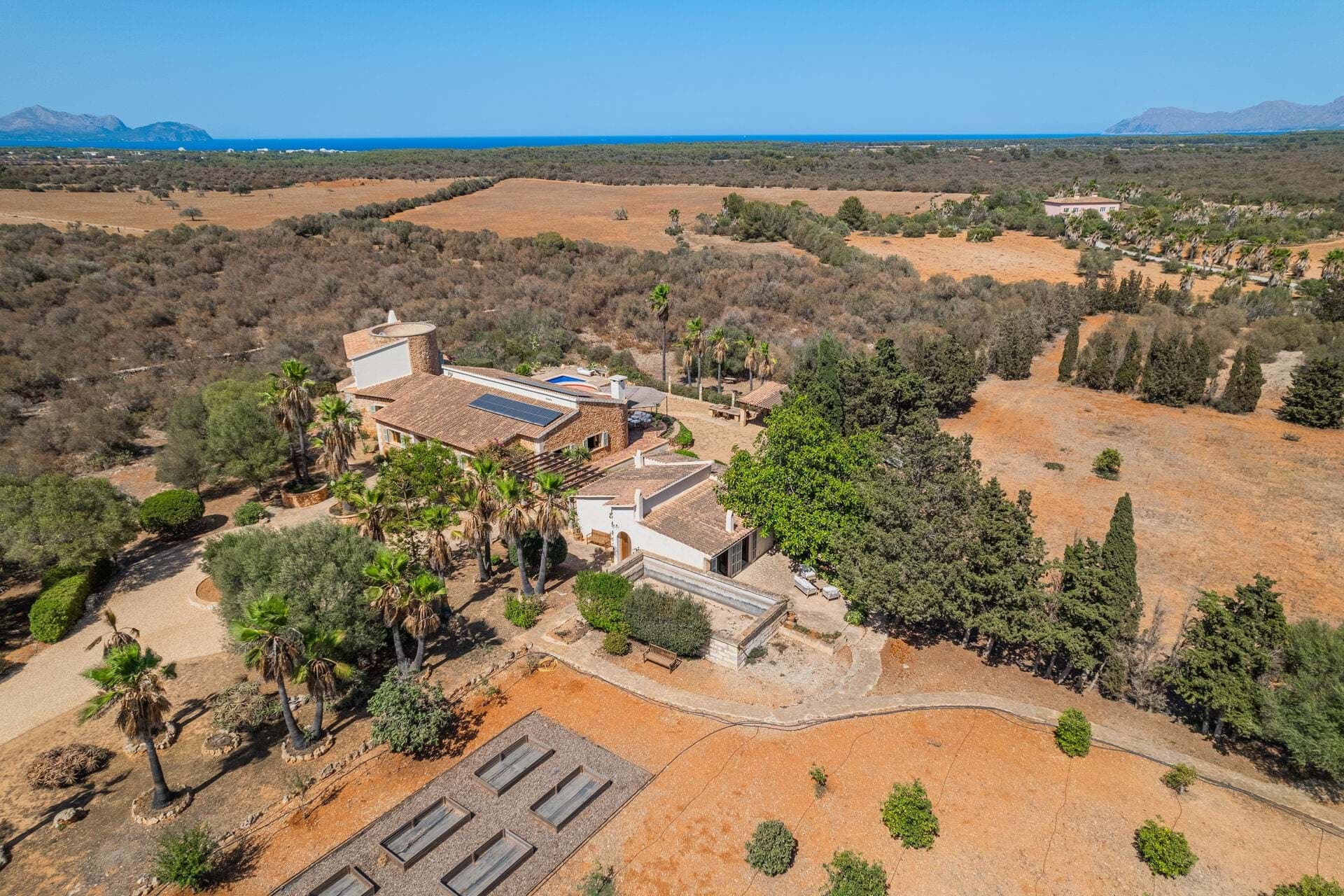 Welcome to Finca Sa Teulada, a very stylish retreat where Mallorca meets Ibiza. This recently redecorated finca offers an exquisite blend of modern elegance and island charm, set on a sprawling 26,000 m² of fully walled, flat land. The property features a generous 594 m² of constructed space, including 5 spacious bedrooms, 4 bathrooms, and a chic guest WC, all enhanced by impressive 5-meter high ceilings and built-in wardrobes. The finca includes a fully independent guest apartment with its own bedroom, bathroom, kitchen/lounge, and private terrace, complete with air conditioning and a log burner, ensuring comfort and privacy for visitors. Outdoors, enjoy a range of covered terraces and patios, a sparkling swimming pool, and an outdoor built-in BBQ area, perfect for both relaxation and entertaining. Experience an oasis of privacy with unobstructed 180-degree views of the Tramuntana and Llevant mountain ranges and the entire bay of Alcudia. The lush gardens feature a 3500 m² orange grove and a diverse fruit tree orchard, complemented by a greenhouse and an irrigated vegetable garden. A 4000 m² field is ideal for keeping animals. The finca embraces eco-friendly living with a full solar and battery system, underfloor heating, working fireplaces, and hot/cold air conditioning. It also boasts double glazing, automatic outdoor lighting, CCTV, and a security alarm system. A large gravel car park, a covered carport for 3 cars, and a spacious garage provide ample parking and storage. The property is equipped with its own water well and well house, ensuring a reliable and independent water supply. It also features a private water system with an anti-calcium filter and a 5-stage water osmosis installation in the kitchens for pure, drinkable water. Located just 7 minutes from Son Serra de Marina and 10 minutes from Playa de Muro, Finca Sa Teulada offers the perfect fusion of luxury, privacy, and island beauty.