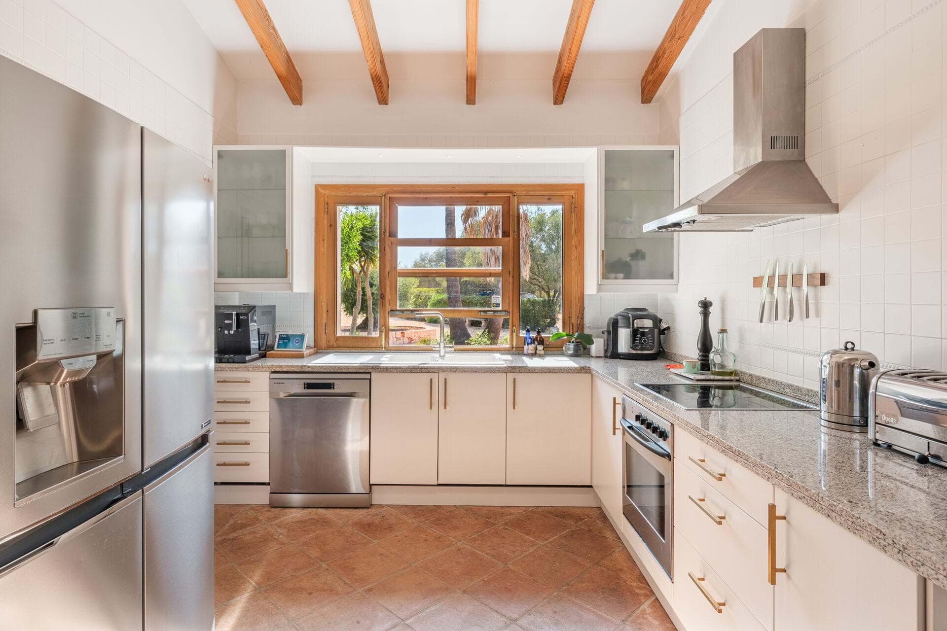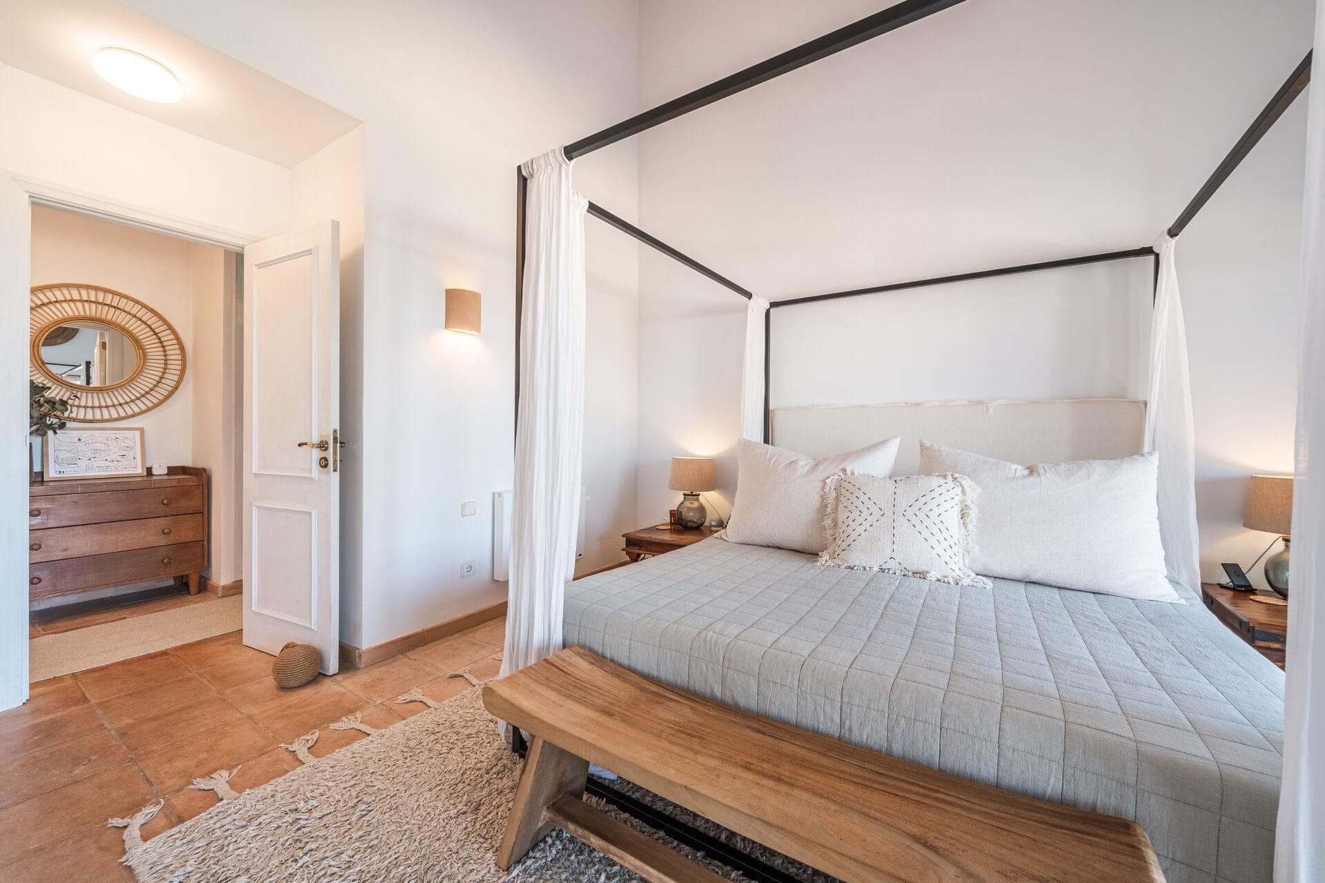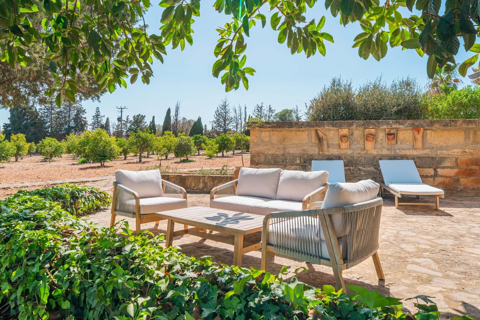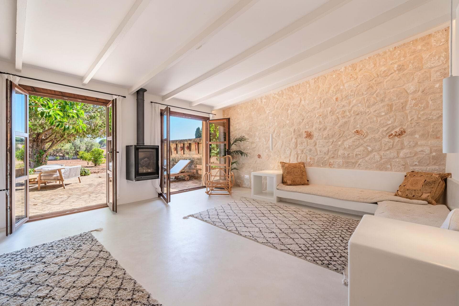 Welcome to Finca Sa Teulada, a very stylish retreat where Mallorca meets Ibiza. This recently redecorated finca offers an exquisite blend of modern elegance and island charm, set on a sprawling 26,000 m² of fully walled, flat land. The property features a generous 594 m² of constructed space, including 5 spacious bedrooms, 4 bathrooms, and a chic guest WC, all enhanced by impressive 5-meter high ceilings and built-in wardrobes. The finca includes a fully independent guest apartment with its own bedroom, bathroom, kitchen/lounge, and private terrace, complete with air conditioning and a log burner, ensuring comfort and privacy for visitors. Outdoors, enjoy a range of covered terraces and patios, a sparkling swimming pool, and an outdoor built-in BBQ area, perfect for both relaxation and entertaining. Experience an oasis of privacy with unobstructed 180-degree views of the Tramuntana and Llevant mountain ranges and the entire bay of Alcudia. The lush gardens feature a 3500 m² orange grove and a diverse fruit tree orchard, complemented by a greenhouse and an irrigated vegetable garden. A 4000 m² field is ideal for keeping animals. The finca embraces eco-friendly living with a full solar and battery system, underfloor heating, working fireplaces, and hot/cold air conditioning. It also boasts double glazing, automatic outdoor lighting, CCTV, and a security alarm system. A large gravel car park, a covered carport for 3 cars, and a spacious garage provide ample parking and storage. The property is equipped with its own water well and well house, ensuring a reliable and independent water supply. It also features a private water system with an anti-calcium filter and a 5-stage water osmosis installation in the kitchens for pure, drinkable water. Located just 7 minutes from Son Serra de Marina and 10 minutes from Playa de Muro, Finca Sa Teulada offers the perfect fusion of luxury, privacy, and island beauty.