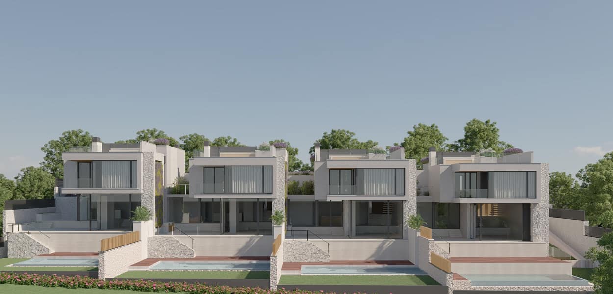 The architecture combines contemporary elegance with Mediterranean character, including a natural stone façade, vertical garden elements, and bespoke carpentry. Premium features such as underfloor heating, air conditioning, and a fireplace ensure year-round comfort, while optional additions such as a private gym or sauna further enhance the exclusivity of these homes.