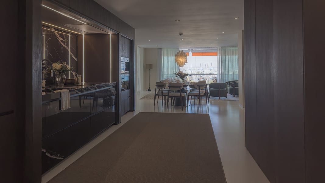 Designed to maximise light, space and views, the apartment features an expansive open-plan living area with floor-to-ceiling glazing and a seamless indoor-outdoor concept. A fully retractable pocket window connects the interior with a generous wraparound terrace, creating an ideal setting for Mediterranean living and entertaining while enjoying uninterrupted sea views.