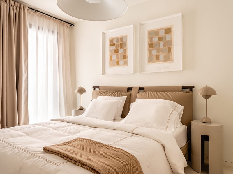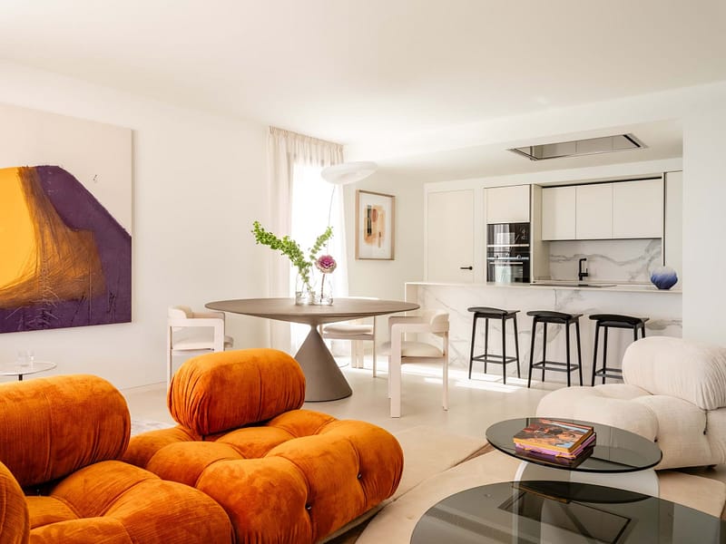 The open-plan living and dining area flows effortlessly onto the terrace, complemented by a modern, fully equipped kitchen featuring top-of-the-line appliances. The apartment offers three versatile bedrooms, including a primary suite with a walk-in wardrobe and bathroom, a bright guest bedroom, and a flexible home office that doubles as a guest room. Additional highlights include a separate laundry room, three luxurious bathrooms with underfloor heating, and ample wardrobe and storage solutions thoughtfully designed for convenience.