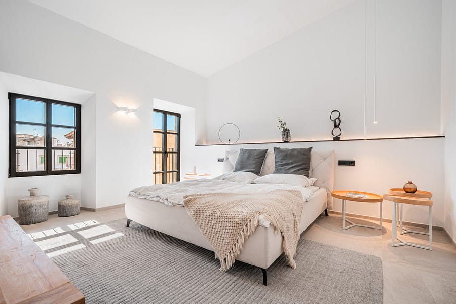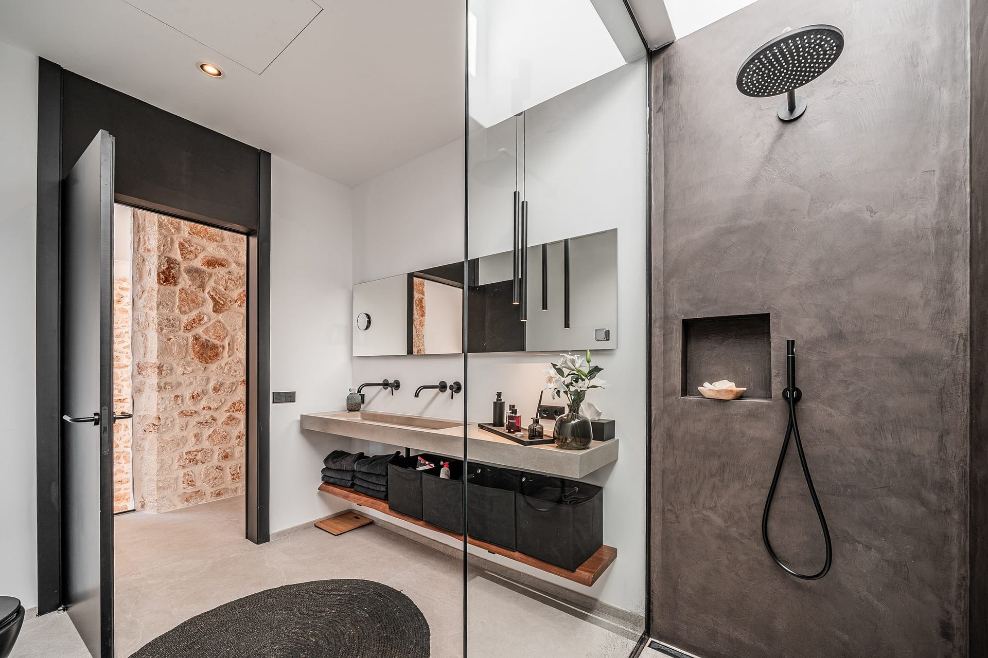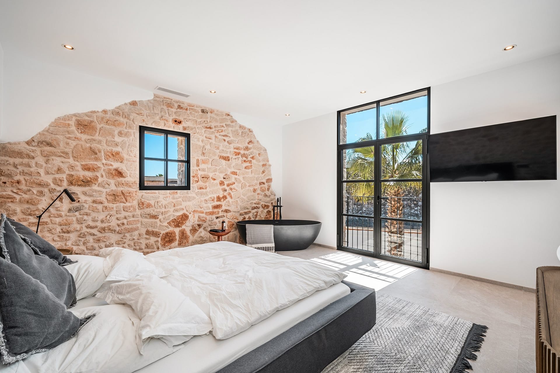 The first floor offers three bright and generously sized bedrooms, each with its own en-suite bathroomideal for those seeking a high-end townhouse in Santanyí Mallorca. The master suite stands out with a bold freestanding black bathtub and a dressing room filled with natural light.