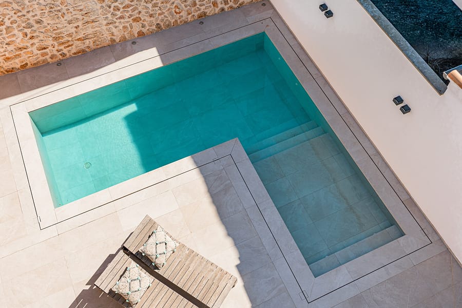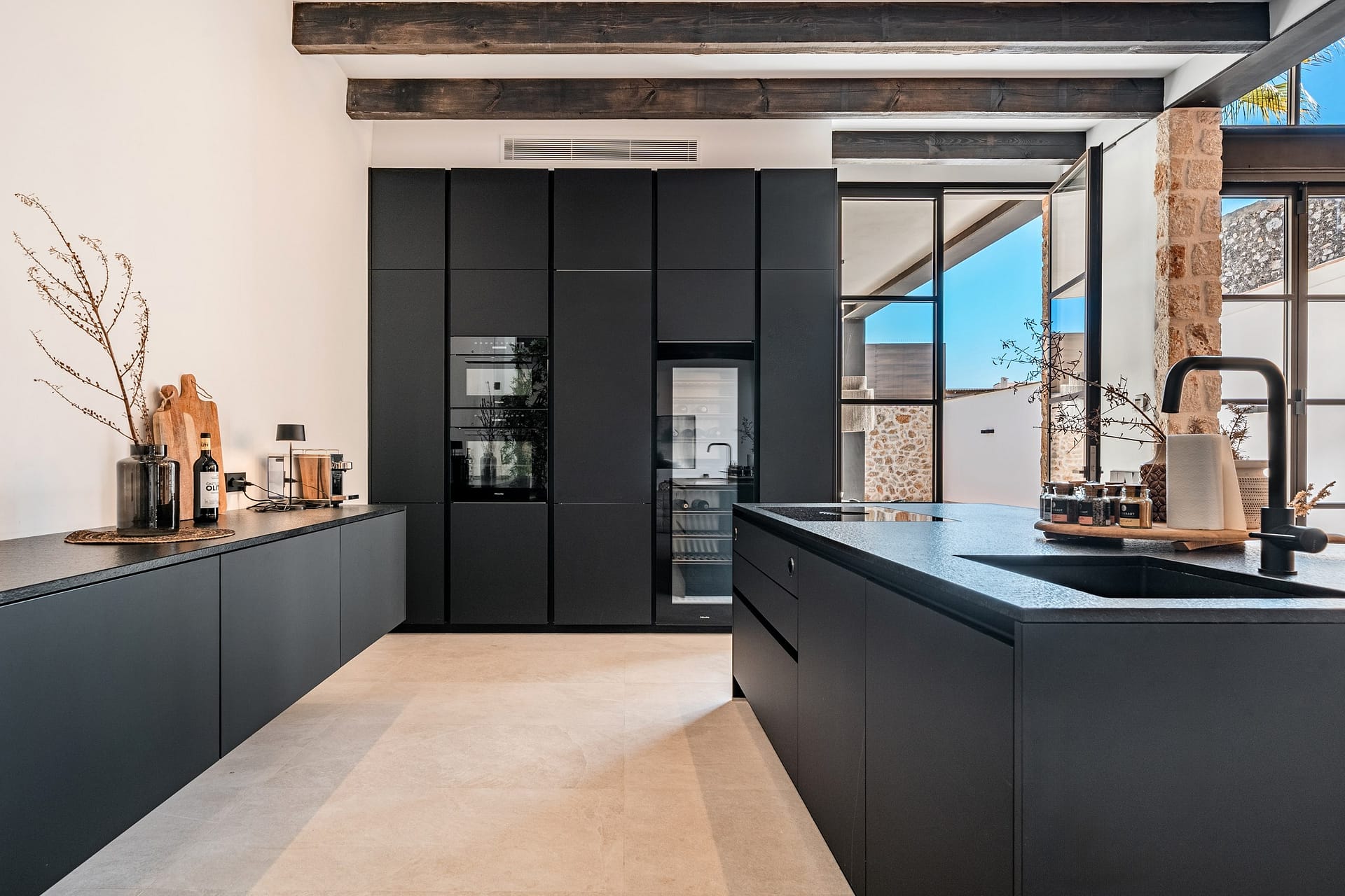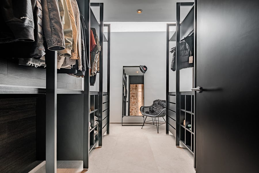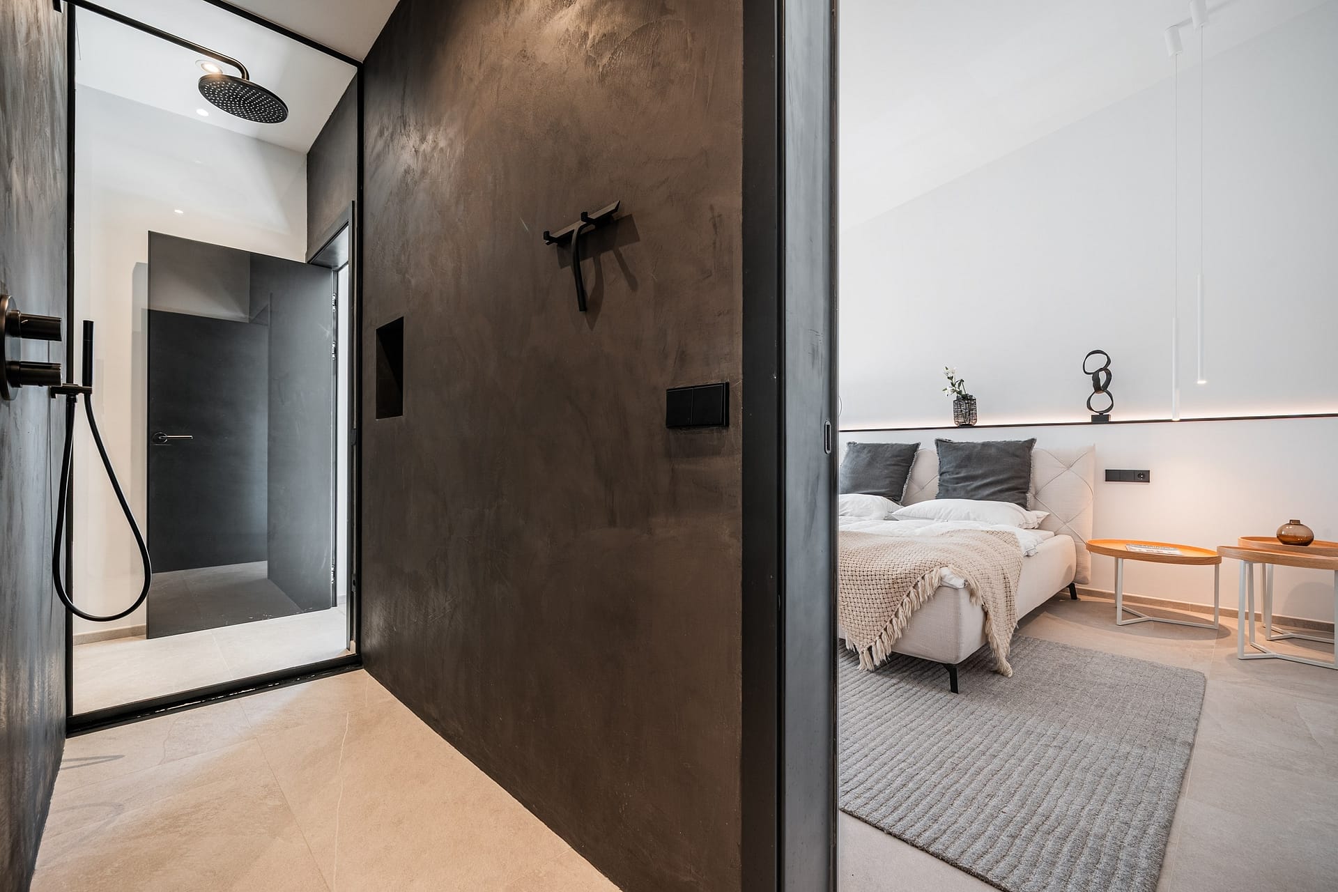 The first floor offers three bright and generously sized bedrooms, each with its own en-suite bathroomideal for those seeking a high-end townhouse in Santanyí Mallorca. The master suite stands out with a bold freestanding black bathtub and a dressing room filled with natural light.