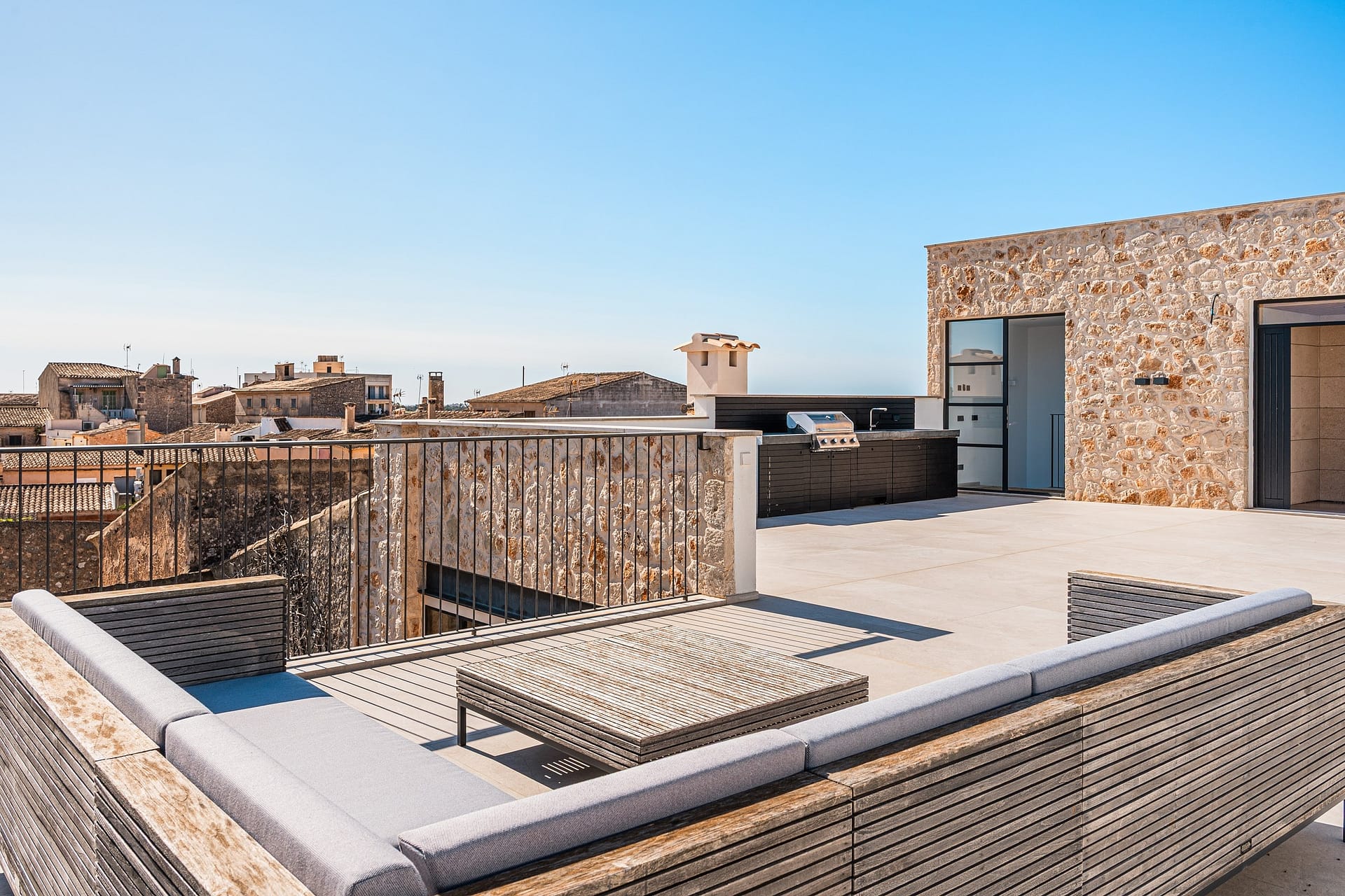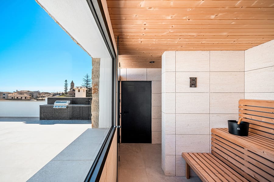 The expansive rooftop terrace is a standout feature, offering an outdoor kitchen and breathtaking panoramic views over the rooftops of Santanyí. A private sauna with adjoining shower creates a luxurious wellness area, all while enjoying views of the iconic Santanyí churchperfect for those searching for a townhouse with roof terrace and views in Mallorca.