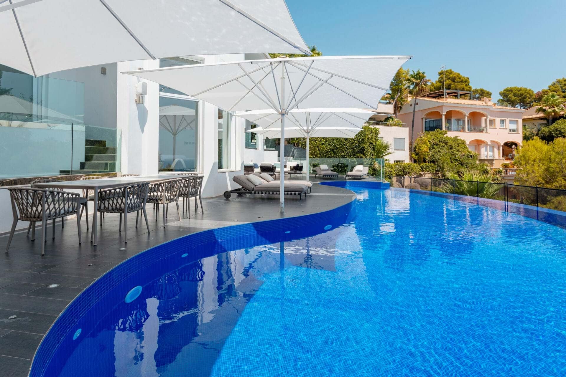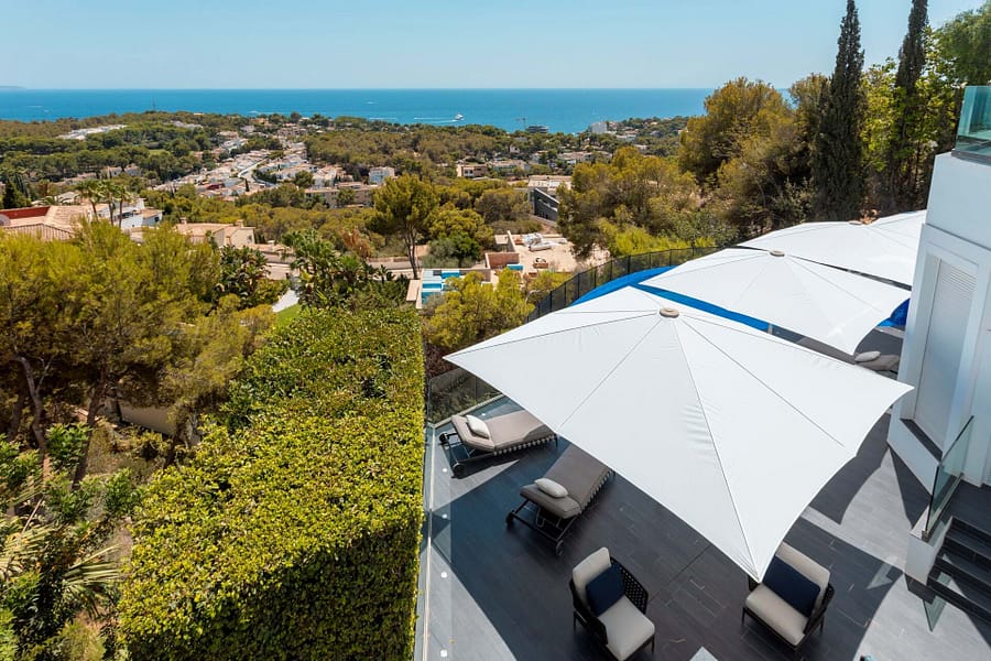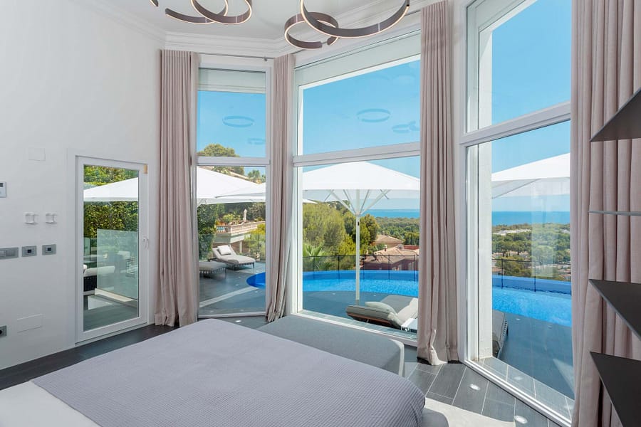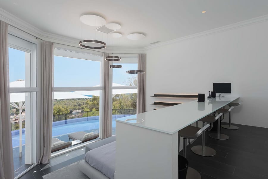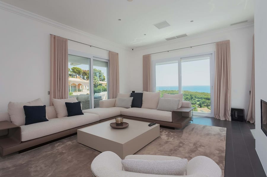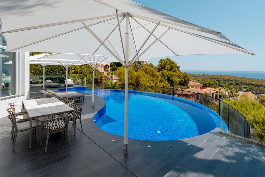 Discover the epitome of opulence in this magnificent luxury villa, perched in the prestigious Anchorage Hill of Bendinat on Mallorcas breathtaking southwest coast. Offering 438 m² of sophisticated living space, this exceptional property is situated on a 1,129 m² plot, elegantly spread across two levels. Designed to capture the essence of Mediterranean luxury, the villa boasts uninterrupted sea views across the Bay of Palma from all 5 bedrooms, 4 of which have direct access to expansive terraces. The property includes 4 beautifully appointed bathrooms and two additional WCs, providing ample space and comfort for residents and guests alike. The villas interior unfolds with a spacious living area, an elegant dining space, and a modern kitchen with a central island design. These areas flow seamlessly onto a covered terrace featuring a chill-out area, perfect for blending indoor and outdoor living. The inviting pool area is designed for relaxation, complete with lounge and dining spaces that overlook the stunning sea views, offering a serene retreat for unforgettable moments with family and friends. Every corner of this villa exudes luxury, furnished by the renowned interior design agency Terraza Balear with exclusive brands such as Minotti, B&B Italia, Poliform, Rimadesio, and Limited Edition, all enhanced by the finest Occhio lighting. The villa is also equipped with a state-of-the-art Sonos Sound System and a Home Cinema, providing an extraordinary audio-visual experience. Additional features include a storage room, a spacious parking garage, and an exterior parking space for added convenience. This luxury villa in Anchorage Hill, Bendinat, offers an unparalleled living experience in one of Mallorcas most sought-after locations. Contact us today to arrange a private viewing and explore the exquisite charm of this exceptional property.