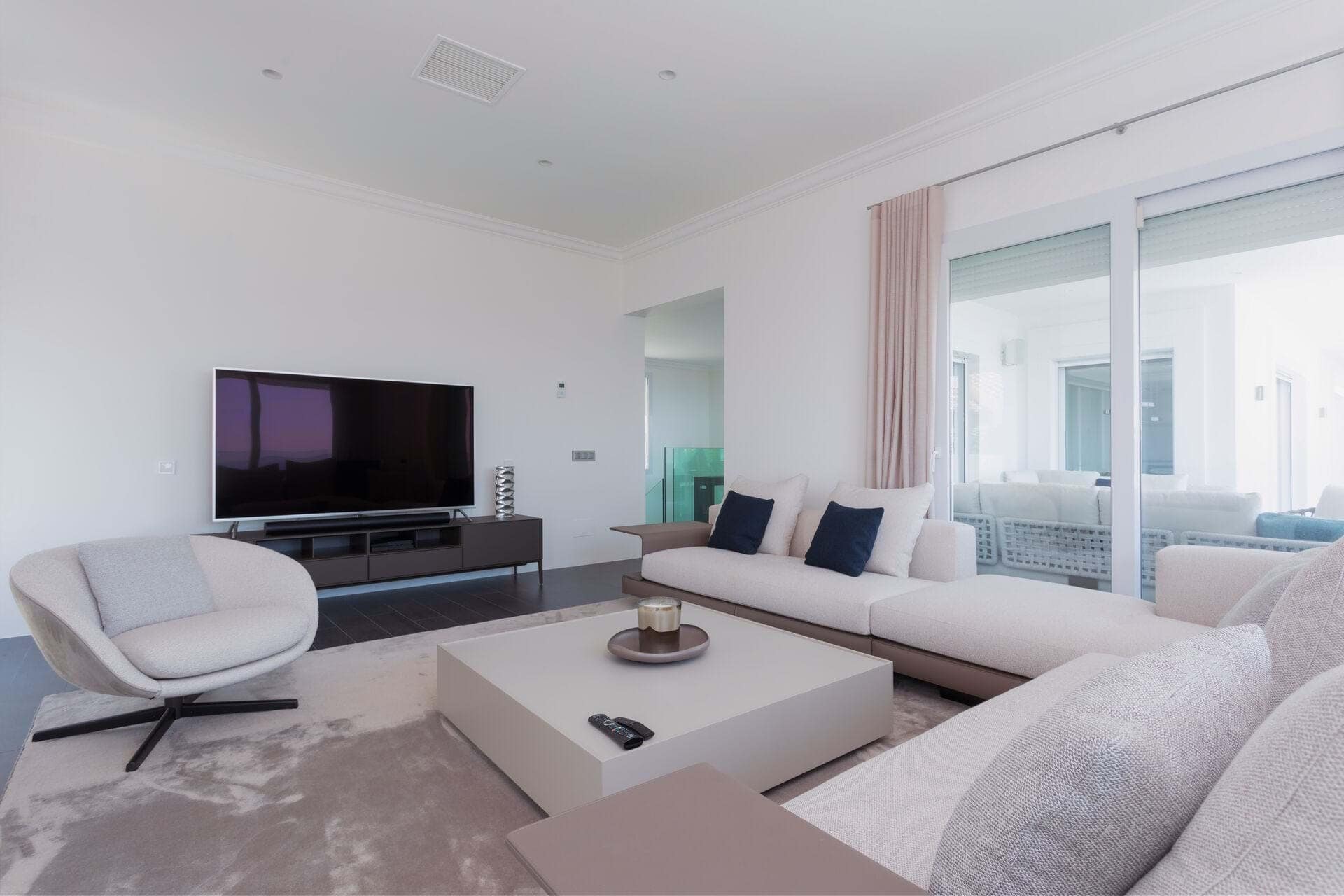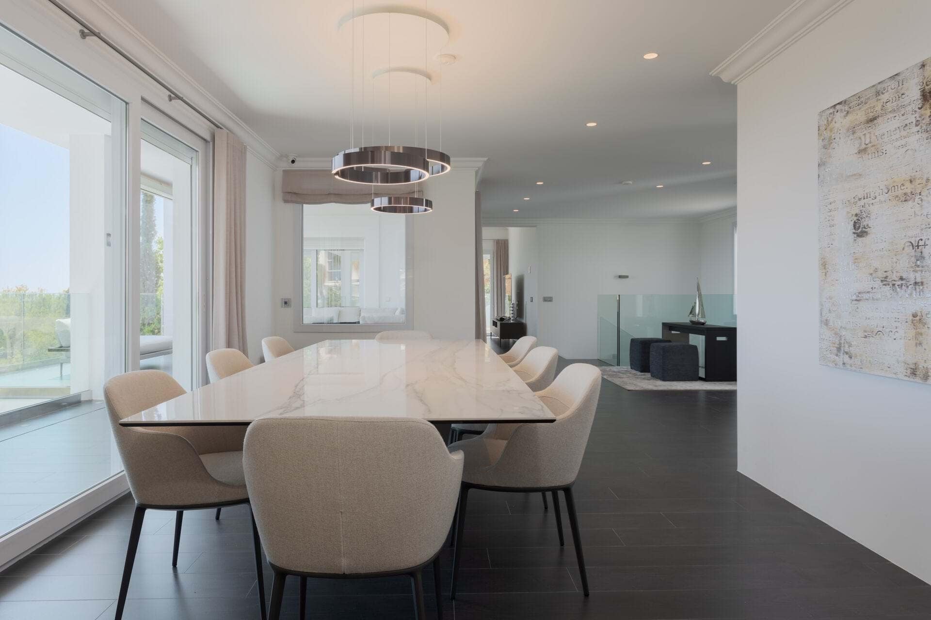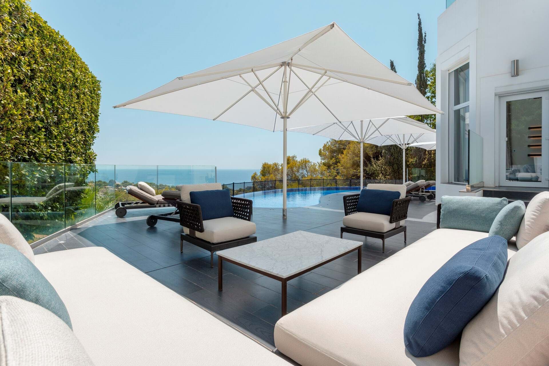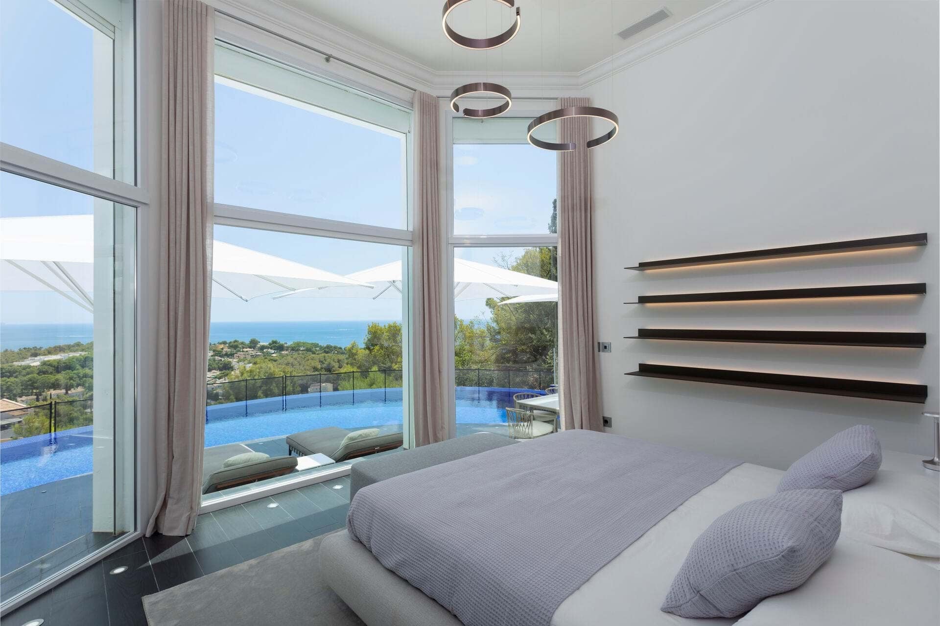 Discover the epitome of opulence in this magnificent luxury villa, perched in the prestigious Anchorage Hill of Bendinat on Mallorcas breathtaking southwest coast. Offering 438 m² of sophisticated living space, this exceptional property is situated on a 1,129 m² plot, elegantly spread across two levels. Designed to capture the essence of Mediterranean luxury, the villa boasts uninterrupted sea views across the Bay of Palma from all 5 bedrooms, 4 of which have direct access to expansive terraces. The property includes 4 beautifully appointed bathrooms and two additional WCs, providing ample space and comfort for residents and guests alike. The villas interior unfolds with a spacious living area, an elegant dining space, and a modern kitchen with a central island design. These areas flow seamlessly onto a covered terrace featuring a chill-out area, perfect for blending indoor and outdoor living. The inviting pool area is designed for relaxation, complete with lounge and dining spaces that overlook the stunning sea views, offering a serene retreat for unforgettable moments with family and friends. Every corner of this villa exudes luxury, furnished by the renowned interior design agency Terraza Balear with exclusive brands such as Minotti, B&B Italia, Poliform, Rimadesio, and Limited Edition, all enhanced by the finest Occhio lighting. The villa is also equipped with a state-of-the-art Sonos Sound System and a Home Cinema, providing an extraordinary audio-visual experience. Additional features include a storage room, a spacious parking garage, and an exterior parking space for added convenience. This luxury villa in Anchorage Hill, Bendinat, offers an unparalleled living experience in one of Mallorcas most sought-after locations. Contact us today to arrange a private viewing and explore the exquisite charm of this exceptional property.