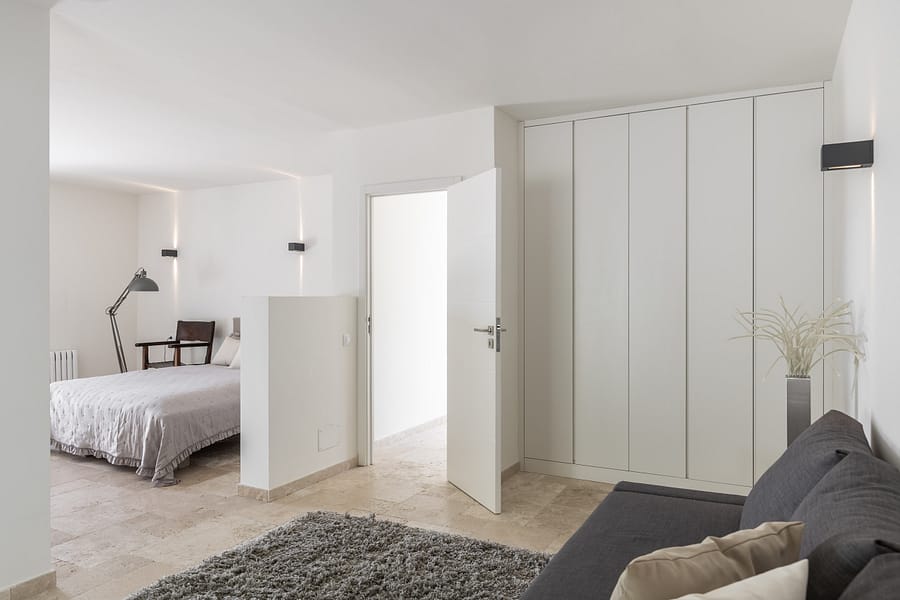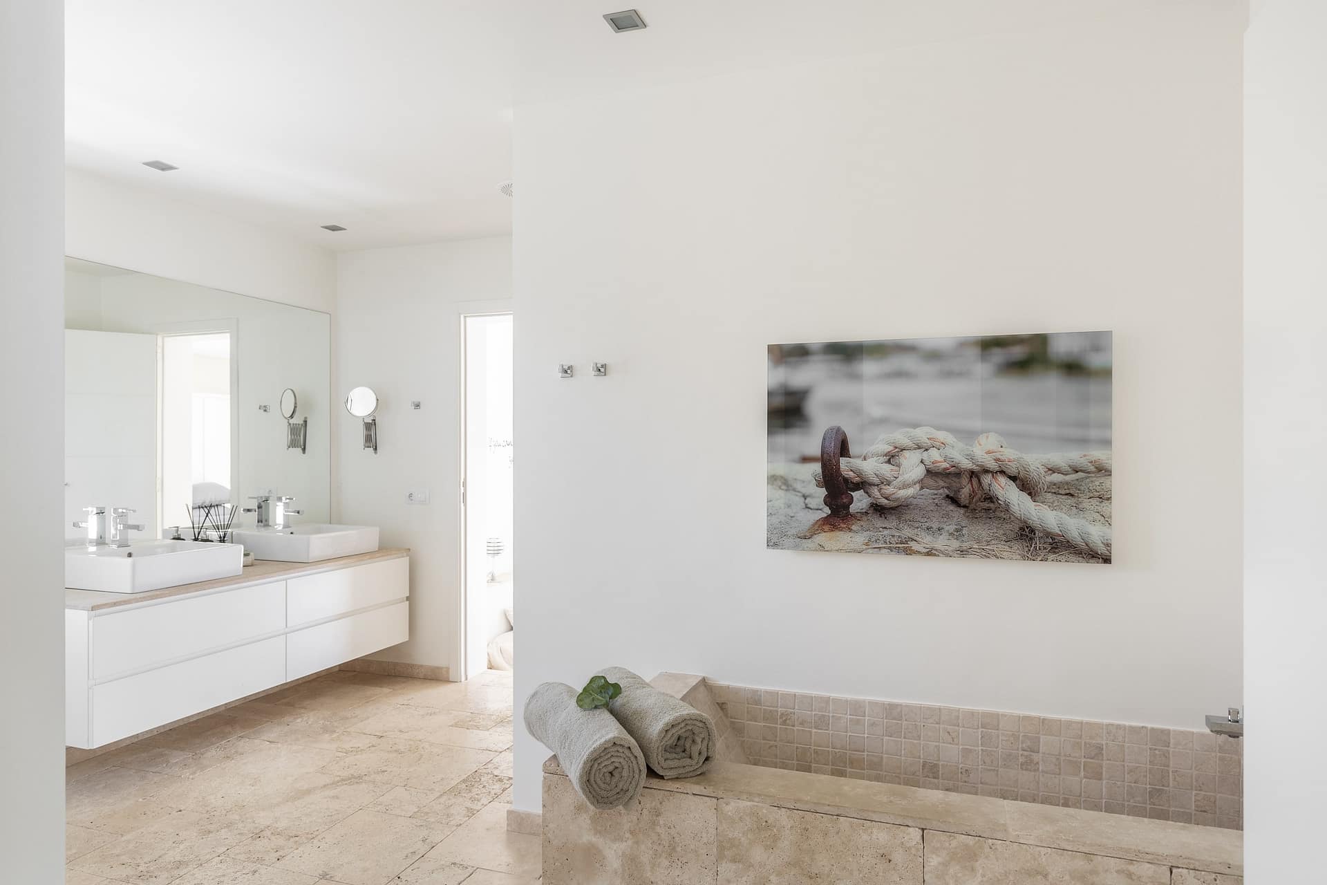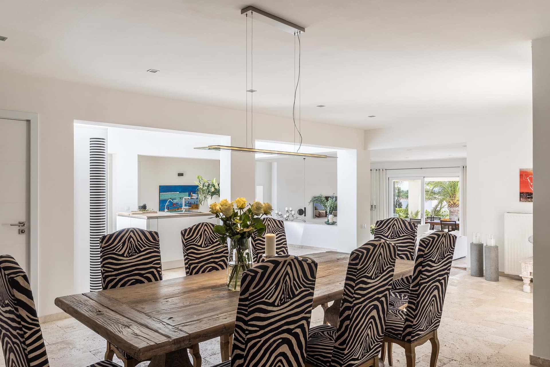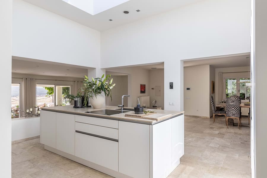 ce. Inside are five bedrooms and four bathrooms, finished with stone floors and a Nolte kitchen. Large double glazed windows fill the interiors with light and frame open views across the surroundings, with a glimpse of the sea. The villa is equipping for all seasons, with decentral air-conditioning and central oil heating ensuring comfort throughout Mediterranean Elegance the year.