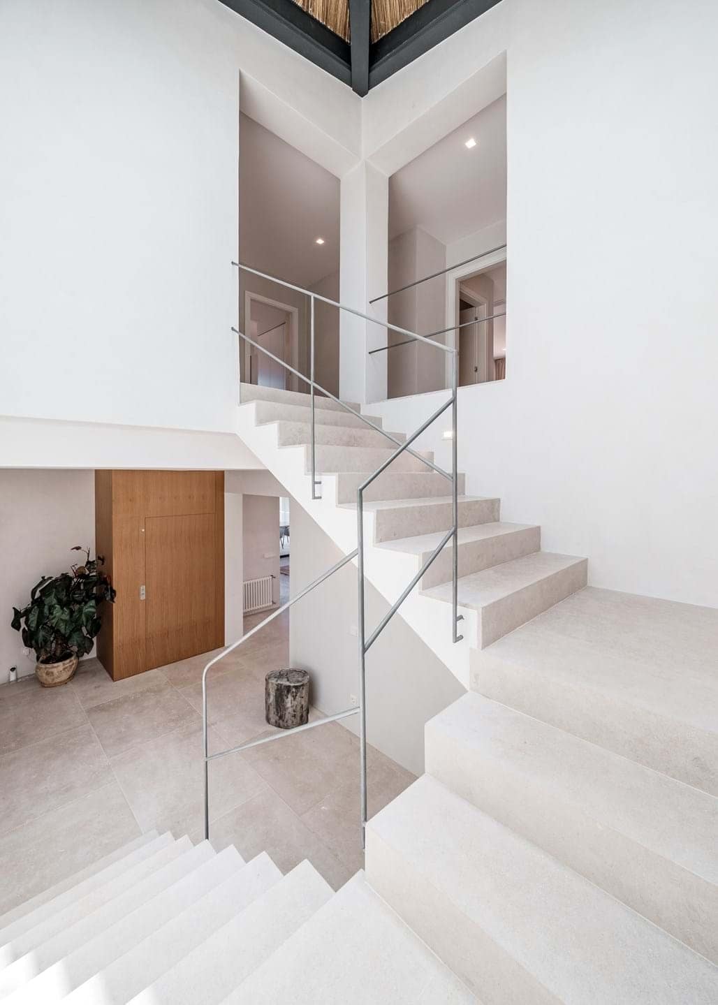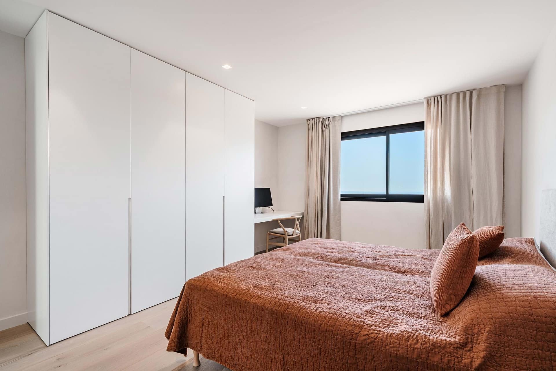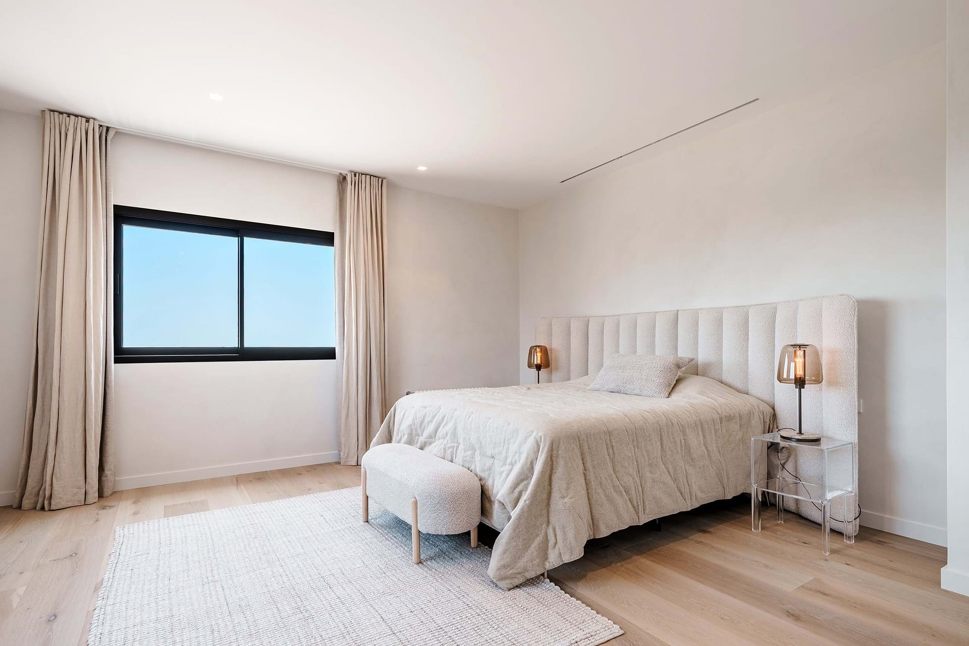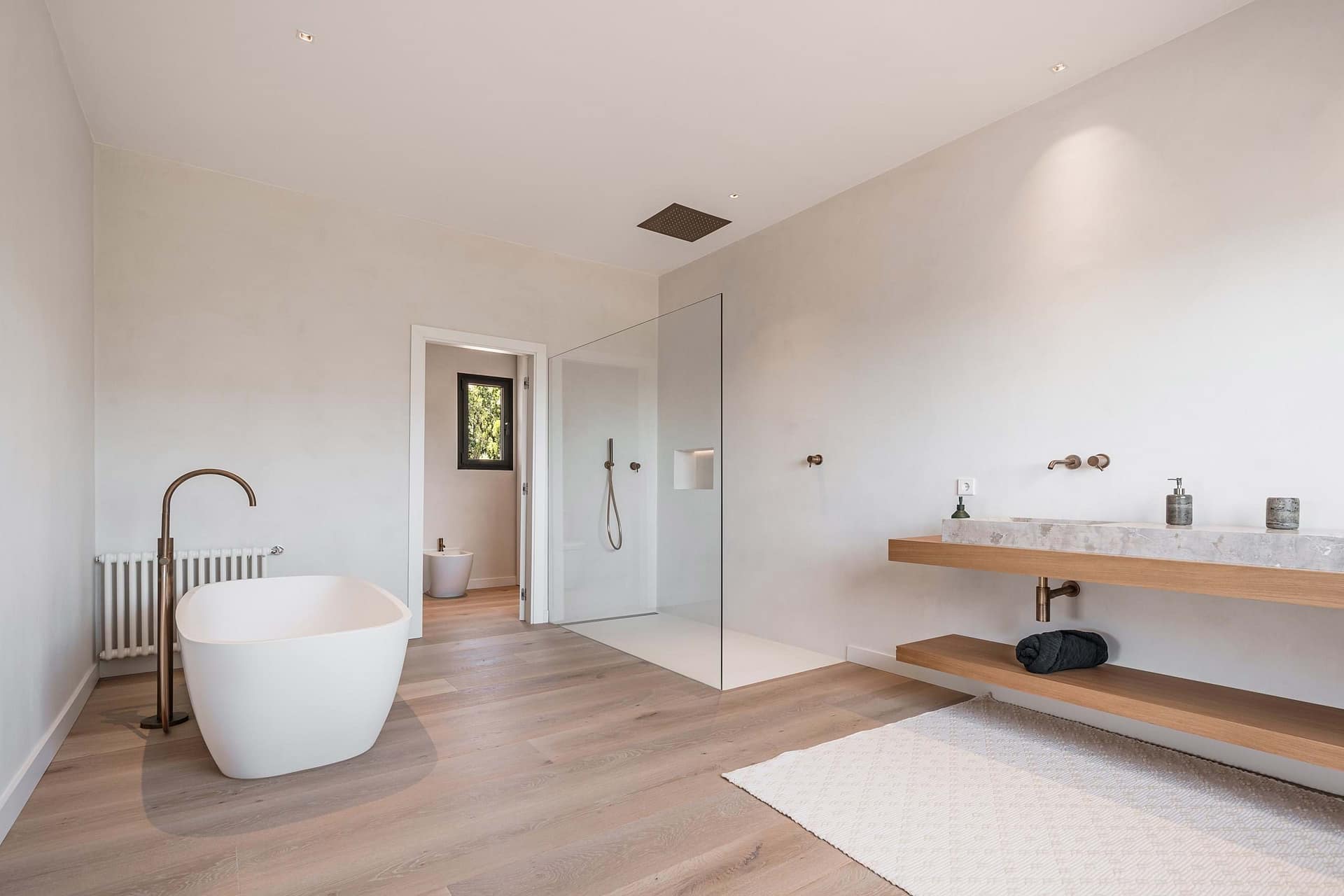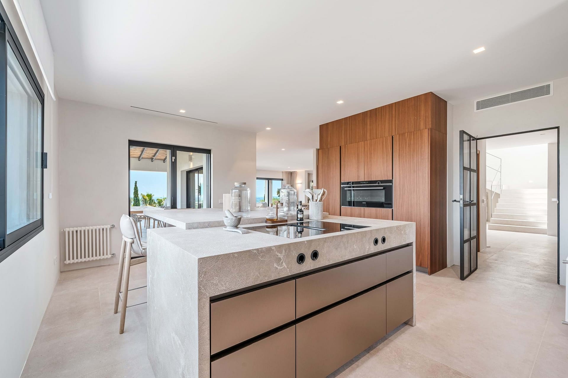Upstairs, the breathtaking views continue. There are three bedrooms on this level, each with en-suite bathrooms, oak wood parquet flooring, and elegant vanities made of Mallorcan natural stone. The two guest rooms feature built-in wardrobes, while the spacious master suite includes a walk-in dressing area with vanity, a freestanding bathtub, walk-in shower, double sink, and separate WC.
