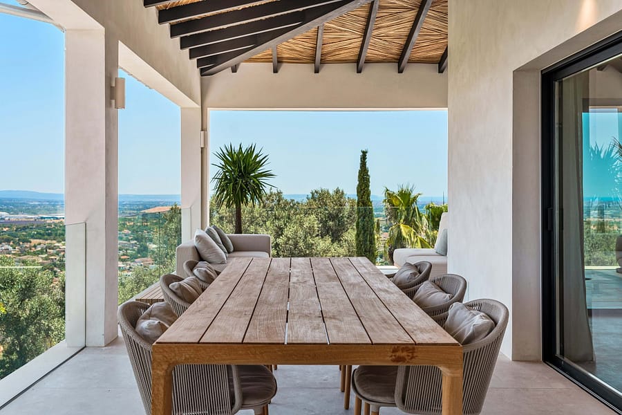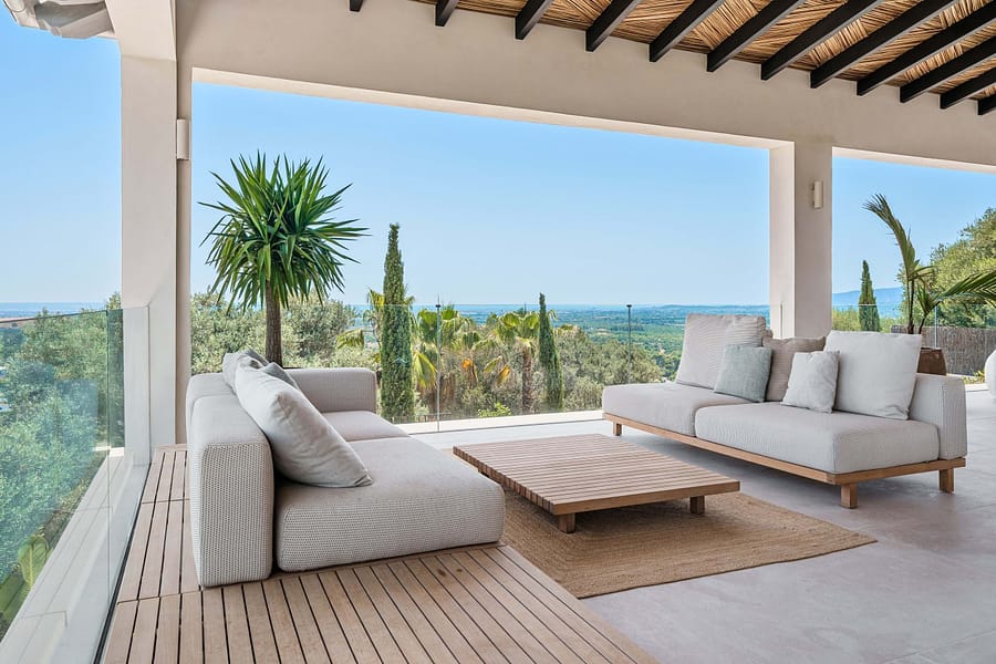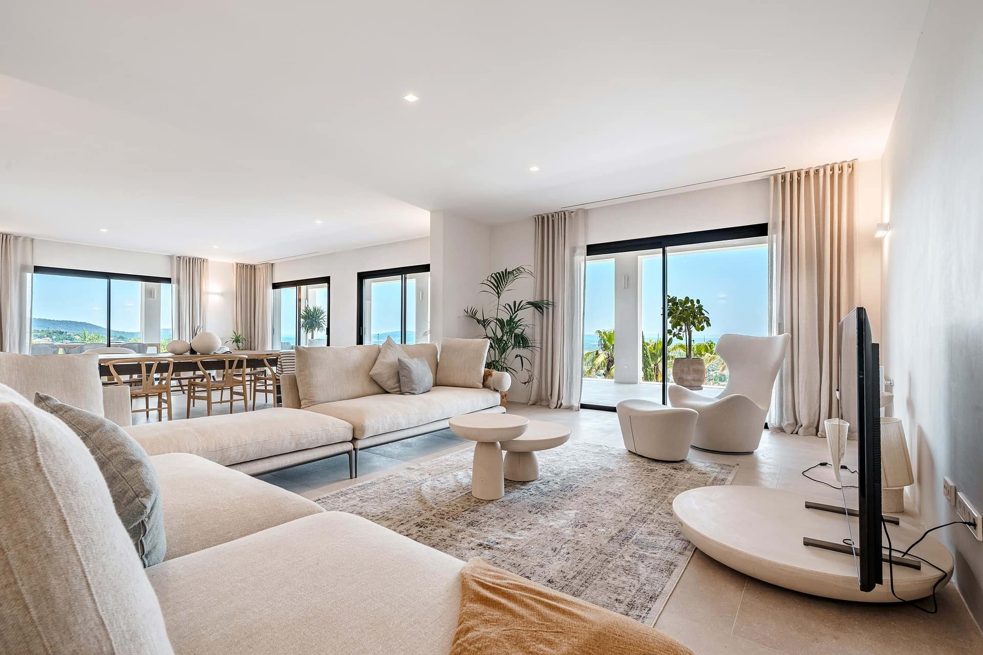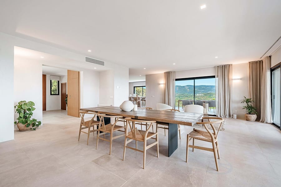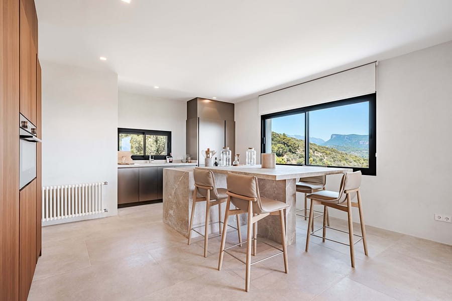The elegant Poliform kitchen, in walnut and champagne tones, was installed by Terraza Balear and features a central island crafted from Mallorcan natural stone, along with premium appliances from Miele, Siemens, and Liebherr. The adjacent living and dining areas are furnished with designer pieces by Terraza Balear and include a Sony 75 TV. The covered veranda, with its handcrafted bamboo and cañizo-style roof design and exclusive outdoor furniture by Tribù, is an ideal space for relaxing and entertaining.