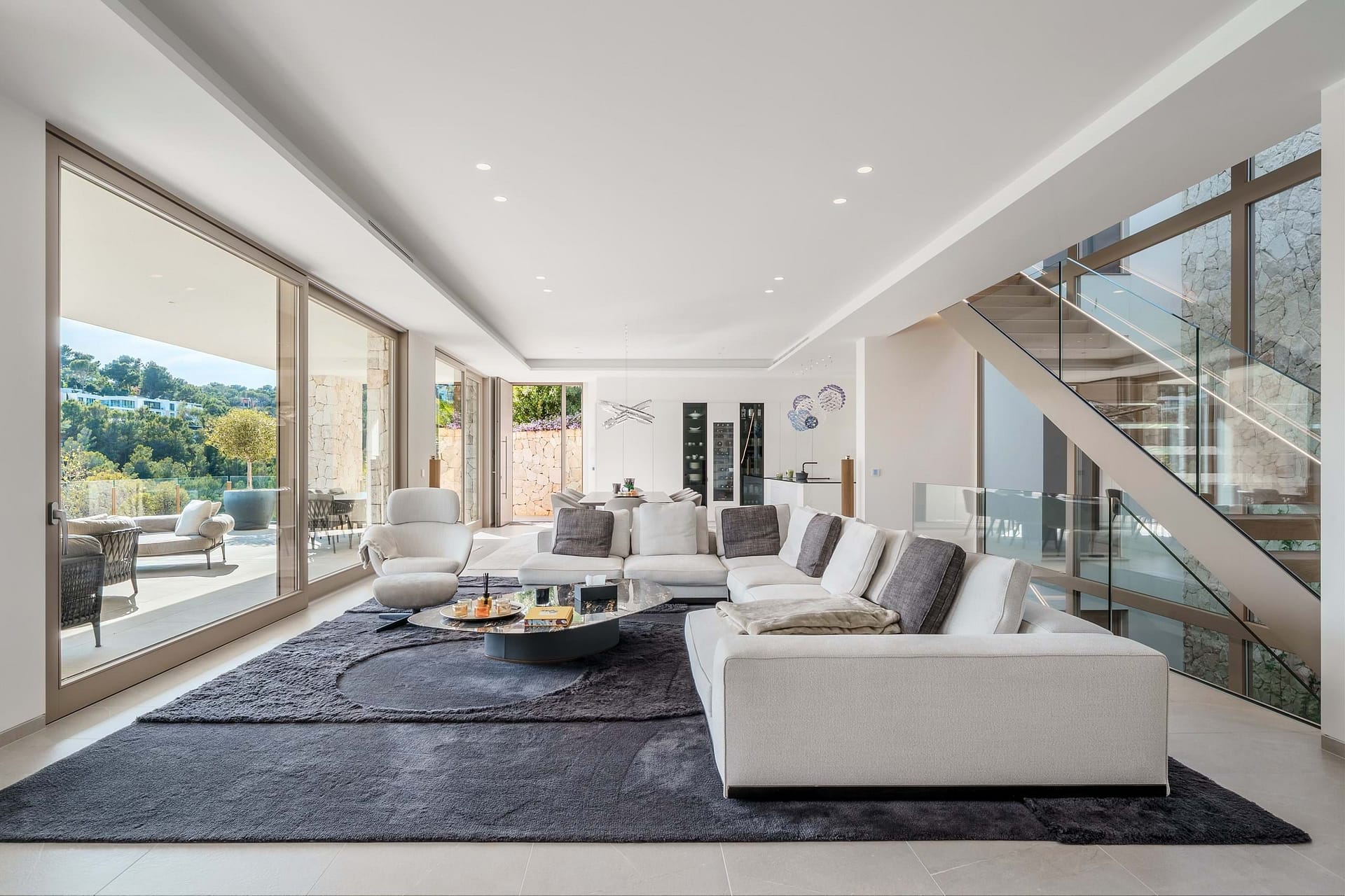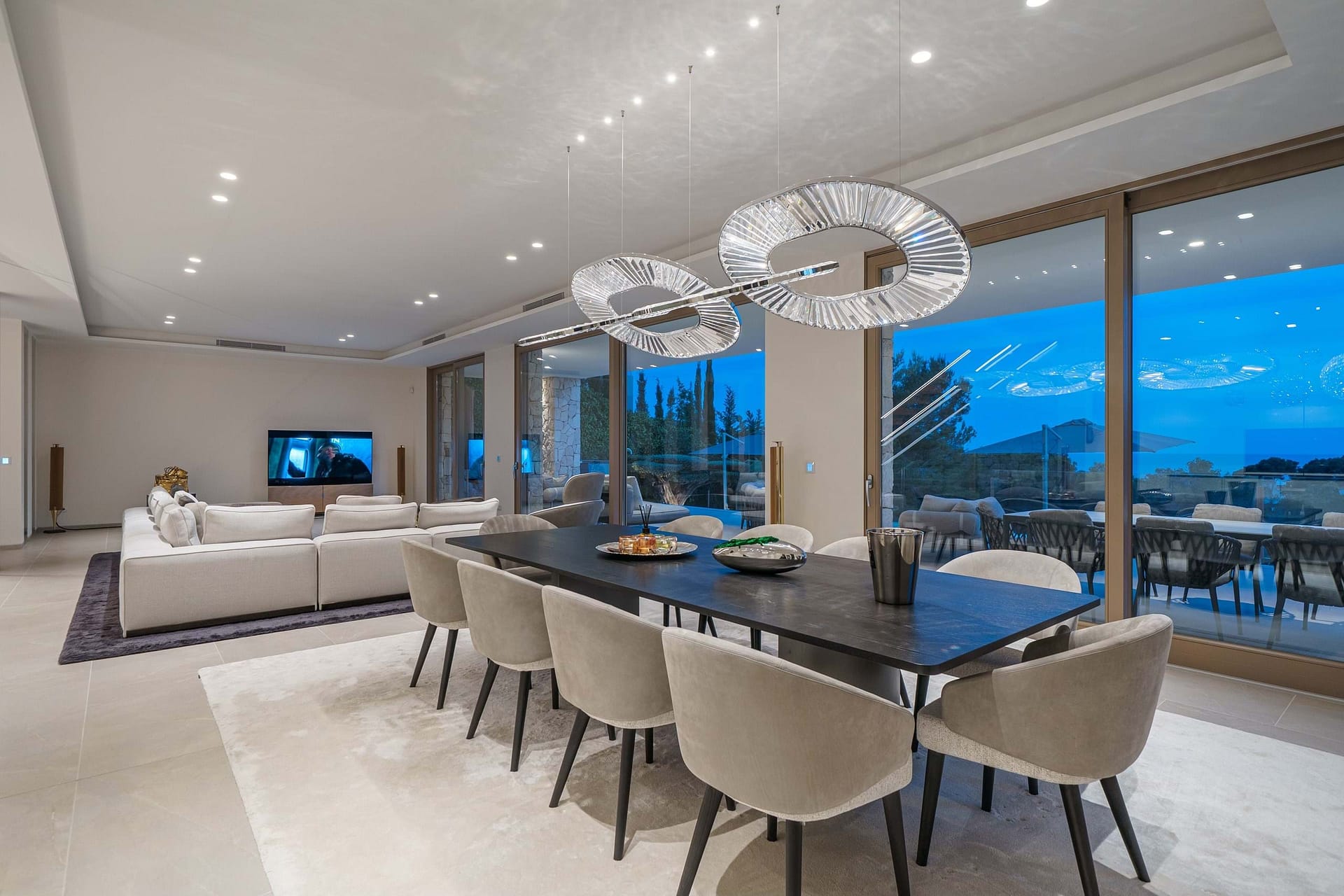 Set on a 1,057 m² plot with a total area of around 679 m², the villa spans three levels. The architectural concept combines high-quality natural materials with sleek contemporary lines, and an open, light-filled space. The spacious living area on the ground floor forms the heart of the house. It includes a glamorous living room, a dining area with seating for ten people, and an open kitchen all effortlessly connected to the expansive terrace and the elegant infinity pool.