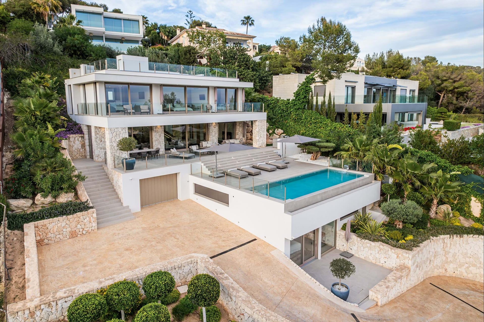 Set on a 1,057 m² plot with a total area of around 679 m², the villa spans three levels. The architectural concept combines high-quality natural materials with sleek contemporary lines, and an open, light-filled space. The spacious living area on the ground floor forms the heart of the house. It includes a glamorous living room, a dining area with seating for ten people, and an open kitchen all effortlessly connected to the expansive terrace and the elegant infinity pool.