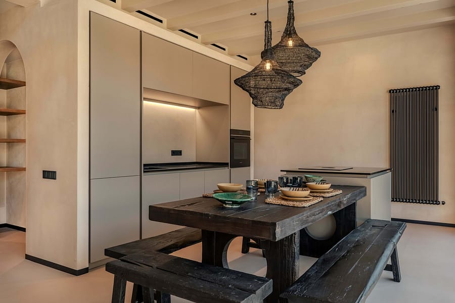 The villa has been built using premium materials and advanced systems, including aluminum exterior carpentry with thermal break, high-performance glazing, continuous MicroQuarz flooring for both interiors and exteriors, natural lime-based wall finishes, and an efficient aerothermal system for heating, cooling and hot water. Additional features such as ducted air conditioning, low-temperature radiators and a wood-burning fireplace ensure year-round comfort.