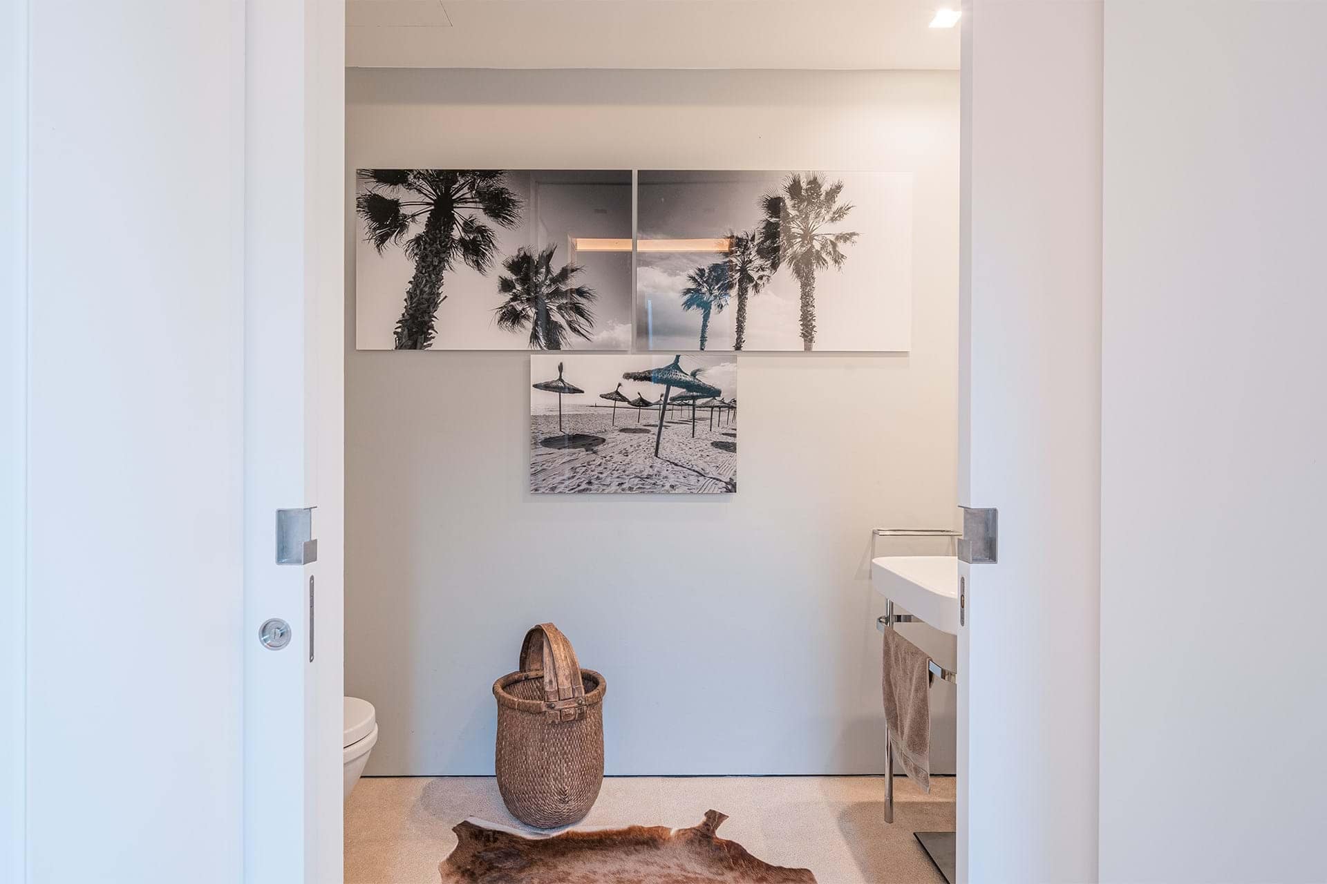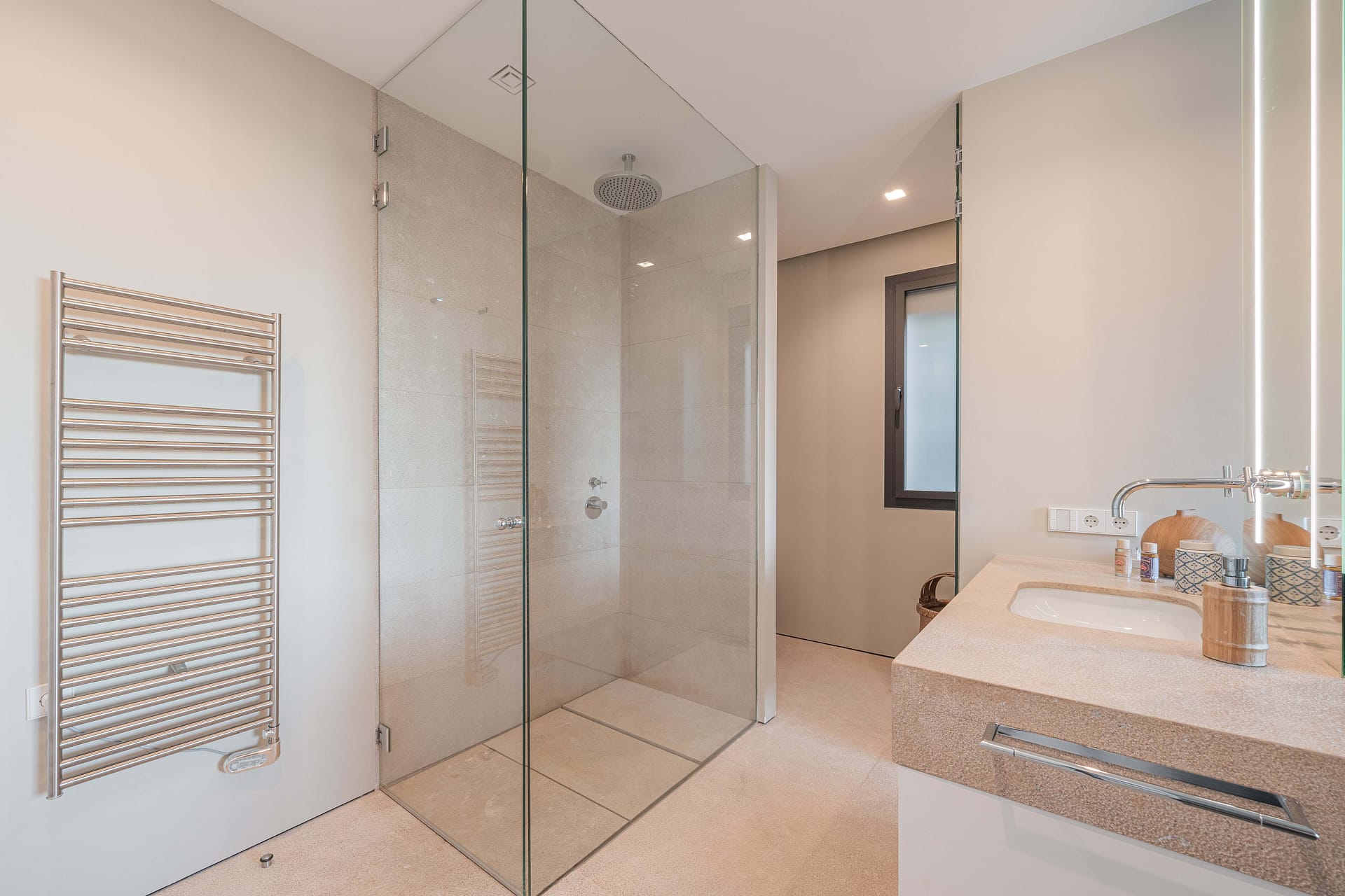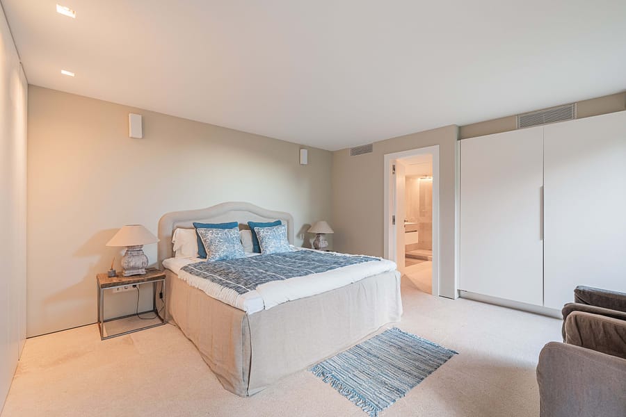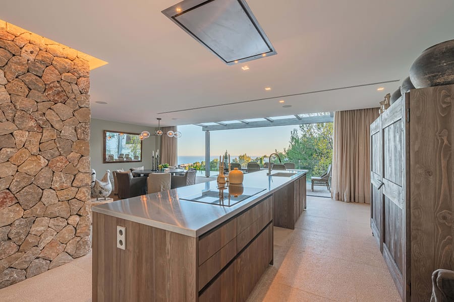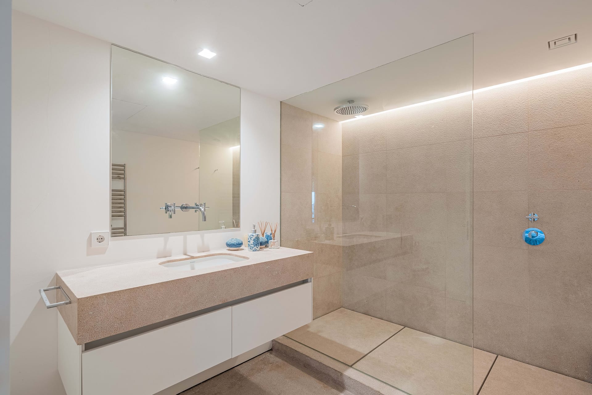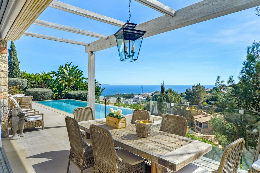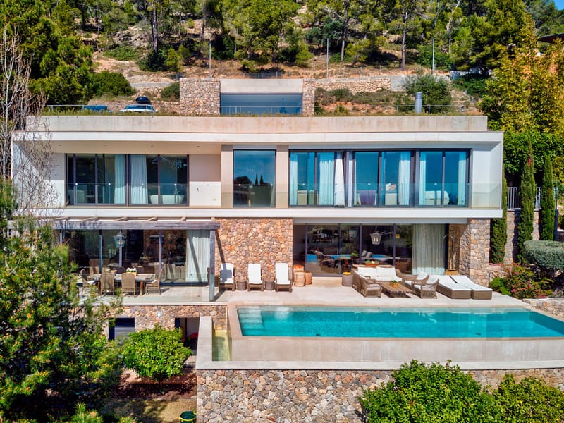 Set in the exclusive residential neighbourhood of Genova, one of Palma’s most sought after neighbourhoods by foreign investors, residents or foreigners looking to relocate and require a central location, in the capital city, for all year round living, close to amenities and infrastructures. This villa offers panoramic sea views over the Bay of Palma, a modern architecture, with a Mediterranean touch and Scandinavian influences, it’s light flooded, warm, cosy and elegant, with two entrances: the main entrance on the roof-terrace, where you’ll find a carport, whereas the second entrance is at the bottom of the property, where you’ll find a garage and a staircase through the garden that leads to the pool terrace and the entrance to the living area. The villa is distributed on 3 levels, on the first floor you’ll find 4 bedrooms: the spacious master bedroom with a bathroom ensuite, 2 guest bedrooms that share a bathroom and a fourth bedroom with bathroom ensuite, on the ground floor you’ll find a spacious living room and an open plan, designer kitchen, a laundry room and a dining area next to the kitchen and outside on the spacious terrace. The pool area is also stunning, overlooking the bay of Palma and the historical village of Genova, where beautiful modern villas coexist with the old Majorcan, charming houses and Spanish architecture. below the pool area you’ll also find a guest or staff apartment and a tidy, manicured sub-tropical garden. Genova is also well known for its traditional Majorcan meat restaurants: Casa Jacinto, Lume & Co, Meson La Rueda, Can Pedro, to name but a few. Also, you can access hiking paths, ideal for dog walking and foraging for seasonal asparagus and mushrooms. This property is perfect for sun lovers and the various terraces offer the best place for sundowners in the evening watching the sunset. Additional features include: a garage, underfloor heating, wooden floors, natural stone countertops and air conditioning.