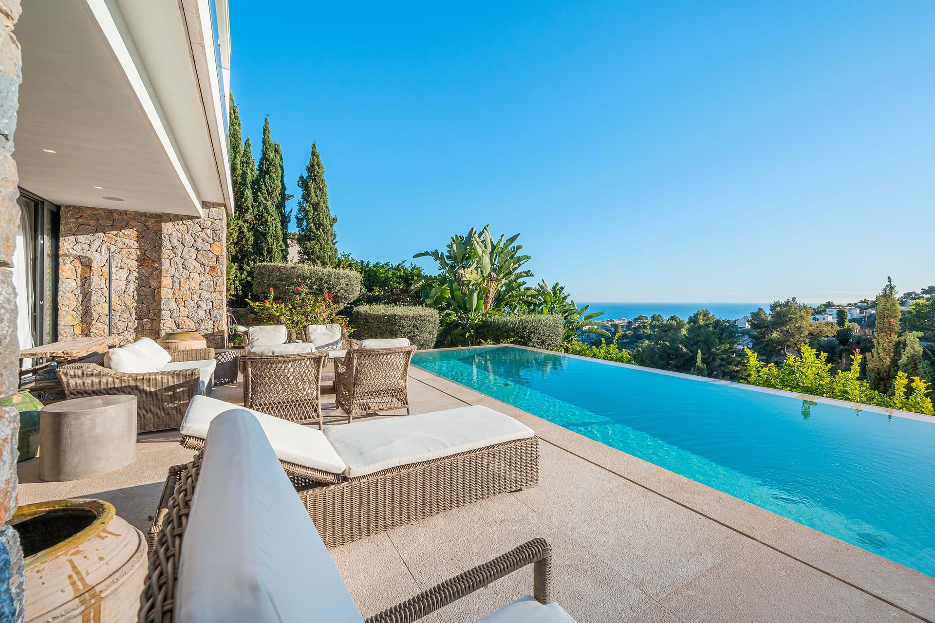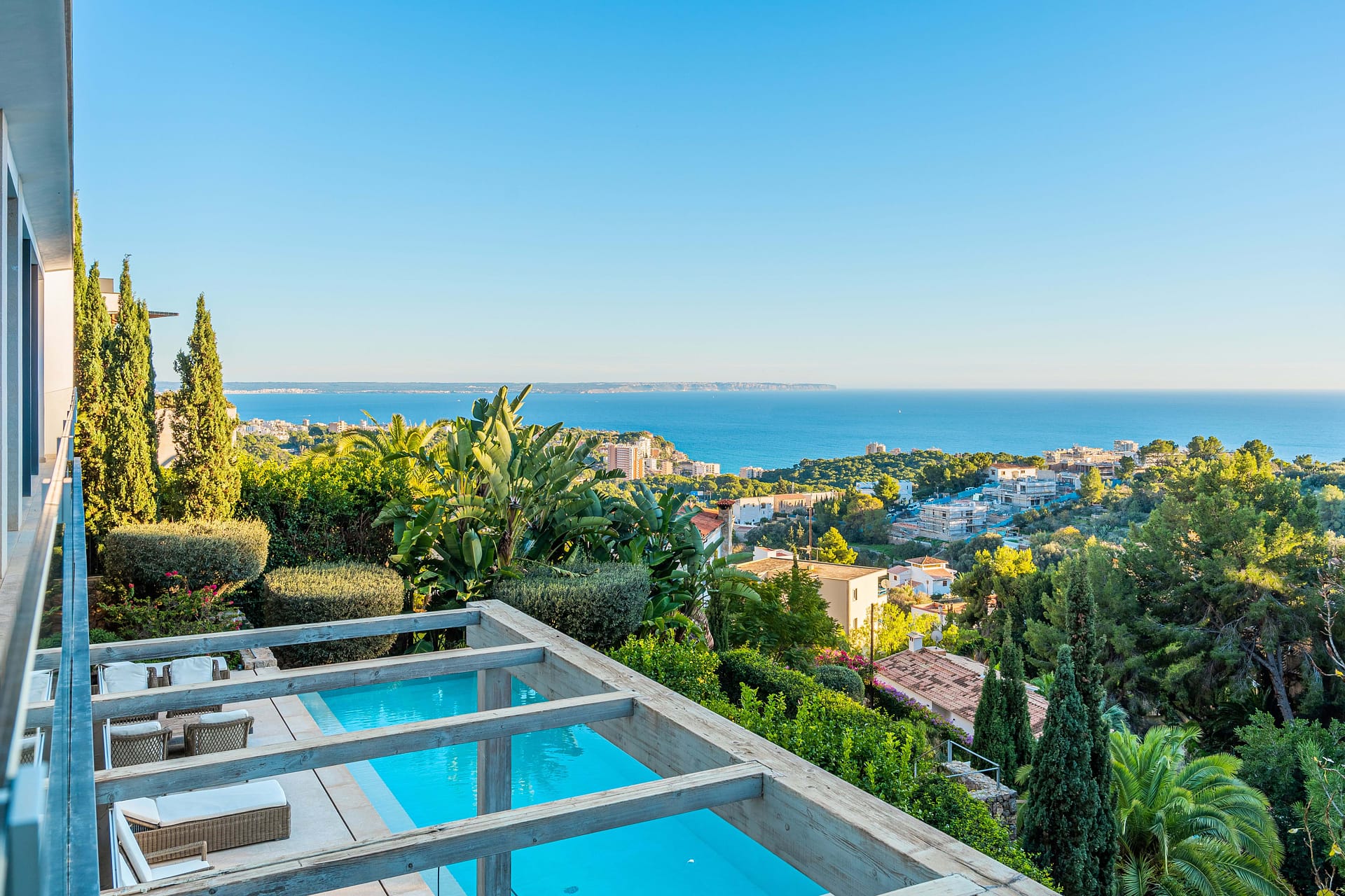 Set in the exclusive residential neighbourhood of Genova, one of Palma’s most sought after neighbourhoods by foreign investors, residents or foreigners looking to relocate and require a central location, in the capital city, for all year round living, close to amenities and infrastructures. This villa offers panoramic sea views over the Bay of Palma, a modern architecture, with a Mediterranean touch and Scandinavian influences, it’s light flooded, warm, cosy and elegant, with two entrances: the main entrance on the roof-terrace, where you’ll find a carport, whereas the second entrance is at the bottom of the property, where you’ll find a garage and a staircase through the garden that leads to the pool terrace and the entrance to the living area. The villa is distributed on 3 levels, on the first floor you’ll find 4 bedrooms: the spacious master bedroom with a bathroom ensuite, 2 guest bedrooms that share a bathroom and a fourth bedroom with bathroom ensuite, on the ground floor you’ll find a spacious living room and an open plan, designer kitchen, a laundry room and a dining area next to the kitchen and outside on the spacious terrace. The pool area is also stunning, overlooking the bay of Palma and the historical village of Genova, where beautiful modern villas coexist with the old Majorcan, charming houses and Spanish architecture. below the pool area you’ll also find a guest or staff apartment and a tidy, manicured sub-tropical garden. Genova is also well known for its traditional Majorcan meat restaurants: Casa Jacinto, Lume & Co, Meson La Rueda, Can Pedro, to name but a few. Also, you can access hiking paths, ideal for dog walking and foraging for seasonal asparagus and mushrooms. This property is perfect for sun lovers and the various terraces offer the best place for sundowners in the evening watching the sunset. Additional features include: a garage, underfloor heating, wooden floors, natural stone countertops and air conditioning.