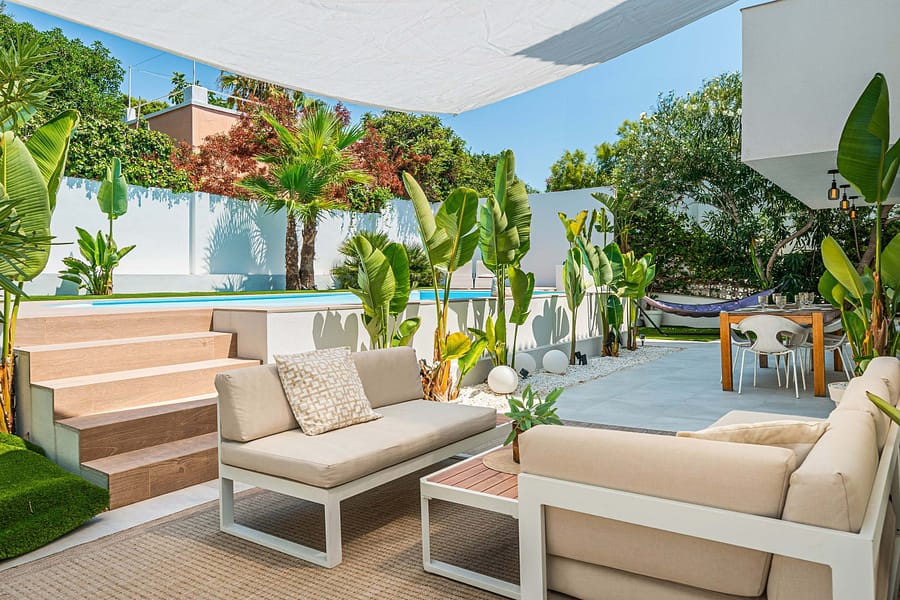 Outside is the star of the home, with a large terrace set up like an outdoor living room. A hammock for slow afternoons, multiple loungers around the pool, and a dining table for al fresco dining. The garden is lush and tropical, with vibrant greenery that gives the place a private, resort-like vibe.