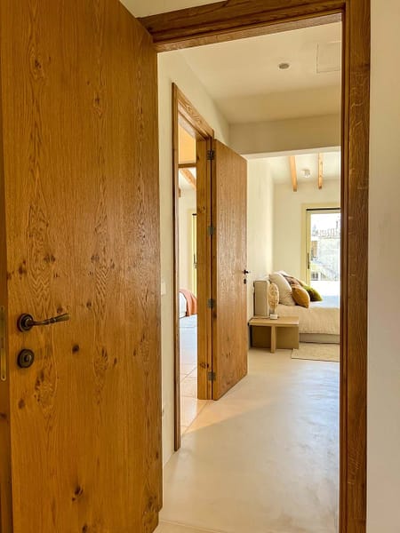 Additionally, traditional wooden elements contrast harmoniously with modern micro-cement flooring, creating a calm and sophisticated atmosphere that feels timeless yet fresh.