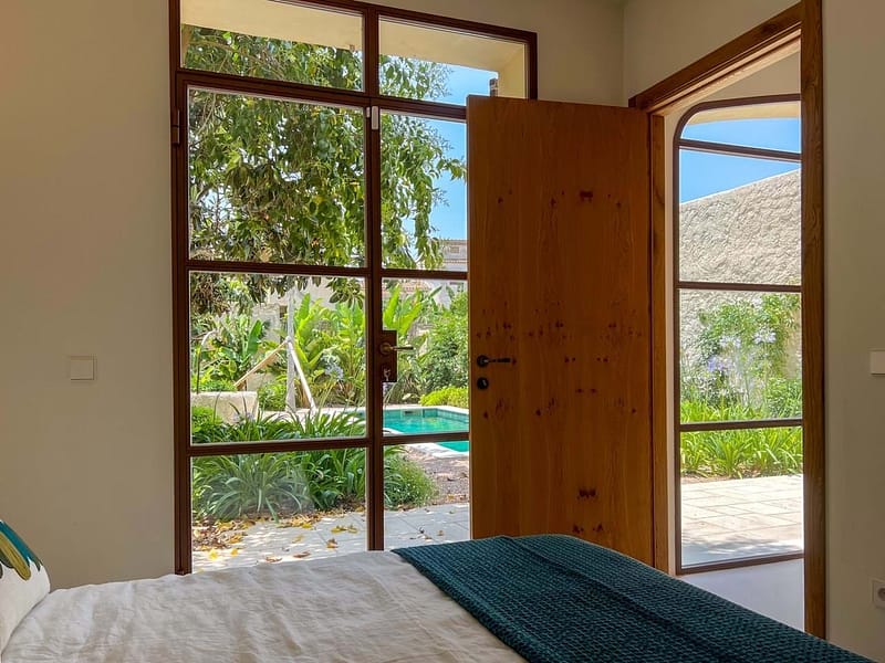 Upstairs, two further bedrooms enjoy access to a shared terrace overlooking the garden and pool. One features its own en suite bathroom, while the other offers a spacious dressing room.