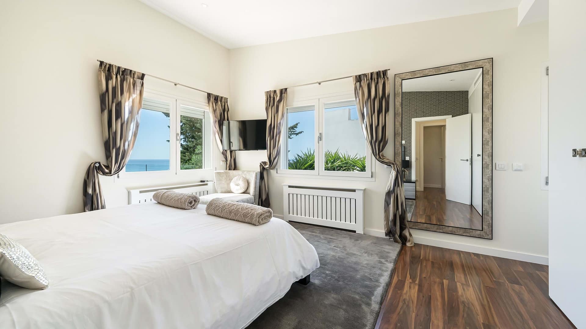 The home features five spacious bedrooms, 3 bathrooms, a guest WC, an elegant open-plan living and dining area, a fully fitted kitchen, ample storage. A versatile garage currently used as a private fitness room. Expansive floor-to-ceiling windows maximise natural light and frame panoramic coastal views, creating a bright and welcoming atmosphere.