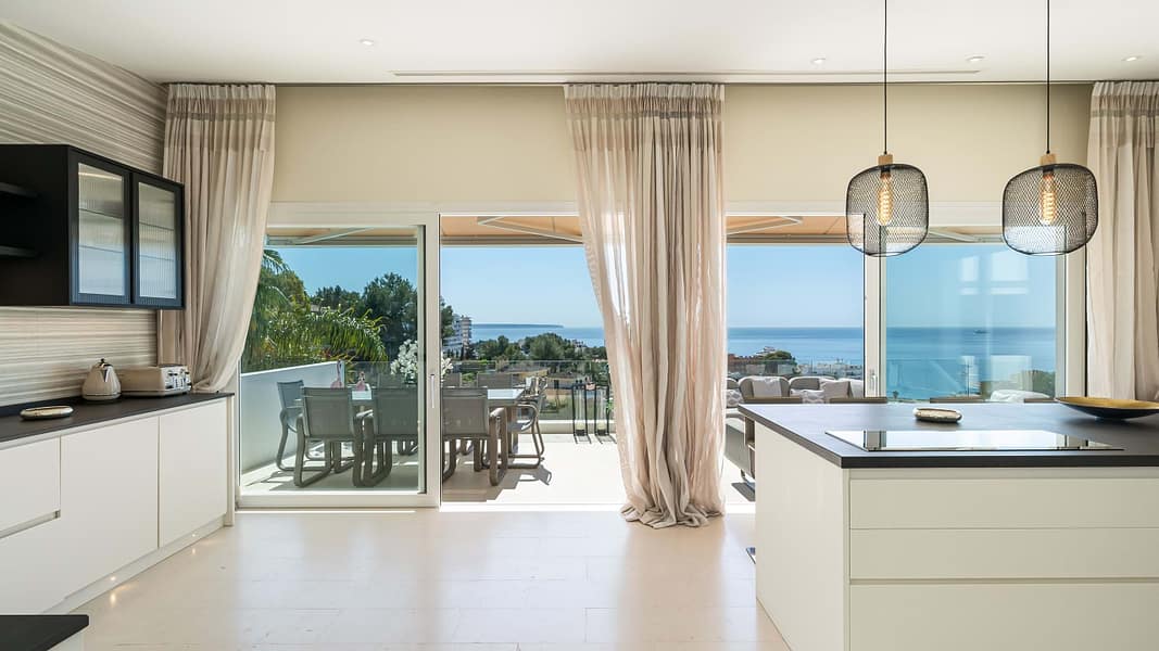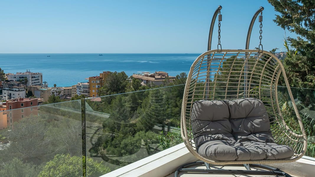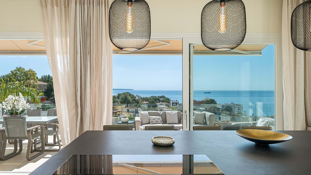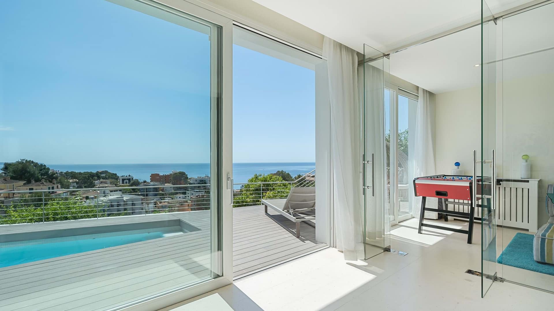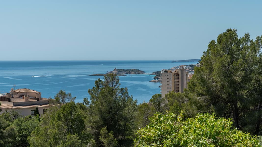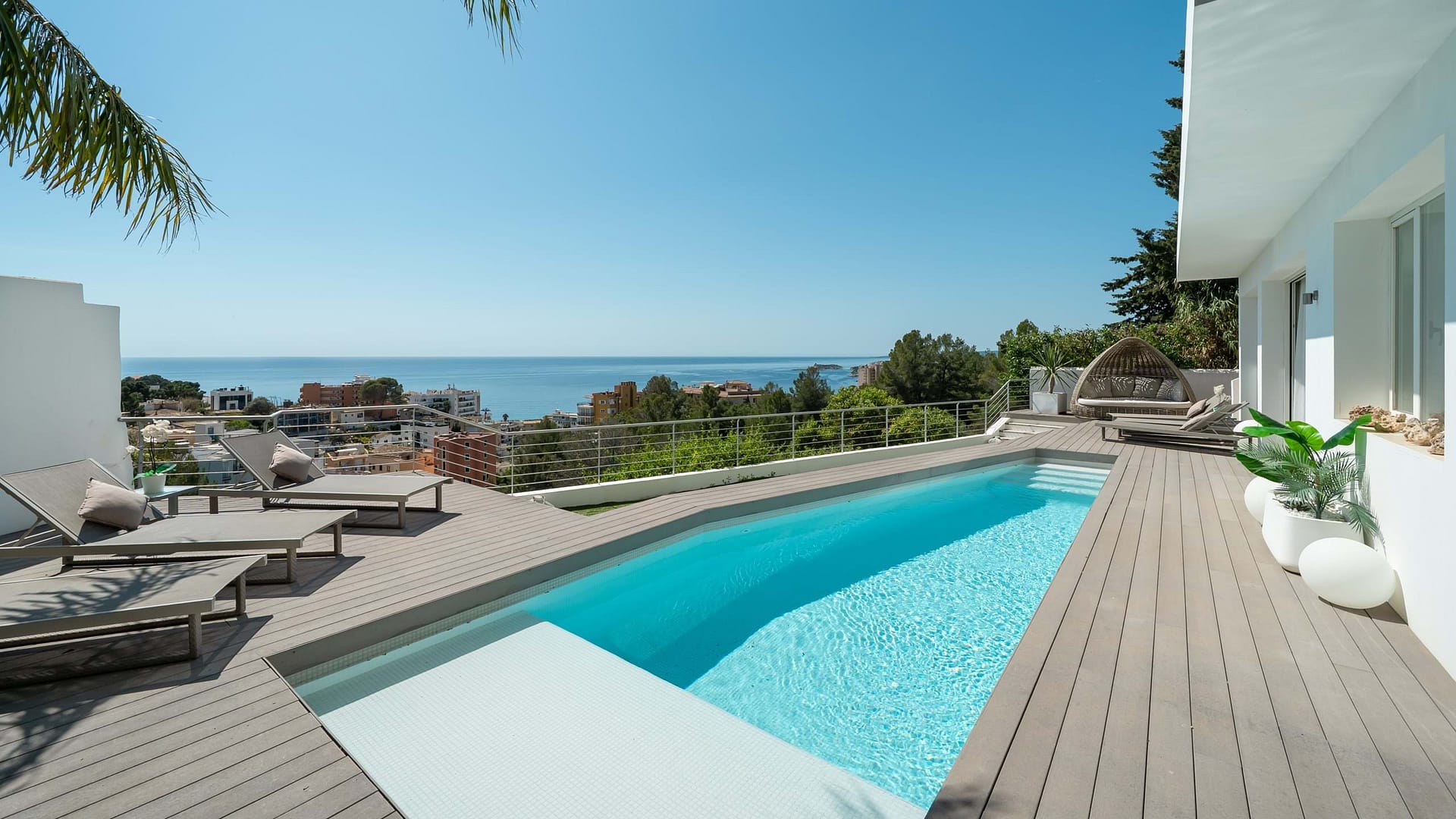 This beautifully appointed family villa for sale in Cala Mayor, Mallorca enjoys an elevated position with spectacular sea views and year-round Mediterranean light.