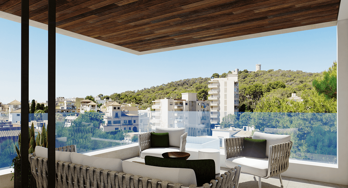 Welcome to Bellver Park Apartments, where you can enjoy the perfect combination of luxury and convenience. Each apartment boasts a well-thought-out layout that leads to exterior south-facing porches and terraces, both covered and uncovered, offering spectacular views of Mallorca’s beautiful landscape. This apartment can be built with two or three bedrooms, depending on one’s needs. With a living space of 72m2 and terraced area of 59m2, this spacious apartment gives you the ultimate comfort. With underfloor heating and air-conditioning throughout the apartment, ensuring your comfort no matter the season. Indirect lighting, stone floors, and top-of-the-line appliances are just a few of the features that enhance the quality of life in the Bellver Oaks apartments. The large floor-to-ceiling windows and doors allow natural light to flood into the apartment, creating a bright and airy atmosphere. You’ll love spending time on your private balcony, enjoying the in-out-living that comes naturally in Mallorca’s perfect climate. At Bellver Park, they believe in elegant sharing spaces that promote community and relaxation. The gardens and pool area are the perfect example of this, providing ample space for residents to relax and unwind. Living in Palma means embracing a relaxed cosmopolitan lifestyle as Bellver Park is perfectly situated near to all amenities to provide you with everything you need. A short stroll away, you will find a range of shops, stores, and restaurants. Take a morning walk along the beach boulevard, have lunch at the yacht club, or spend quality time with friends at one of Palma’s numerous restaurants in the old town.