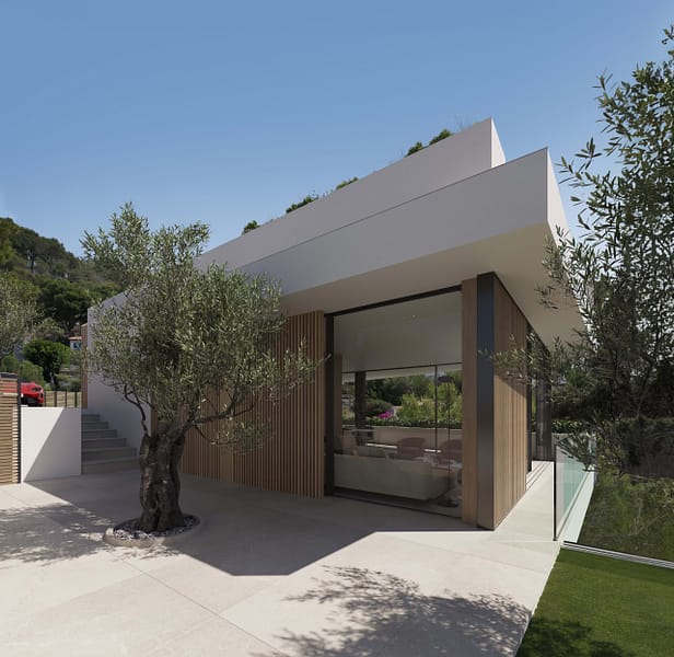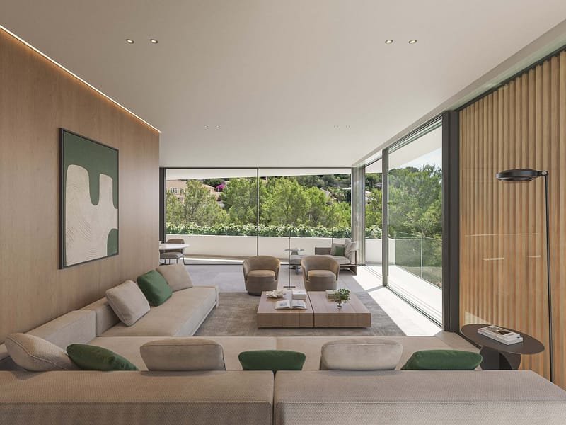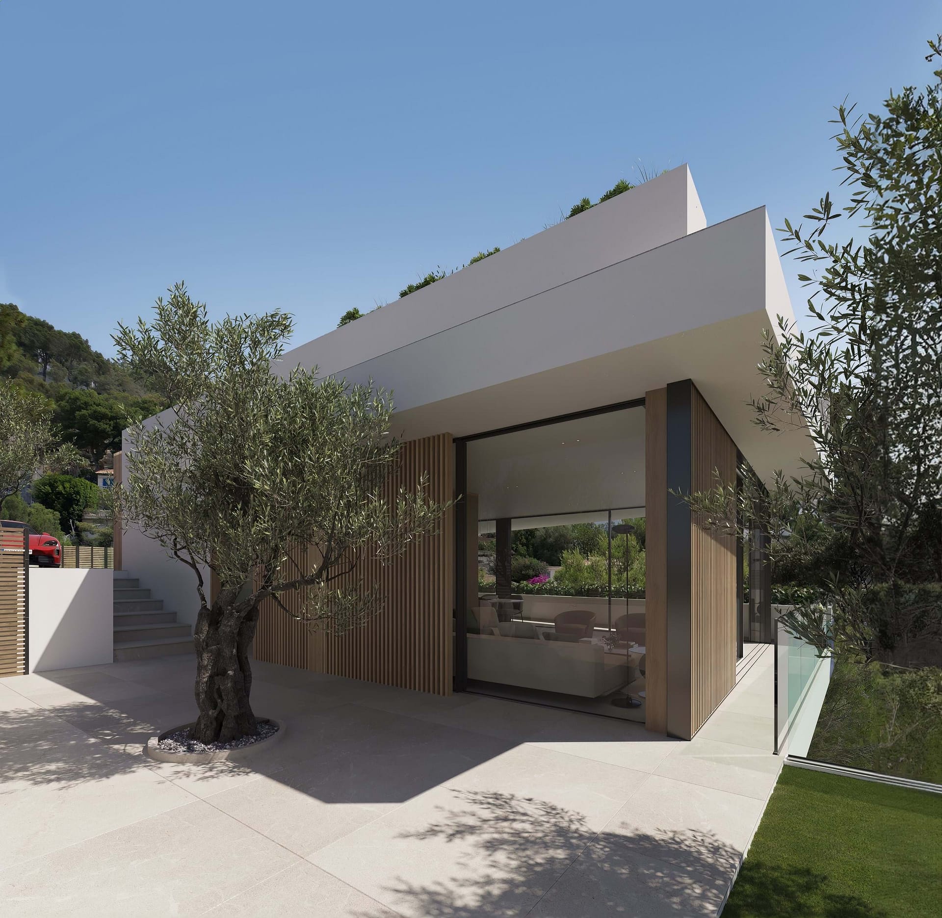 Large Horizon and Tecnal thin-framed windows flood the home with natural light and frame the panoramic coastal views. The open-plan living and kitchen area flows effortlessly onto expansive terraces and a private pool area, making it perfect for both relaxation and entertaining.