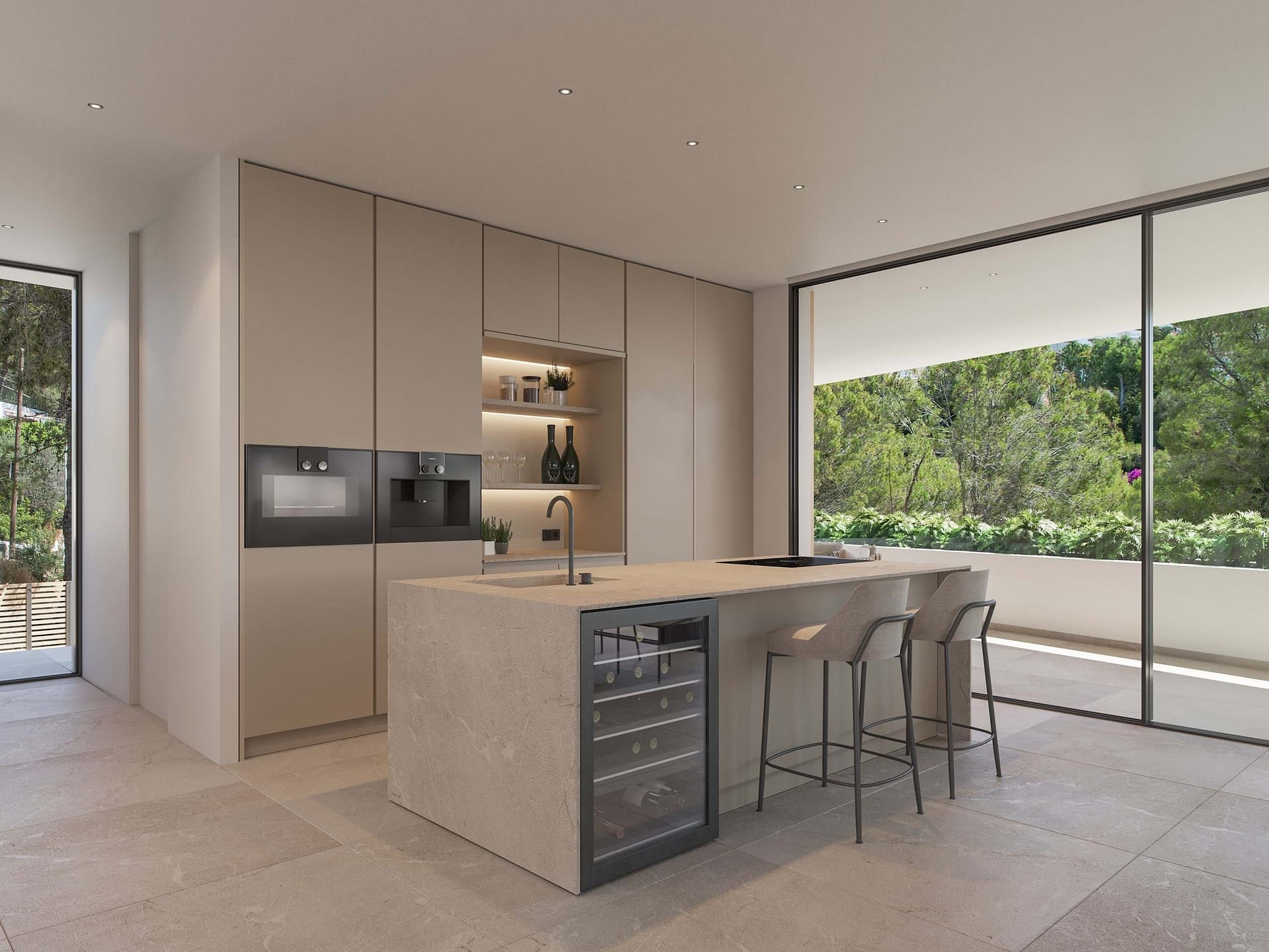The kitchen comes fully equipped with high-end Gaggenau appliances and a Quooker water system, while the bathrooms feature Porcelanosa fittings and brushed titanium faucets for a sleek, modern look. A Basalte domotic system controls the lighting and climate, and underfloor heating ensures comfort throughout the year.