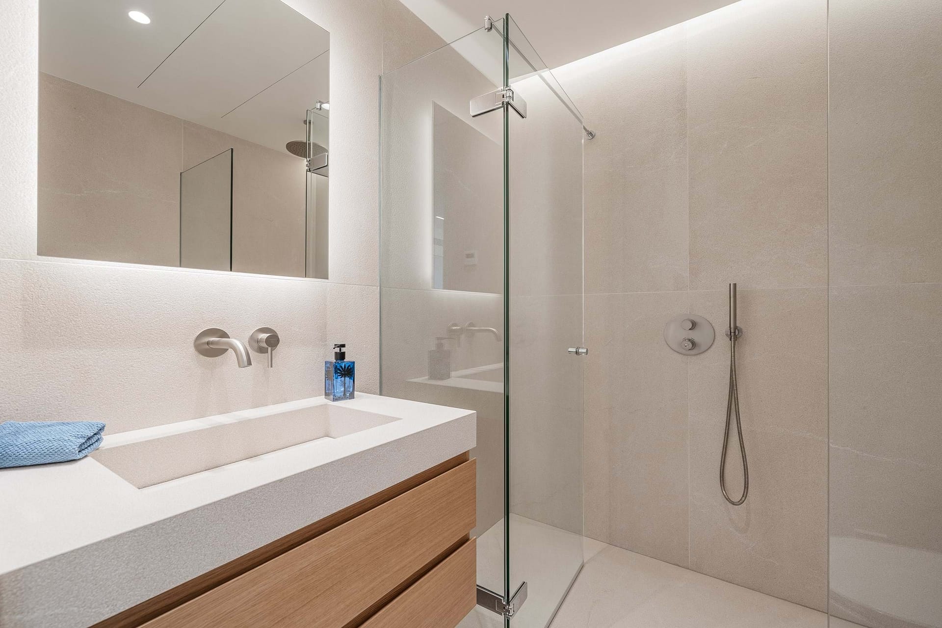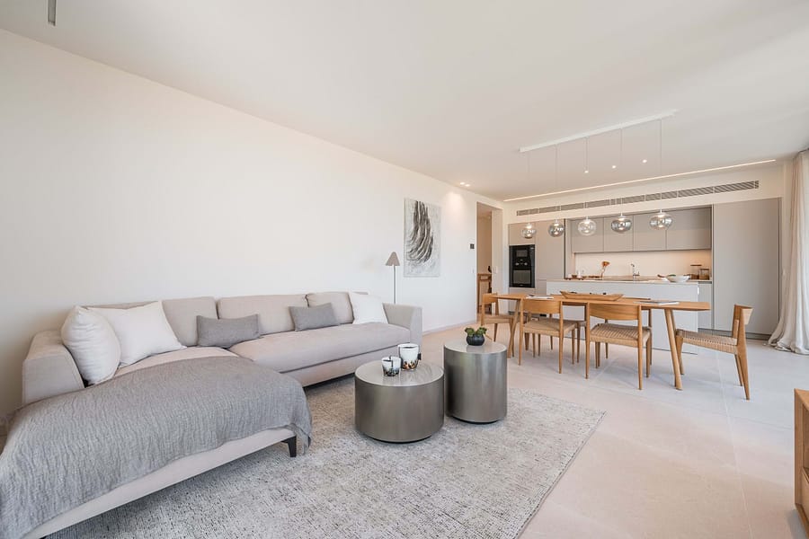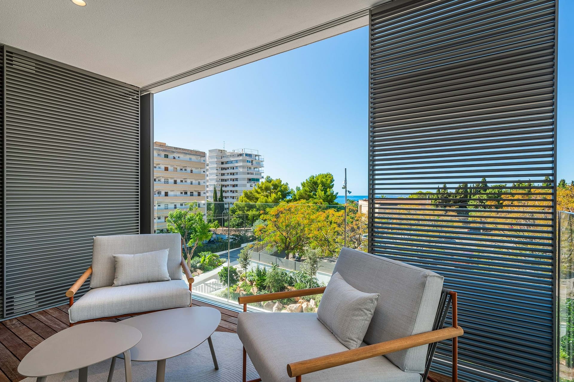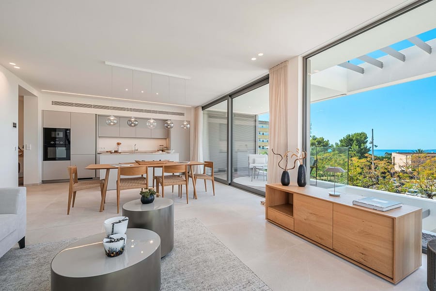 Introducing a magnificent newly developed apartment located in Mar Adalt, a high-quality residential complex situated in Palma’s Cala Major district. It’s just a 5-minute walk from the fine sandy beach and only a 10-minute drive from Palma’s city centre. The complex comes with several amenities such as underground parking, and a community pool, and is close to the chic marina of Puerto Portals, various golf courses, beaches, and international schools. The apartment is designed to provide maximum comfort and elegance, with 3 bedrooms and 2 bathrooms, 103 square meters of open-plan living and dining rooms, integrated kitchens, and a private partly covered 13-square-meter outdoor terrace. The beautiful garden area with a communal pool offers a peaceful oasis for all residents. Each unit also includes a parking space in the underground garage and a storage room. The interior design of the apartments is of the highest quality, with great importance placed on the use of high-quality materials and state-of-the-art technology. The complex is an ideal choice for those seeking a holiday property or year-round residence, thanks to its proximity to the Mediterranean Sea and easy access to Palma. The handover of the apartments is expected in the second quarter of 2024.