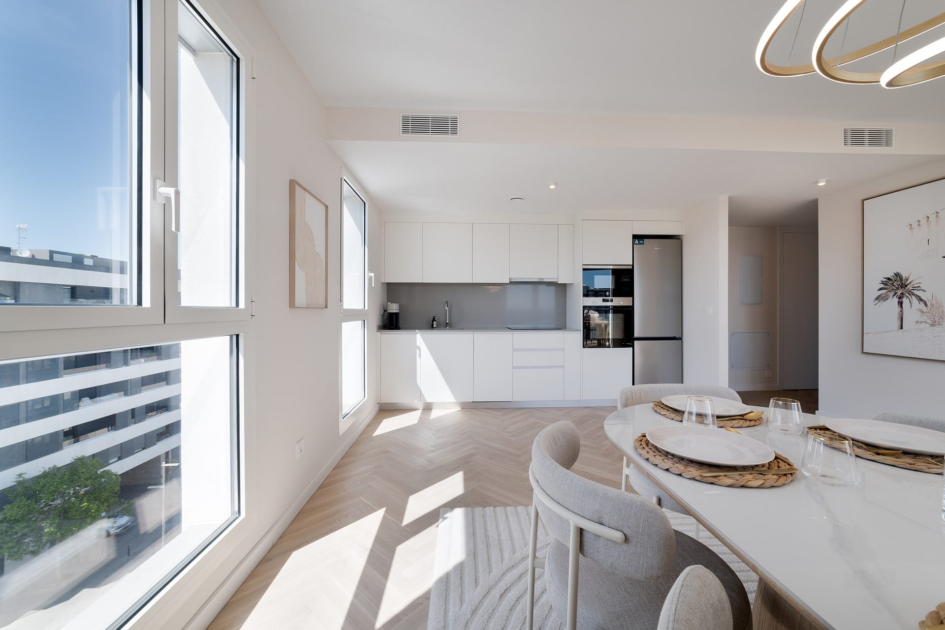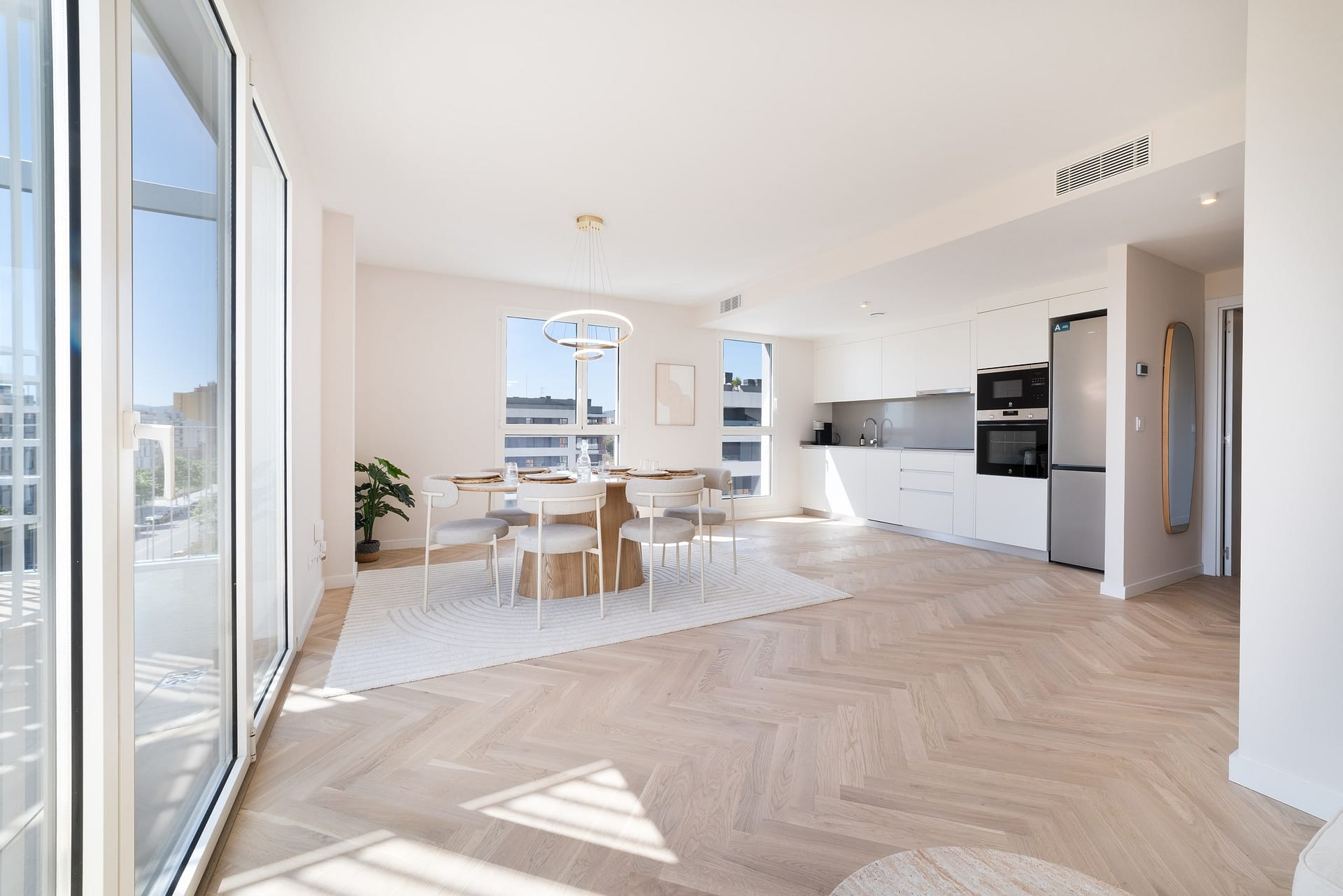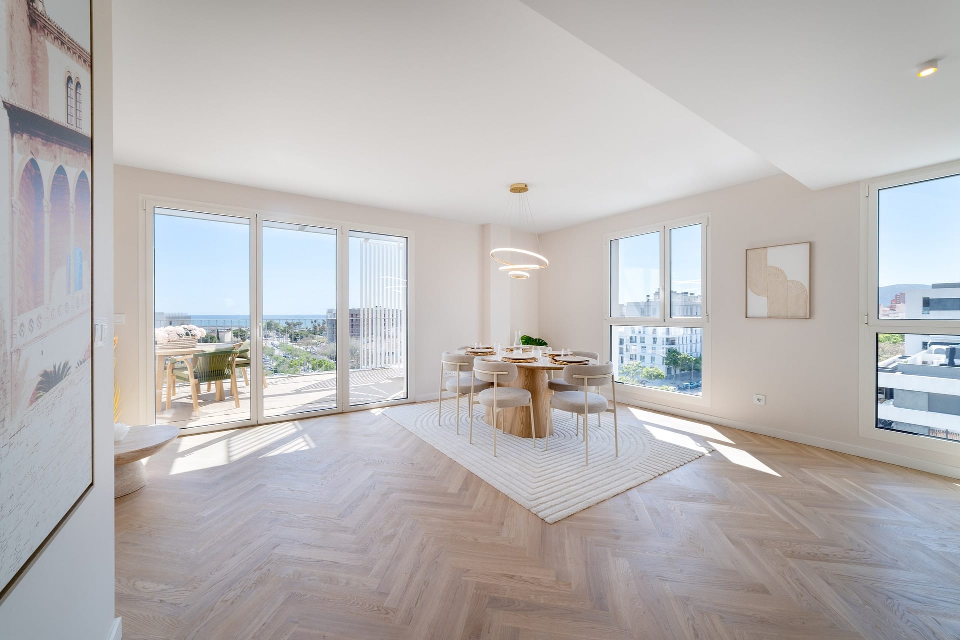 This modern apartment in Palma features three spacious bedrooms and two elegantly designed bathrooms, making it ideal for both year-round living and as a luxury second residence. The open-plan living and dining area is flooded with natural light thanks to its corner position, seamlessly connecting to a private terrace with beautiful views over the Mediterranean Sea. A fully equipped designer kitchen and high-quality hardwood flooring throughout further enhance the propertys refined, modern character.