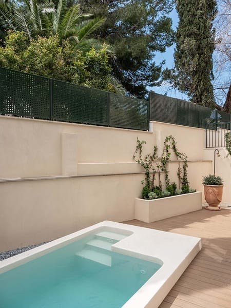 Outside, find a stunning saltwater swimming pool complemented with a convenient outdoor shower. A balcony offers additional outdoor space to enjoy the Mediterranean climate. Practical amenities include a well-equipped kitchen, a cozy fireplace, and an expansive garage with space for at least three vehicles, plus additional parking for two more. Seize this unique opportunity for elegant and relaxed living in a truly prime location.