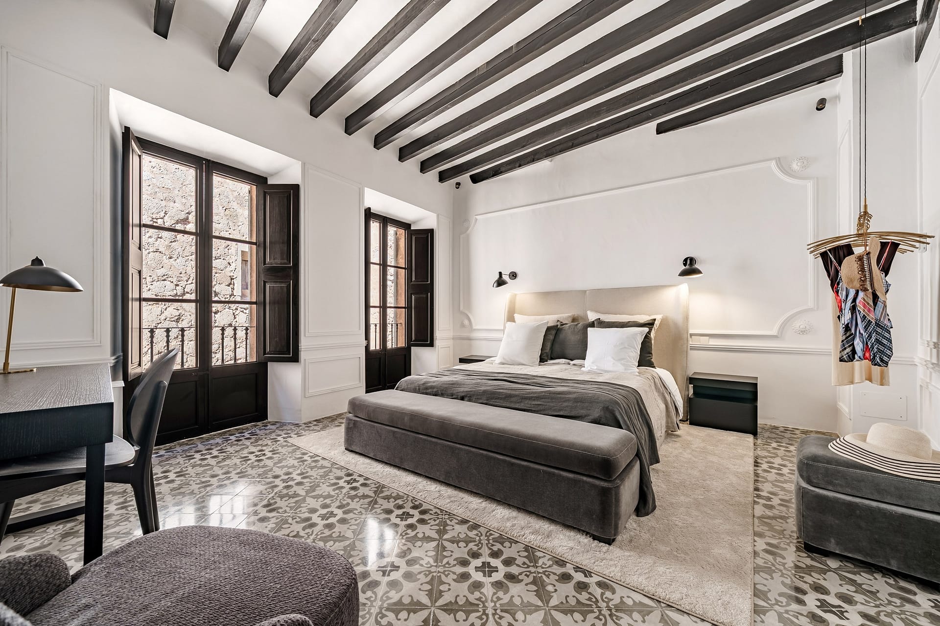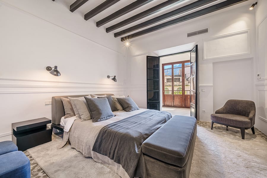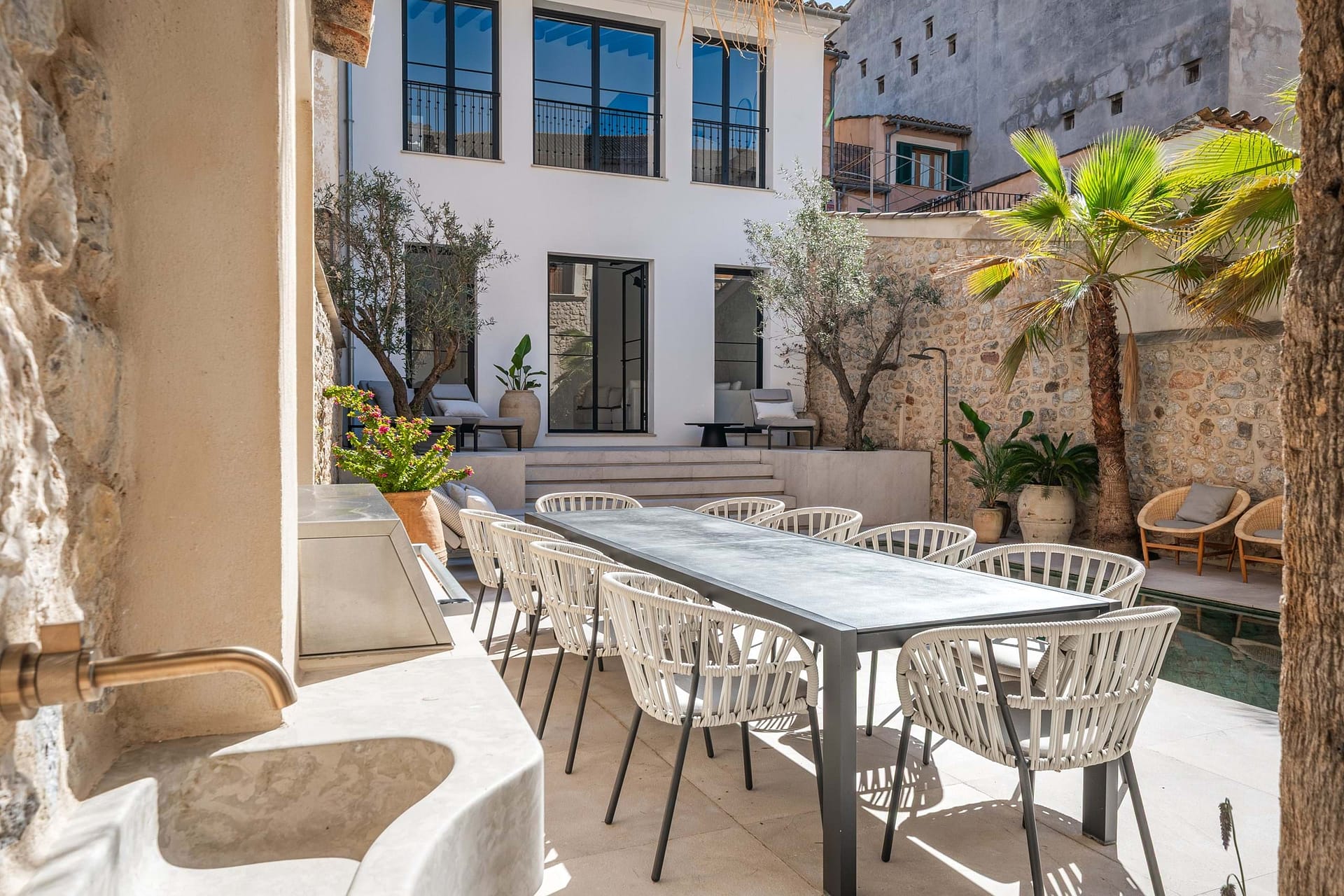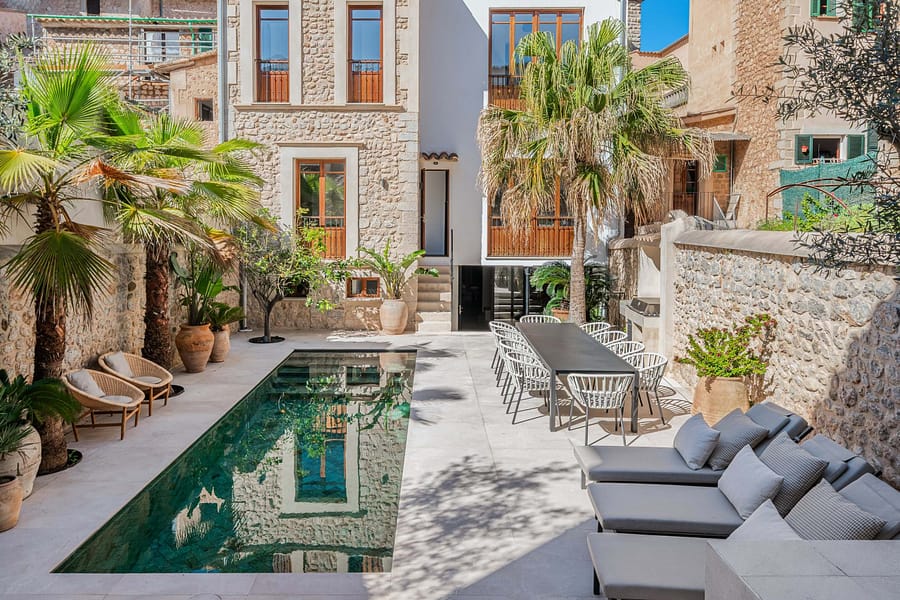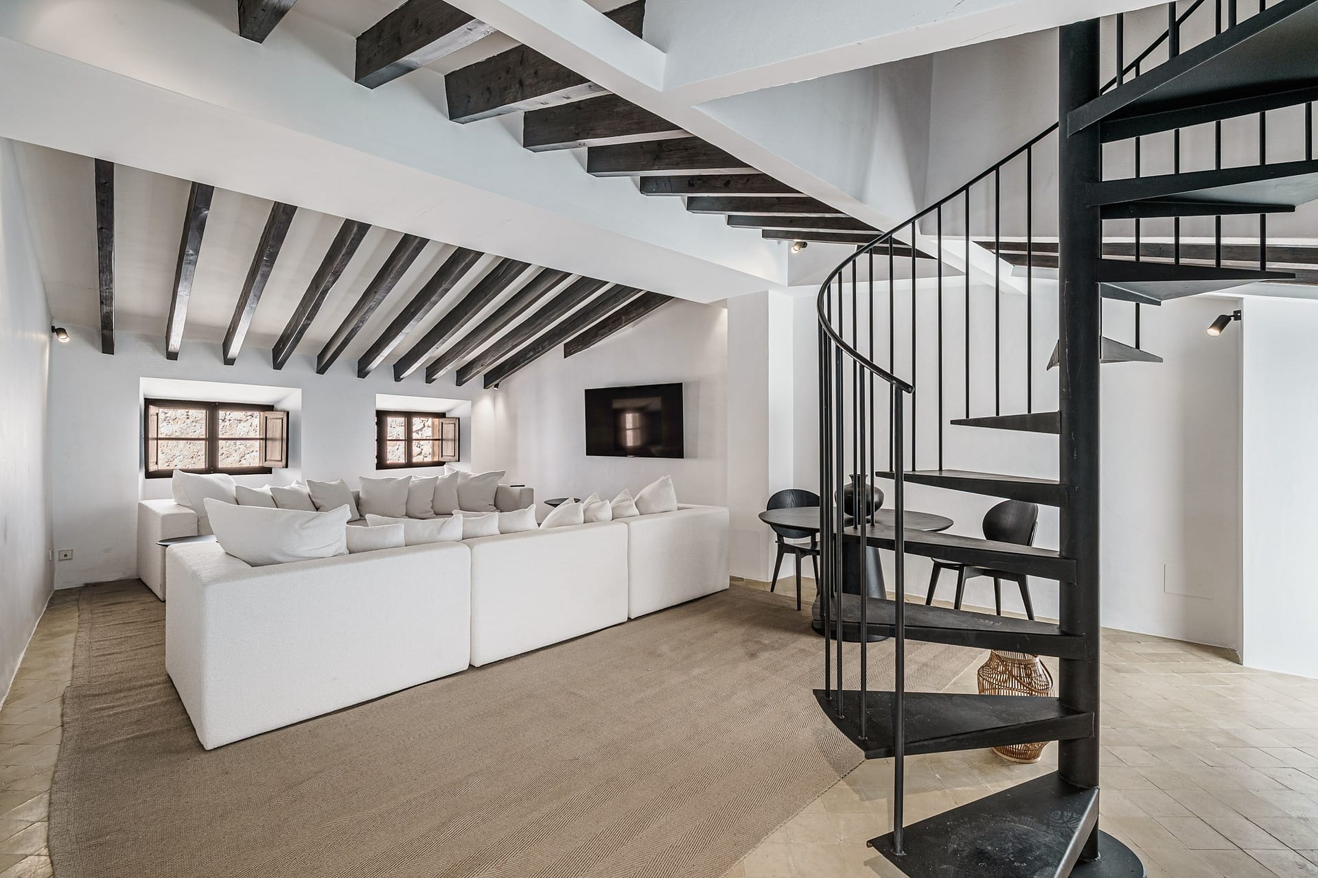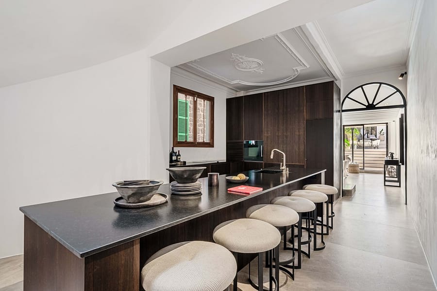 Palazzo Bartomeu in Sóller is a flawless example of late neoclassical architecture, demonstrating an impressive fusion of traditional elements with Scandinavian design elegance. The beautifully restored stone facade contrasts with the sleek, modern interiors, displaying a handcrafted Danish kitchen in smoked oak, and bathrooms with Mallorcan stone sinks. A 10-meter-high staircase with a glass dome illuminates the interior, while luxurious features like Gaggenau and Miele appliances elevate the living experience. The guest house, with its minimalist Bauhaus style, offers a refined retreat with a wine cellar, kitchen, and en-suite bedroom.