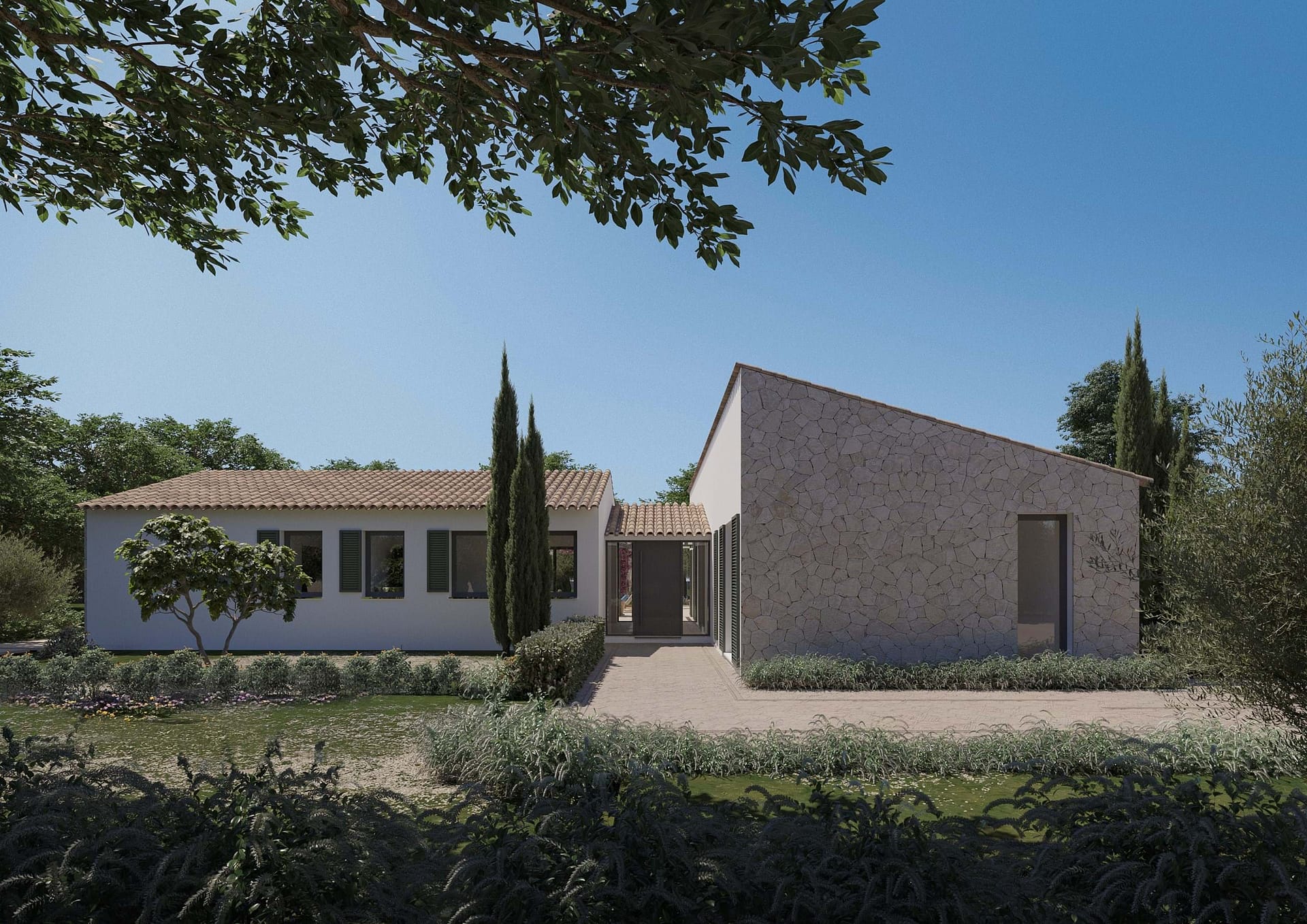 The generous 14,200 m² plot comes with a fully approved project and building license, including beautifully designed landscaping, allowing you to start building immediately. The planned residence offers approximately 414 m² of constructed area, all thoughtfully distributed on one level for effortless living. The design features three spacious en-suite bedrooms, a guest W/C, a bright open-plan living and dining area, a modern kitchen with additional storage space, and a seamless indoor-outdoor flow. Large openings lead onto expansive terraces and a private 30 m² swimming pool, perfectly designed to enjoy Mallorcas Mediterranean lifestyle all year round.