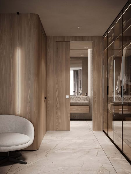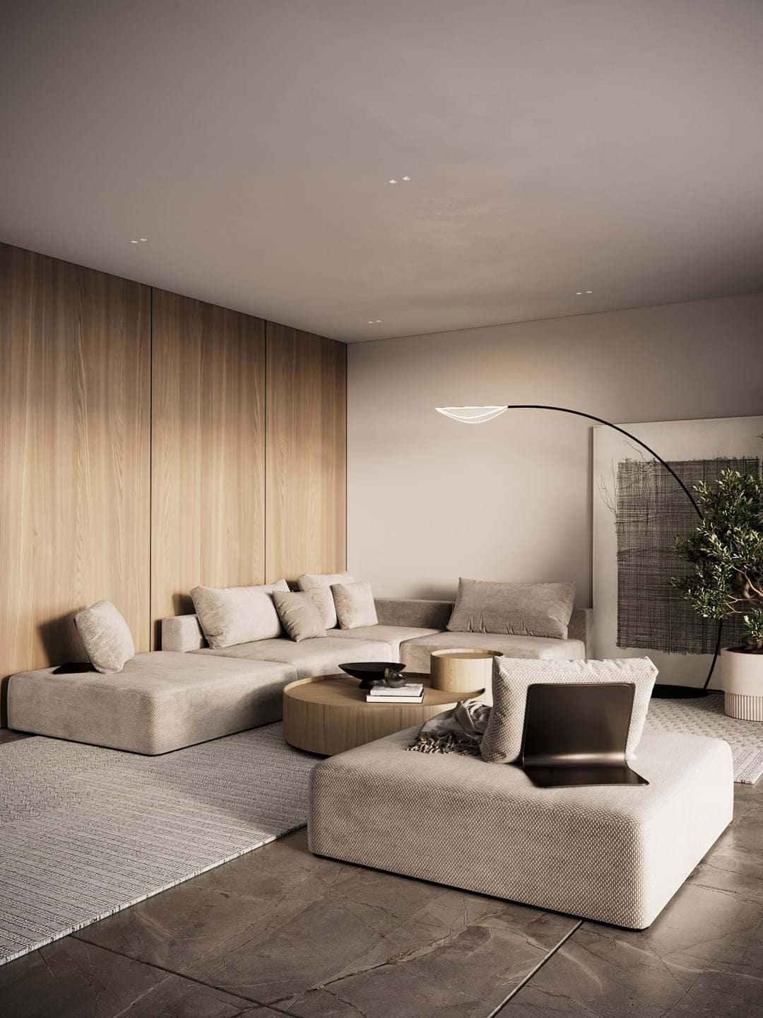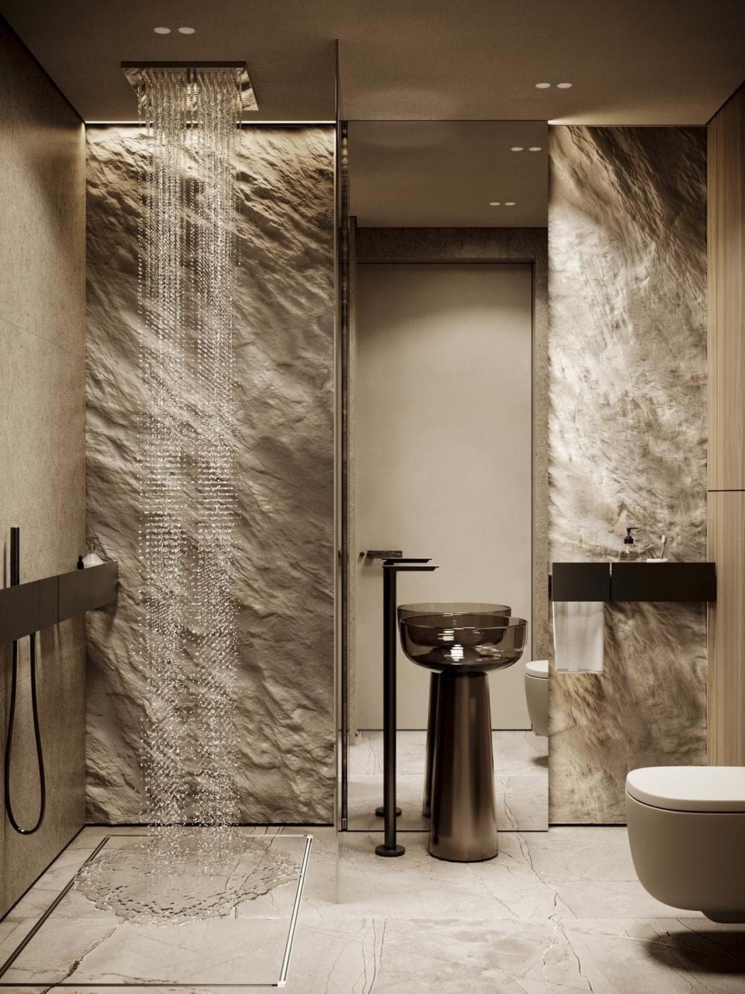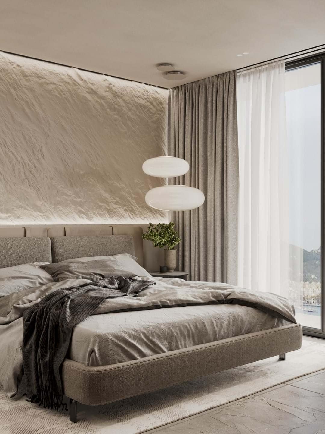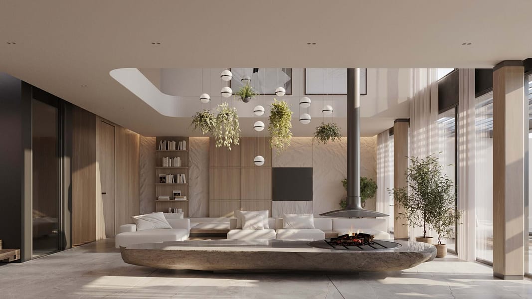 The architecture features a strong connection between indoor and outdoor spaces. Expansive glass façades open onto several terraces and patios, creating a fluid flow between living areas and the surrounding nature. The design uses natural stone, warm oak wood, and a neutral, earthy palette to create a calm and elegant atmosphere. High ceilings and a custom stone fireplace in the main living room add to the sense of warmth.