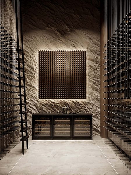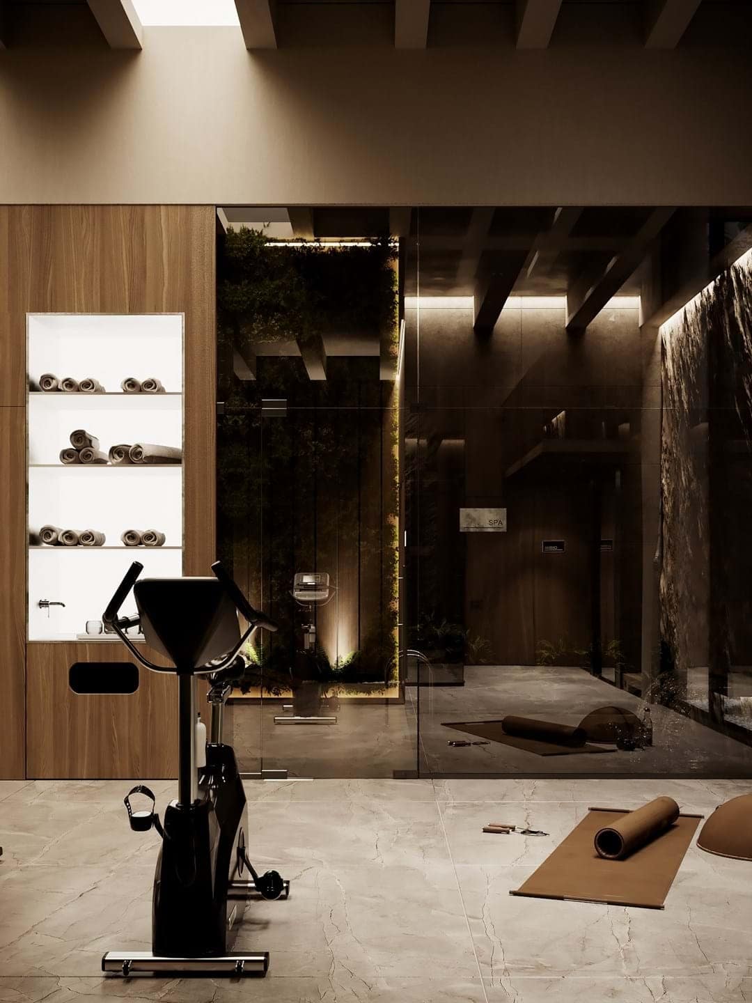 Wellness and entertainment are key elements of the project. The plans include an indoor pool, gym, sauna, massage room, private cinema, and wine cellar all located on the lower levels. A separate guesthouse with two bedrooms, its own living space, and office provides a private area for visitors or staff.