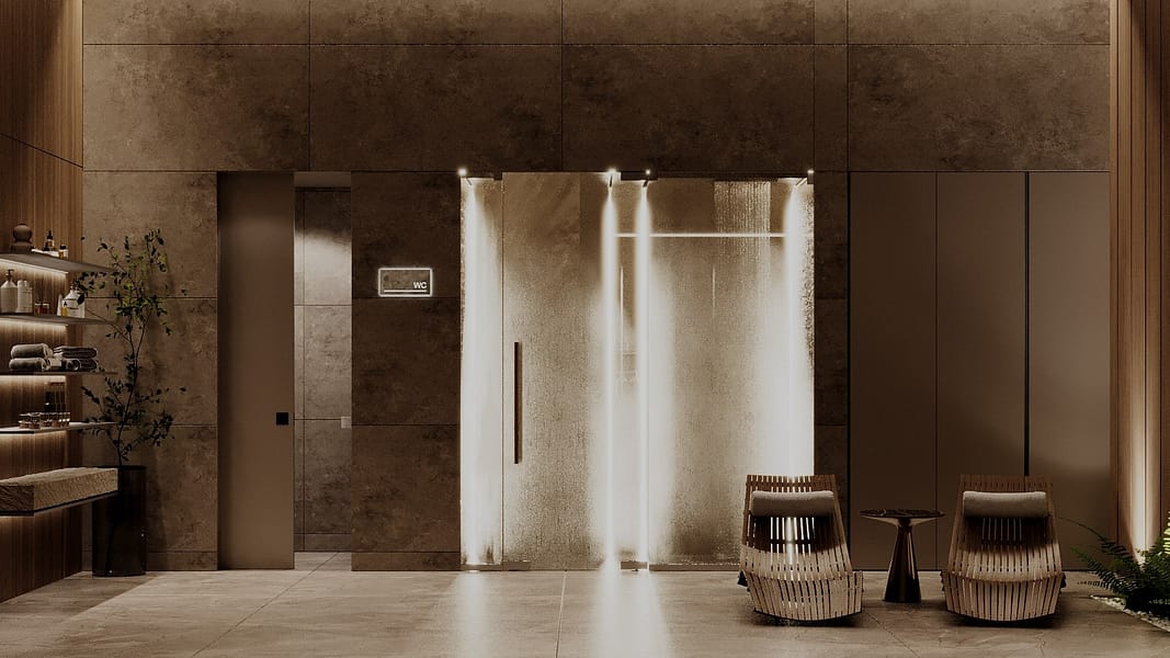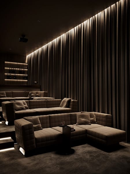 Wellness and entertainment are key elements of the project. The plans include an indoor pool, gym, sauna, massage room, private cinema, and wine cellar all located on the lower levels. A separate guesthouse with two bedrooms, its own living space, and office provides a private area for visitors or staff.