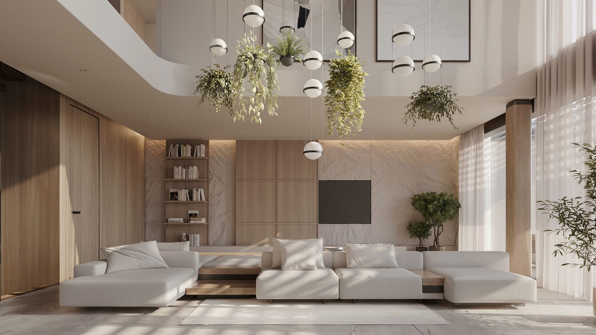 The architecture features a strong connection between indoor and outdoor spaces. Expansive glass façades open onto several terraces and patios, creating a fluid flow between living areas and the surrounding nature. The design uses natural stone, warm oak wood, and a neutral, earthy palette to create a calm and elegant atmosphere. High ceilings and a custom stone fireplace in the main living room add to the sense of warmth.