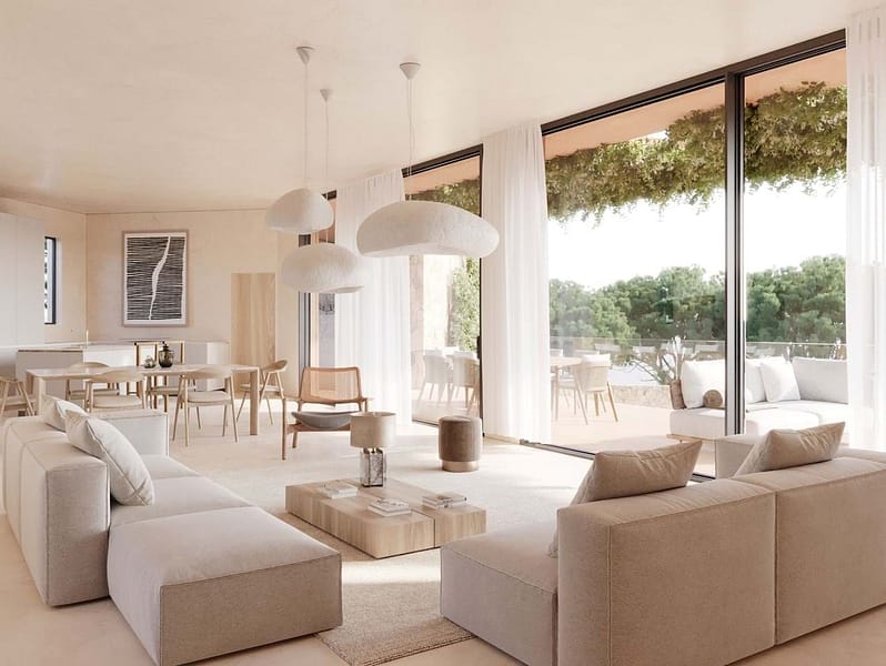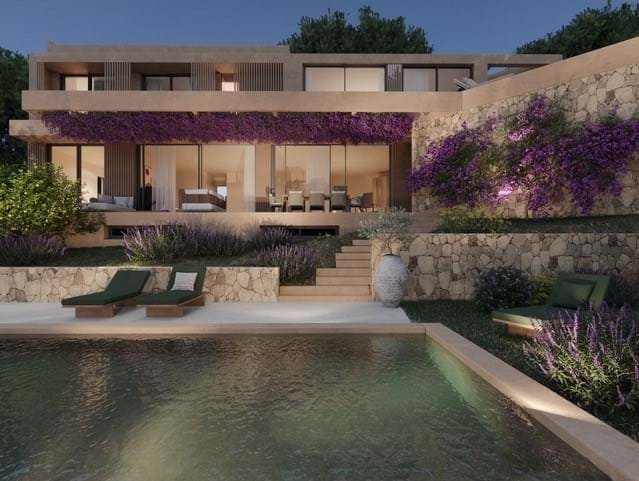 The proposed villa design features an open-plan layout on the ground floor with an interior atrium, leading out to an expansive terrace with an outdoor kitchen, a large swimming pool, and Mediterranean gardens. The project also includes a master bedroom with a private living room and terraces, and two additional en-suite bedrooms. A top-floor rooftop terrace is designed to offer breathtaking views of the Bendinat bay.